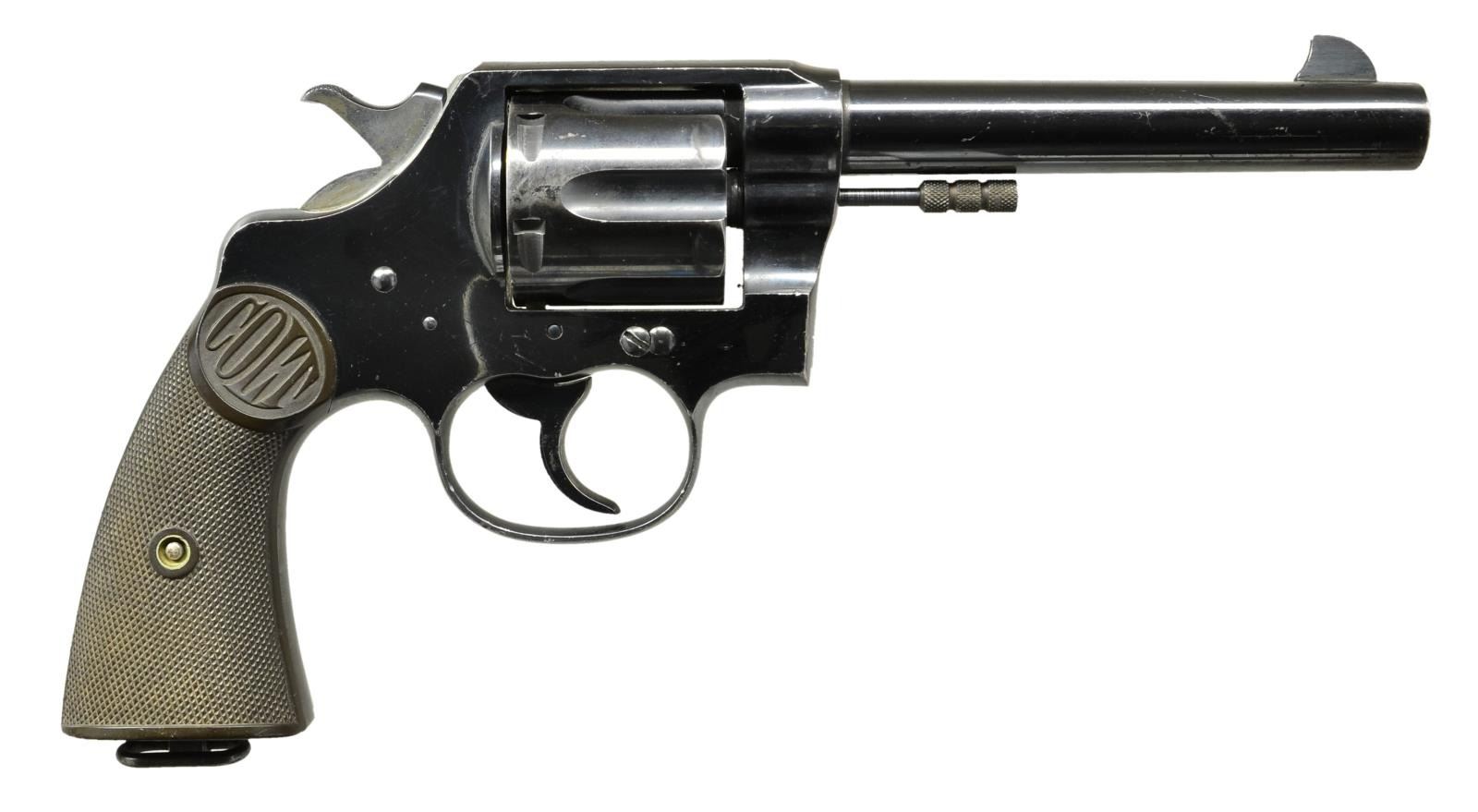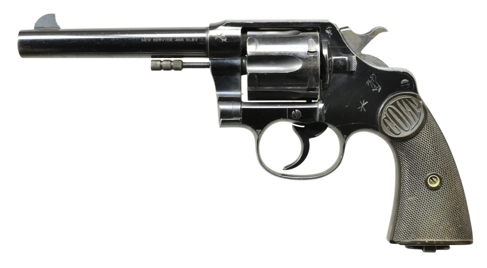 Cal. 455 Eley. S# 70670. Bbl. 5 1/2" with blade sight. Six shot fluted swing out cylinder. Left upper front and rear corners of frame and sideplate have British proof marks including 6 pointed star and cross swords. Blue finish with polished hammer sides, Lanyard ring at butt. Two piece checkered hard rubber grips. 1914 mfg. CONDITION: over 80% blue showing carry and edge wear with scattered small scratches and marks. Grip shows light wear, left panel is chipped at toe. Sound action. Bore retains sound rifling showing spots of fouling. (22-3207/DS). CURIO. $1,000-1,800.
