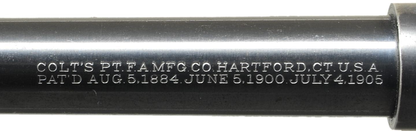 Cal. 45 ACP. S# 337164. Bbl. 5 1/2" having fin shaped (Civilian style) sight blade; 1905 last patent date & "NEW SERVICE 45 COLT" on left side. Mfg. 1933 in lot of approx. 1,000 (S# 336450-337500) using left over parts & referred to as "Model 1917 Civilian / Commercial Parts Model" by collectors. Multiple conflicting features and changes found only in this model. After 1930, walnut grips were standard; checkered hard rubber (reproductions) with Colt logo on this revolver. In 1926, that year was added to bbl. patent dates plus top strap became flattened & stippled along w/ square sight notch; this top strap is curved & plain but squared notch. Although marked "45 Colt" the cal. is 45 ACP. Checkered trigger became standard in 1929 yet has smooth faced trigger. Cyl. latch is squared & checkered model rather than rounded style adopted 1928. Lanyard loops were standard; but has 2 plain (not tapped) 1/8" holes 7/16" on center starting 1/2" from backstrap. Front hole is not at center (to rear by 1/16") of butt as lanyard loop hole would be. Ejector rod head is checkered w/ grooved band & not cross drilled. VP proof on left front of trigger guard & "3" at left rear plus "B1" on left side of frame under grip. CONDITION: very good appearance of original finish. Thinning at typical high points plus grip area. Slight peppery oxidation on some edges such as trigger guard. Sm. displacement of metal at top left rear of frame plus left edge of butt along w/ light impact mark at junction of backstrap & butt. Slight uneven fit of grips at butt plus imperfections around screw bushings. Aftermarket full threaded grip screw. Black plastic chip repair by left locating pin. Frame screws have had improper screwdriver use. Very nice proper mechanical functioning. Very good bright bore w/ appearance of leading in grooves. (22-6058/NW). CURIO. $750-1,000.