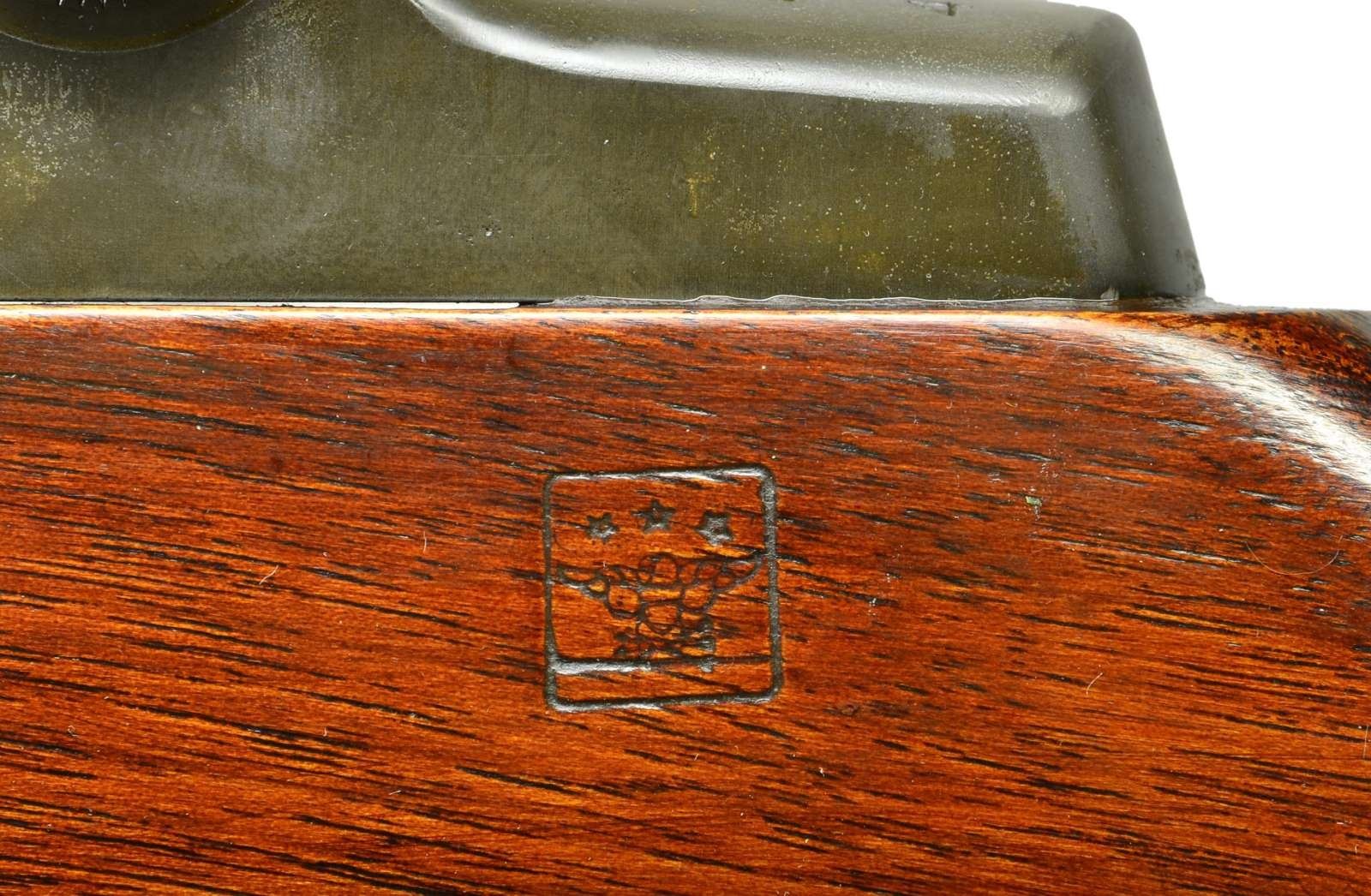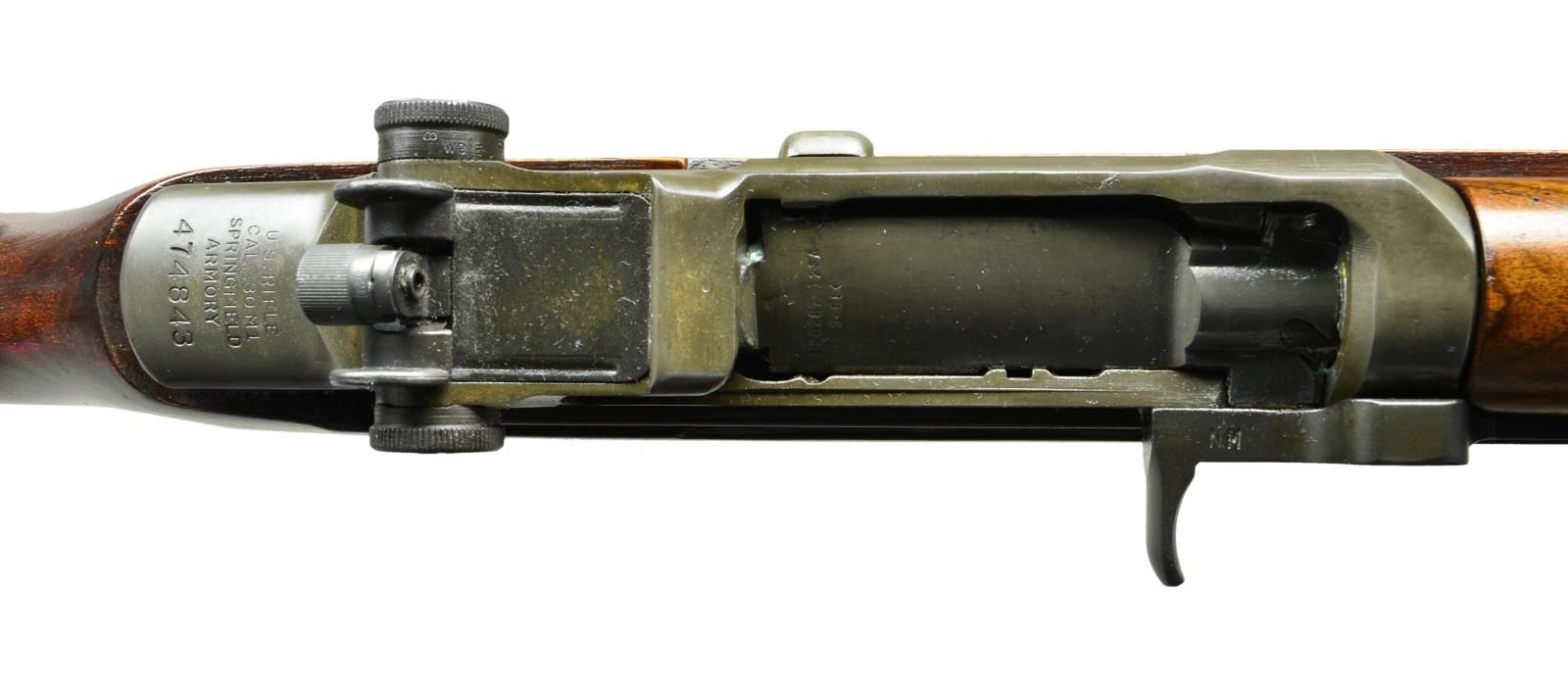MATCH RIFLE Cal. 7.62 NATO. S# 474843. Bbl. 24". Barrel marked "7.62" "SA " "SA 11010457 SPL" "6-65" and "P" with punch mark. Barrel is marked on the right front with what appears "A ?? Q". The receiver produced in 1942. Receiver marked on right front leg "LAC 10-68"in electro-pencil. Aperture rear sight. Sight base is marked "NM/2A". 1/2 minute aperture marked "NM". Windage knob marked "NM". Blade front sight marked"NM .062". Bolt marked "SA". Operating rod marked "NM" plus " 7790722-SA". Gas cylinder marked "NM" at rear. "High hump" gas cylinder lock screw. Trigger housing and parts marked "SA". Sear area shows signs of hand fitting. Steel spacer block in magazine marked "C". Walnut stock set. Buttstock marked with three star Defense Acceptance Eagle. Circle "P" proof under grip. Stock has bedding job. Stock set has original finish with added gloss leaving legible markings. Inside of barrel channel is unmarked. Rear handguard has been shortened slightly in front of receiver ring. Front handguard has been bedded tightly front and rear but screws were not used. Tan leather M1907 style sling marked " 2 81". UNATTACHED ACCESSORIES: Cleaning rod in butt. CONDITION: Stock set has light wear and scattered small handling marks. Metal retains a large percentage of original Parkerized finish with very light wear. Very good shiny bore with sharp lands. (22-5707/RW). CURIO. $2000-3000.