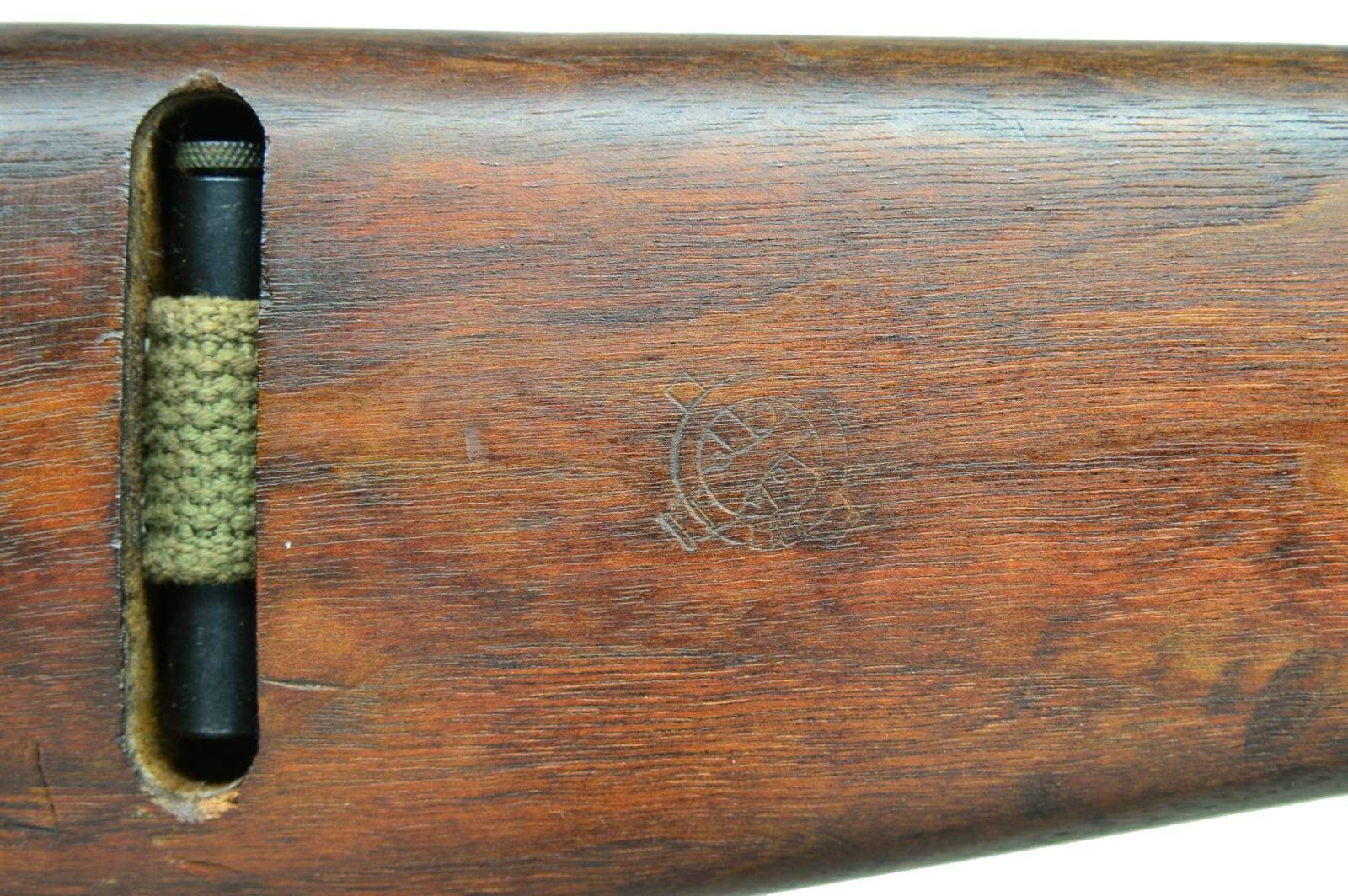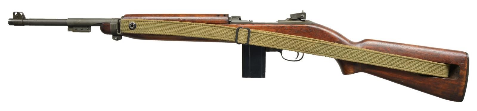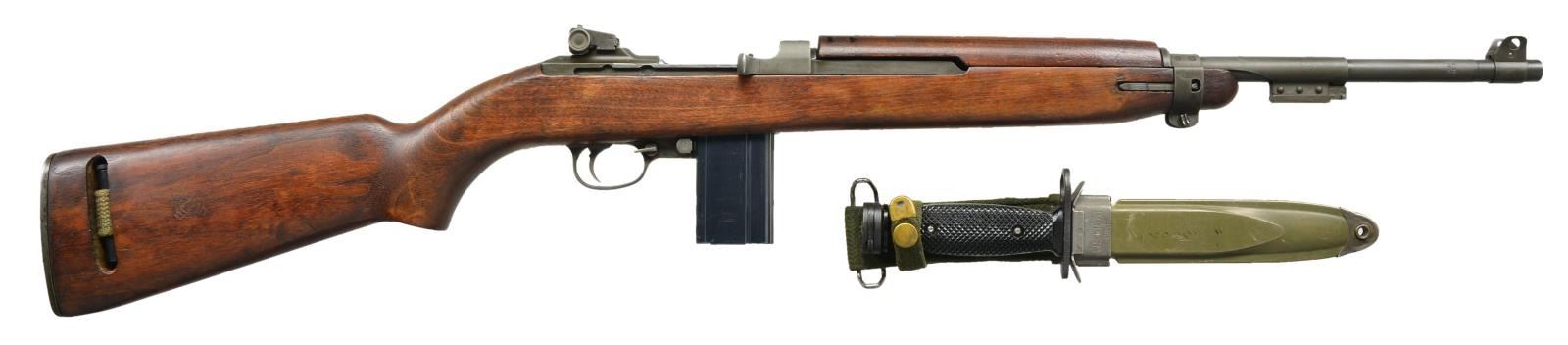 Cal. 30 Carb. S# 6630730. Bbl. 18". Barrel marked behind front sight w/ INLAND MFG. DIV. GENERAL MOTORS. Dated 11- 44. Milled adjustable rear sight marked "H.I. Blade front sight marked "N". Barrel band w/ bayonet lug marked "A.I." Straight cut slide marked " W ". Flat bolt Marked with faint "A.I.". Milled trigger housing marked "N 9'. Rotary safety. Mag. catch marked "HI". Straight cut hammer marked "W". Oval cut low wood stock marked in sling slot "IO" and marked on right side of butt with "crossed cannons". 4 rivet handguard marked "IO". Green web sling. MAGS: 1-15 rd. marked "UQ". UNATTACHED ACCESSORIES: 6 3/4" blade bayonet w/ scabbard. Bayonet marked on front of cross guard "U.S. M4 BREN-DAN.".Black checkered plastic grips. Plastic scabbard w/ belt hook marked U.S. M8A1. Metal parts have worn original parkerizing. Grips are replacements. Scabbard in good serviceable condition. CONDITION: Original finish stock set with good appearance but numerous dents and handling marks. Flames are not present at top of ordnance escutcheon. Metal retains 80% original parkerizing with light wear and handling marks. Bore shows light wear but with strong sharp lands. (22-5728/RW). CURIO. $750-1250.