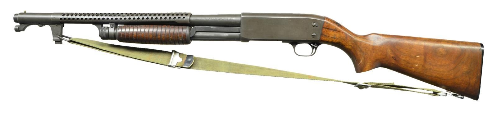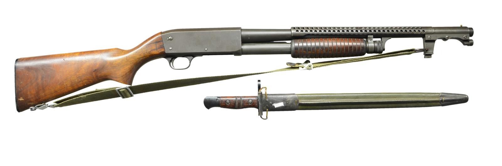 Cal. 12 Ga. S# 865819. Bbl. 20" cyl. bore. Left side of bbl. has standard 2 line marking w/o “P” proof mark. Choke marking is “MOD”. Right side of bbl. at breech has No. 2 stamped over an illegible smaller marking. Bbl., action & stock have no visible military marking. Six row handguard of reproduction style w/ brass bead. Parkerized metal finish. Top rear of receiver has hand marked “16” over scratched marking “PPD” indicating possible police use. Left side of receiver above trigger guard is stamped with S# 865819 that indicates 1963 production. This number is higher than those associated w/ South Vietnamese government contracts (50000-71999). This gun does not have the “S” prefix S# normally found on U.S. Vietnam era production. Grooved walnut pump handle & pistol grip stock w/ unmarked grooved plastic buttplate. Web sling on added commercial style rear swivel. UNATTACHED ACCESSORIES: Remington Model 1917 U.S. marked bayonet w/ scabbard. CONDITION: metal retains 70% dull parkerized finish showing substantial carry wear. Wood has dark worn finish showing scratches, marks & dents. Stock is cracked at head. Very good bore. PROVENANCE: From the Lifelong Collection of Glen E. Mattox. (23-101/DS). CURIO. $750-1,250.