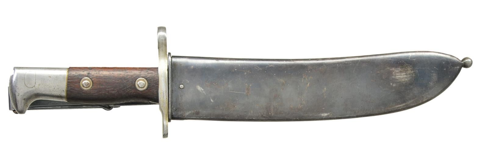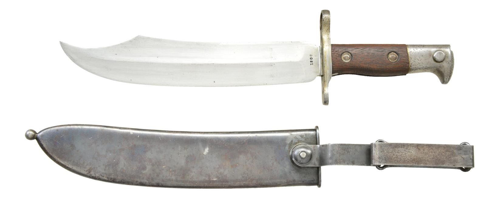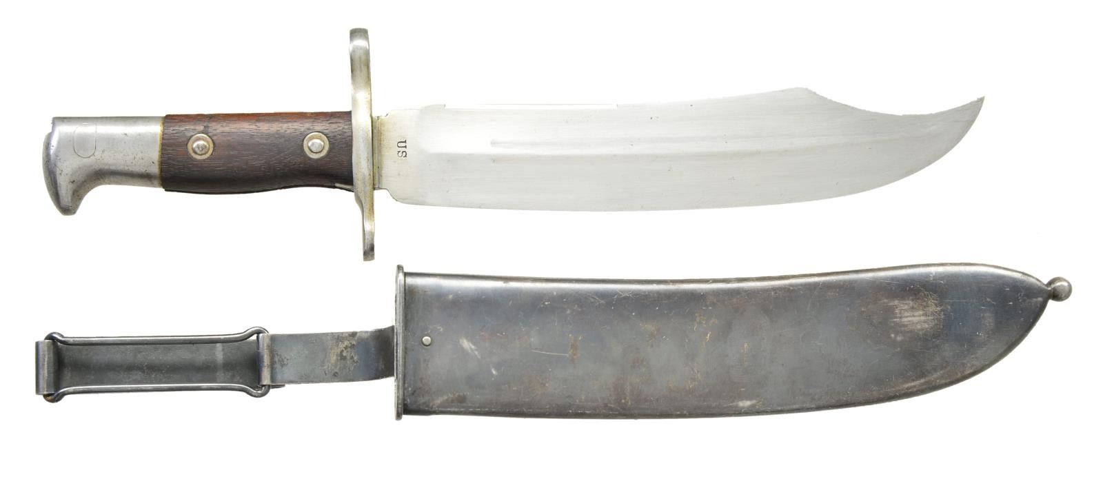 BOWIE BAYONET. 9 1/8" Bowie blade bayonet dated 1900 on left ricasso & U.S. on right ricasso. Blade is 1 3/4" wide; 1/8" thick having a clipped point & unstopped fullers. Straight cross guard w/ smooth walnut grips & birds head pommel. Curved steel scabbard w/ ball finial. Belt loop w/ wire clip & lug to limit oscillation. This rare bayonet officially named Combination Knife Bayonet & Entrenching tool was designed to be of greater use to the soldier than the lighter issue straight blade bayonet. Mfg. in 1900 for trials by authority of the Board of Ordnance and Fortifications. 2,000 were ordered from Springfield Armory of which 1,500 were sent to the Division of the Philippines & 500 to the Division of Cuba. These were tested largely for their usefulness as entrenching tools although it is reported that they also saw a very sm. amount of combat use in the Philippines during the Philippine insurrection. After extensive testing the Board of Ordnance and Fortifications did not feel that the advantages of this bayonet outweighed the disadvantages. The bayonets were recalled from the field, condemned & ordered sold. Published sources state that there may have been additional bayonets produced above the number commonly given however very few survive today. CONDITION: bayonet in very good overall condition showing light handling wear. Blade has distinct markings w/ scattered sm. spots of peppery oxidation. Very light file marks along the edge on both sides but leaving the cutting edge flat as manufactured. Balance of metal parts turning gray w/ a hint of patina & scattered peppery oxidation. Smooth walnut grips w/ only very light handling wear. Metal scabbard retains 75% original blue finish w/ thinning light wear & scattered sm. spots of oxidation. PROVENANCE: From the Lifelong Collection of Glen E. Mattox. (02-18445/RW). $2,000-3,000.