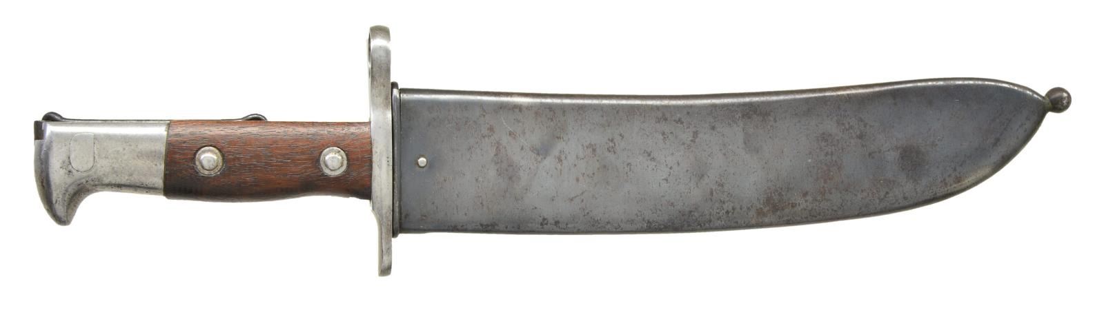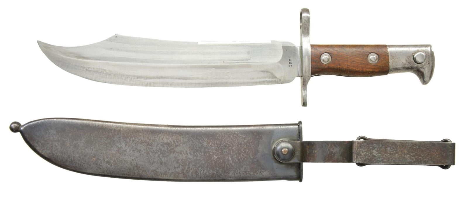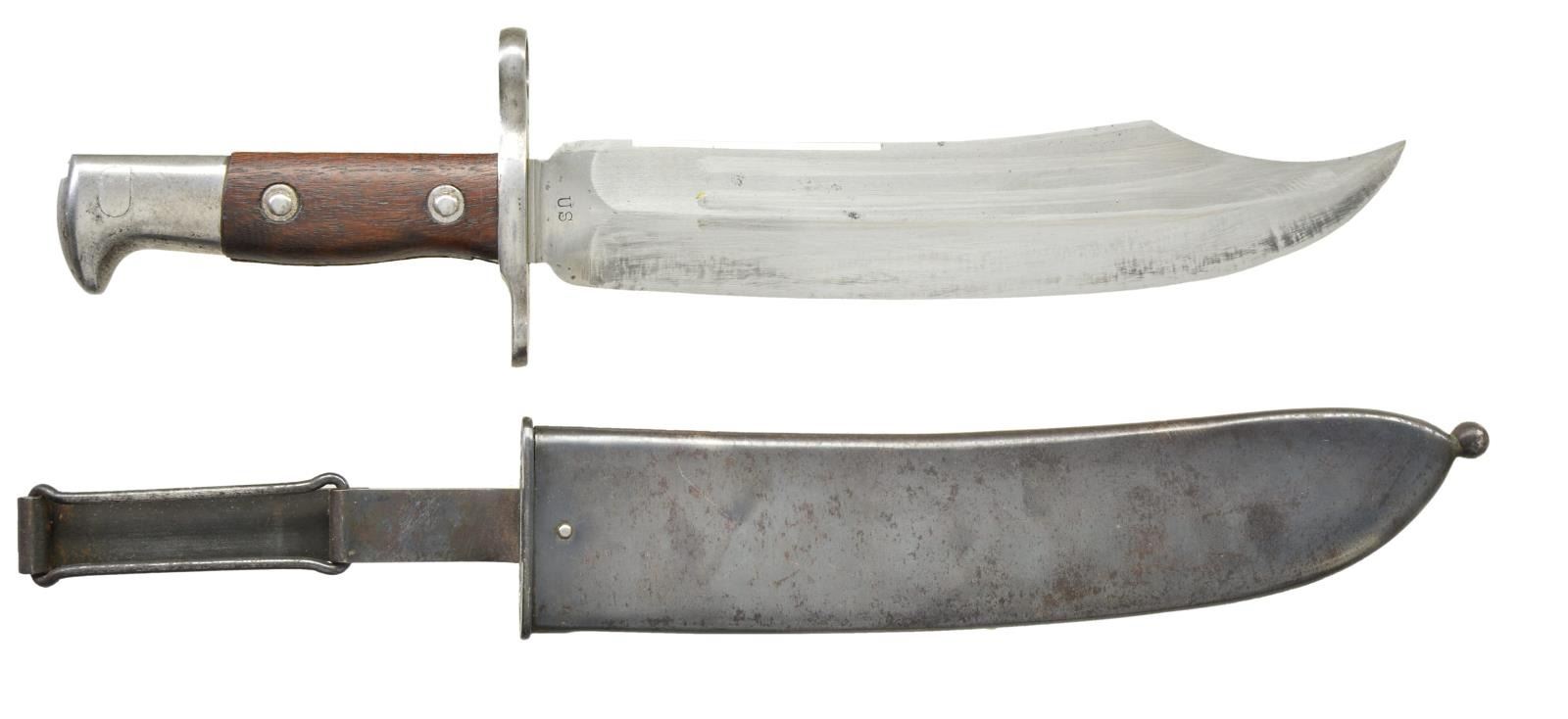 BAYONET. 9" Bowie blade bayonet. Blade is 1 3/4" wide & 1/8" thick. It has a clipped point & unstopped fullers. Marked on left ricasso "1900". Marked on right ricasso "US". Straight cross guard, Birds head pommel & smooth walnut grips. Curved steel scabbard finial. Belt loop w/ wire clip & lug to limit oscillation to 100 degrees. Commonly referred to as a Bowie bayonet it was officially named Combination Knife Bayonet & Entrenching tool. It was authorized by the Board of Ordnance and Fortifications. 2,000 were ordered of which 1,500 were sent to the Division of the Philippines and 500 to the Division of Cuba. The tests were primarily for their utility as entrenching tools although it is reported they also saw a very sm. amount of combat use in the Philippines during the insurrection. The Board of Ordnance and Fortifications did not feel after extensive testing that the advantages of this bayonet were great enough to replace the standard knife bayonet. They were recalled from the field, condemned & ordered sold. Published sources disagree on the actual number of the bayonets produced but relatively few survive today. CONDITION: bayonet in good overall condition showing light wear w/ staining & peppery oxidation. Blade has been lightly sharpened showing very fine scattered file marks. Balance of metal starting to turn gray w/ sm. areas of light oxidation & sm. handling marks. Grips in very good, lightly worn condition. Steel scabbard retains 60% original blue finish, scattered light dents plus turning patina having areas of fine oxidation. PROVENANCE: From the Lifelong Collection of Glen E. Mattox. (02-18552/RW). $1,200-1,500.