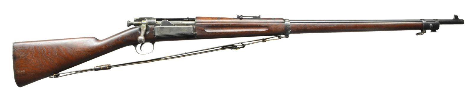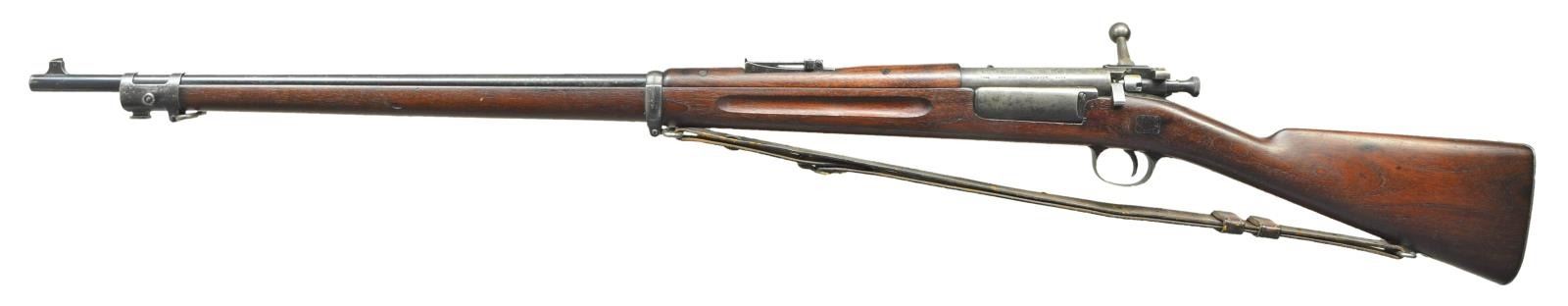 TO MODEL 1896 BOLT ACTION MILITARY RIFLE. Cal. 30-40 Krag. S# 5475. Bbl. 30". This rifle was originally produced as a Model 1892 & updated later to Model 1896 specifications. The receiver is marked on the left side "U.S. SPRINGFIELD ARMORY", "1894" & S#. 1896 Rear sight graduated to 1800 yards w/ binding screw. Blade front sight. Bolt rib has lightening cut; extractor w/ hold open pin & unmarked safety. Early type open top upper band. Walnut stock set. Stock has boxed inspection mark, "JSA 1897". Smooth trap buttplate w/ curved toe. 2 circle "P" script proofs under grip; one of which is obscured by early rework finish. Ramrod channel has been correctly filled at arsenal. Correct leather sling marked "ROCK ISLAND", "1903" & "H.E.K.". CONDITION: stock has attractive early arsenal rework finish w/ slight loss of wood in inletted areas but retaining legible markings. Stock set has very light wear & scattered handling marks. Notable dent underneath mag. cover. Metal retains 60% original blue w/ thinning light wear, fine scratches & scattered spots of oxidation. Receiver & sideplate have notable mottled coloration. Good shiny bore w/ slightly worn lands. PROVENANCE: From the Lifelong Collection of Glen E. Mattox. (01-22500/RW). ANTIQUE. $1,200-1,500.
