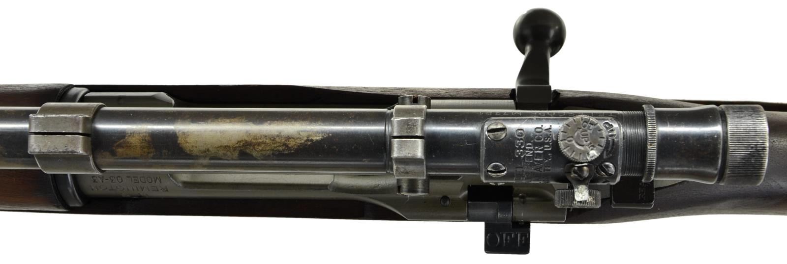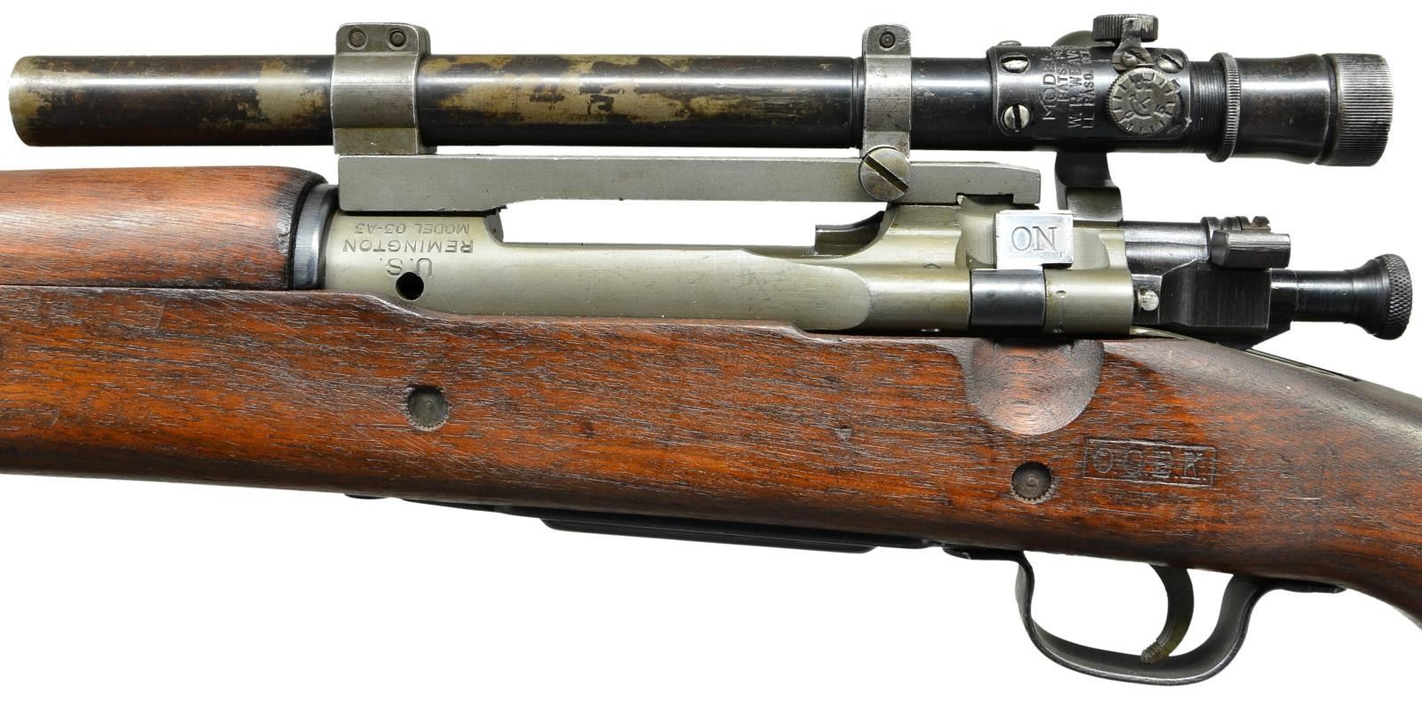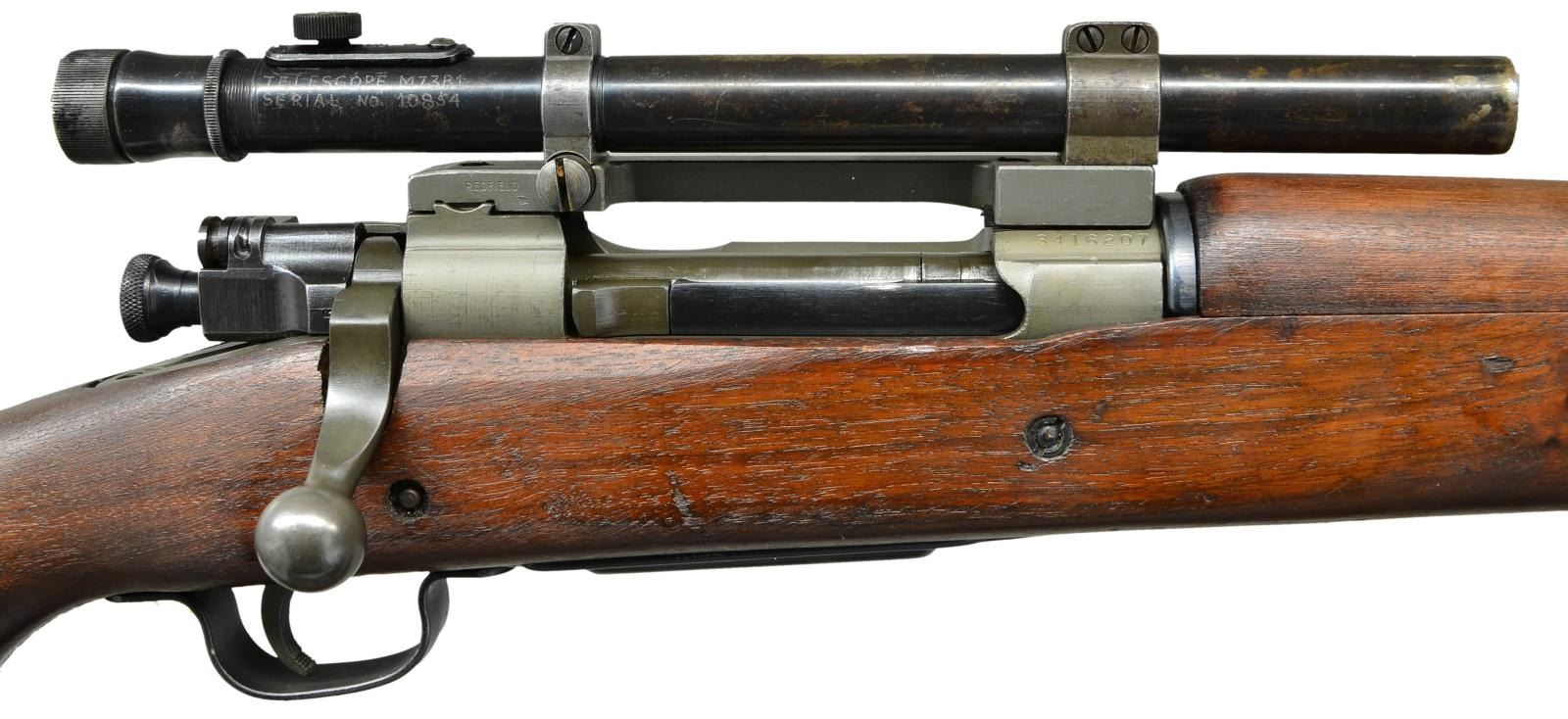 SNIPER. Cal. 30/06. S# 3416207. Bbl. 24". Two groove bbl. marked behind front sight seat. RA flaming bomb "2-44". Bbl. was never fitted with front sight which is correct for these rifles. Rifle has the correct offset receiver markings. Punch mark on receiver ring below S#. Receiver has the correct bevel on right side behind bridge for bolt handle clearance. The clearance cut in the stock however was not done with arsenal type milling cutters. The cut appears to be done by hobbyist gunsmith workmanship using a gouge. Receiver drilled on top for Redfield Jr. 1 piece scope base which is fitted to rifle using 2 metal shims over the receiver ring. Base has the correct bevel at rear. Mounting screws have been staked at ends of screw slots. Base fitted w/ 7/8" rings to accommodate the telescopic sight. The scope is marked on top "MODEL 330 PATS.PEND.W.R. WEAVER CO. EL PASO, TEX., U.S.A.". Marked on right rear "TELESCOPE M73B1 SERIAL NO. 10854". Scope reticle is fine crosshair. Receiver bbl. & scope mt. have greenish Parkerized finish. Replacement “R” marked bolt is correct type but w/ Parkerized instead of blued finish. Blue bolt shroud, safety & cutoff are marked "R". All stamped furniture. Parkerized upper band marked "R". Balance of furniture is blued including sm. bow trigger guard & fine checkered trap buttplate. Replacement walnut stock set w/ late type full pistol grip. Stock is marked on left side over the trigger guard w/ boxed “OGEK”. This form of inspection mark was used at the Ogden Utah Arsenal by the well known firearms authority, Elmer Keith, who worked at that arsenal during WWII. Marked on left side of butt w/ boxed "RIA" & "EB" as a likely arsenal check & test. Marked underneath pistol grip w/ encircled "P"proof approx. 1/2" in diameter. End of pistol grip has circled “P” proof approx. 3/8" in diameter. Stock tip is marked w/ “5”. Stock fitted w/ 2 recoil bolts. Stock is marked underneath at toe "76". UNATTACHED ACCESSORIES: plastic oiler & butt. Brown leather scope caps w/ integral retaining strap. CONDITION: Stock set has nice appearance w/ crisp markings, scattered scratches & handling marks. Large circular approx. 3/4" diameter; repair on bottom right side of butt. Forward end of handguard has 3 brass reinforcing pins w/ faint trace of crack. Parkerized parts retain a high degree of finish showing very little wear. Bolt body has more notably thin finish. Blue furniture has very light wear. Telescope & scope rings have notable thin finish w/ wear & scattered fine scratches. Notable wear at objective end of scope. Near excellent shiny bore. (23-486/RW). CURIO. $2,500-3,500.