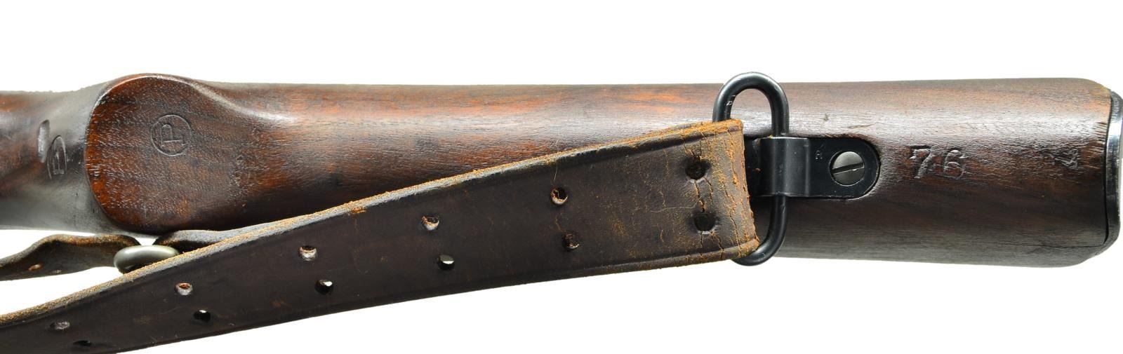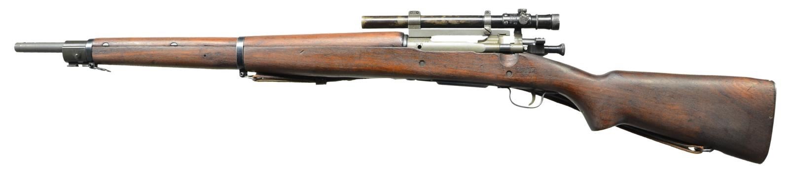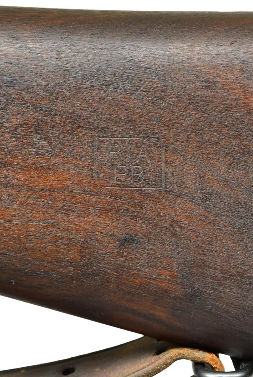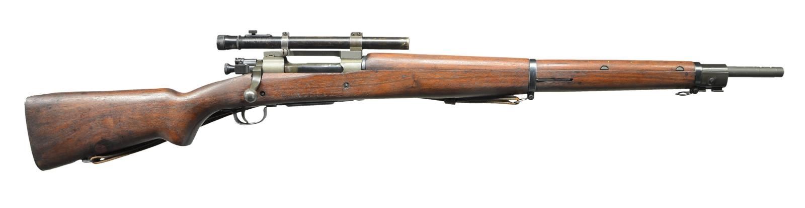 SNIPER. Cal. 30/06. S# 3416207. Bbl. 24". Two groove bbl. marked behind front sight seat. RA flaming bomb "2-44". Bbl. was never fitted with front sight which is correct for these rifles. Rifle has the correct offset receiver markings. Punch mark on receiver ring below S#. Receiver has the correct bevel on right side behind bridge for bolt handle clearance. The clearance cut in the stock however was not done with arsenal type milling cutters. The cut appears to be done by hobbyist gunsmith workmanship using a gouge. Receiver drilled on top for Redfield Jr. 1 piece scope base which is fitted to rifle using 2 metal shims over the receiver ring. Base has the correct bevel at rear. Mounting screws have been staked at ends of screw slots. Base fitted w/ 7/8" rings to accommodate the telescopic sight. The scope is marked on top "MODEL 330 PATS.PEND.W.R. WEAVER CO. EL PASO, TEX., U.S.A.". Marked on right rear "TELESCOPE M73B1 SERIAL NO. 10854". Scope reticle is fine crosshair. Receiver bbl. & scope mt. have greenish Parkerized finish. Replacement “R” marked bolt is correct type but w/ Parkerized instead of blued finish. Blue bolt shroud, safety & cutoff are marked "R". All stamped furniture. Parkerized upper band marked "R". Balance of furniture is blued including sm. bow trigger guard & fine checkered trap buttplate. Replacement walnut stock set w/ late type full pistol grip. Stock is marked on left side over the trigger guard w/ boxed “OGEK”. This form of inspection mark was used at the Ogden Utah Arsenal by the well known firearms authority, Elmer Keith, who worked at that arsenal during WWII. Marked on left side of butt w/ boxed "RIA" & "EB" as a likely arsenal check & test. Marked underneath pistol grip w/ encircled "P"proof approx. 1/2" in diameter. End of pistol grip has circled “P” proof approx. 3/8" in diameter. Stock tip is marked w/ “5”. Stock fitted w/ 2 recoil bolts. Stock is marked underneath at toe "76". UNATTACHED ACCESSORIES: plastic oiler & butt. Brown leather scope caps w/ integral retaining strap. CONDITION: Stock set has nice appearance w/ crisp markings, scattered scratches & handling marks. Large circular approx. 3/4" diameter; repair on bottom right side of butt. Forward end of handguard has 3 brass reinforcing pins w/ faint trace of crack. Parkerized parts retain a high degree of finish showing very little wear. Bolt body has more notably thin finish. Blue furniture has very light wear. Telescope & scope rings have notable thin finish w/ wear & scattered fine scratches. Notable wear at objective end of scope. Near excellent shiny bore. (23-486/RW). CURIO. $2,500-3,500.