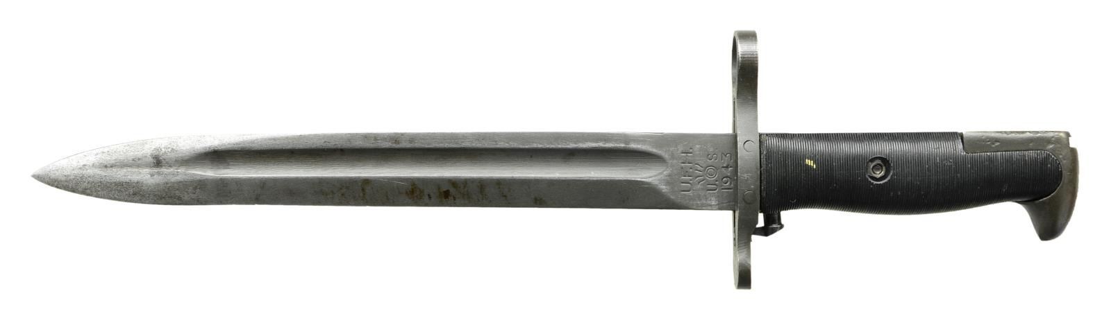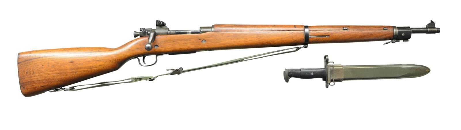 MILITARY RIFLE. Cal. 30-06. S# 3585306. Bbl. 24" marked behind front sight "RA" flaming bomb "4-43". Adjustable aperture rear sight; blade front sight. Bolt, bolt shroud & safety marked "R". Cocking piece marked "1". All stamped furniture except milled smooth trap buttplate. Sm. bow trigger guard. Unmarked stamped grip; walnut stock set. Green web sling. UNATTACHED ACCESSORIES: 9 3/4" fullered blade M1 bayonet marked on left ricasso w/ "U.F.H.", flaming bomb, "U.S.", "1943". Ribbed plastic grips; "US" marked green plastic scabbard. Bayonet retains 50% worn original parkerized finish. Blade has been sharpened. Grips have moderate wear & handling marks. CONDITION: stock set has arsenal rework type finish w/ light wear & scattered handling marks. Metal has 70% original parkerized finish w/ thinning wear & handling marks. Stamped parts are a mix of blue & parkerized. Stacking swivel band does not fit correctly. Very good shiny, 2 groove bore. (23-519/RW).CURIO. $700-1,000.