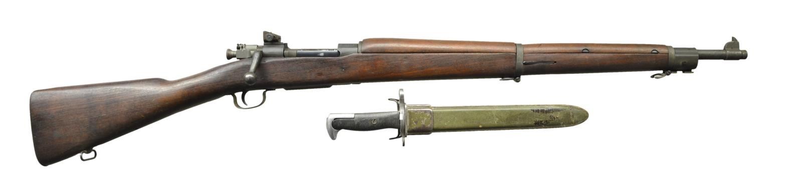 Cal. 30-06. S# 3702089. Bbl. 24”. Bbl is marked behind front sight “SC” “flaming bomb” & “5-43”. Adj. aperture rear sight. Blade front sight. Bolt & bolt shroud marked “R”. All stamped furniture including small bow trigger guard. Fine checkered milled steel buttplate. Walnut stock set w/ reinforcing pins. Stock is marked w/ circle “P” proof under grip. Forend has approx. 1 1/4” circular wood plug forward of trigger guard likely done to salvage otherwise serviceable stock. UNATTACHED ACCESSORIES: 9 3/4” fullered blade bayonet. Bayonet is shortened model 1942 w/ notably coarse grinding marks. Marked on left ricasso “U.S.” “flaming bomb” “U.C.” “1943”. Right ricasso has partial “crossed cannons”. Black plastic ribbed grips. Bayonet catch thumb piece is not present. Green plastic scabbard w/ belt hook marked with faint “flaming bomb”. Bayonet has well-worn finish turning gray w/ areas of oxidation. Grips have wear & handling marks. Left grip has notable crack in rear portion. Worn scabbard w/ flaking green finish. CONDITION: stock set has light wear staining & handling marks throughout. Metal retains 75% arsenal rework parkerization w/ wear & scratches. Very good shiny four-groove bore. (22-5876/RW). CURIO. $700-1000.