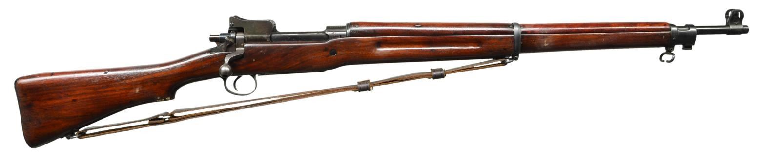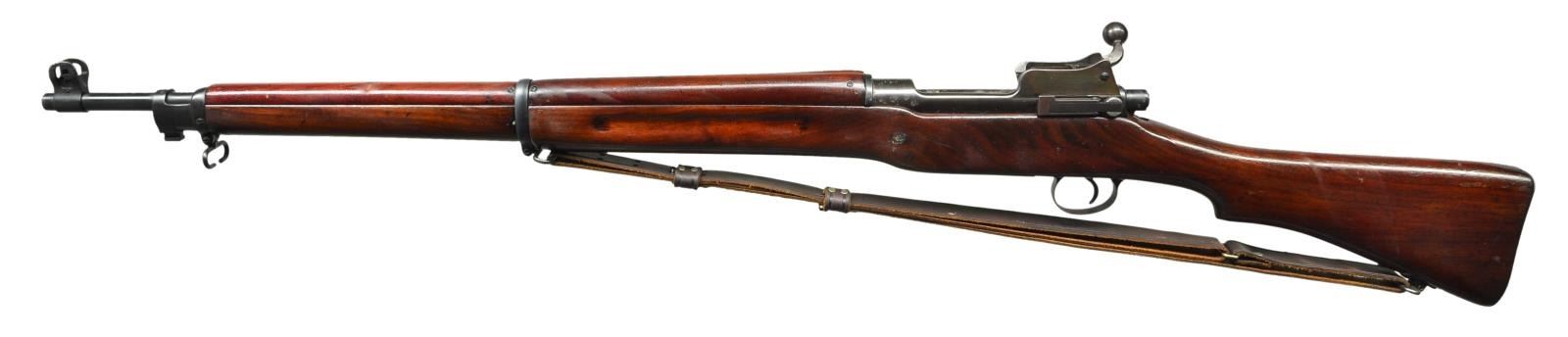 RIFLE. Cal. 30-06. S# 233072. Bbl. 26". Marked behind front sight “W” “flaming bomb” “3/18”. Ladder aperture rear sight graduated to 1600 yards. Slide is marked “W”. Blade front sight w/ protective ears. Left receiver rail marked w/ “flaming bomb”. Bolt handle is marked “B” “flaming bomb”. Bolt sleeve is marked “E”. Unmarked walnut stock set. Stock marked with faint “W” at forend tip. 1” military style brown leather sling. CONDITION: stock set has arsenal rework finish w/ added finish & loss of wood in inletted areas & at grasping grooves. Stock has moderate wear & handling marks throughout. Metal retains 80% arsenal rework blue finish w/ areas of wear, oxidation & fine pitting. Receiver has notable plum coloration. Good bore w/ lightly worn lands. (22-5502/RW). CURIO. $300-450.