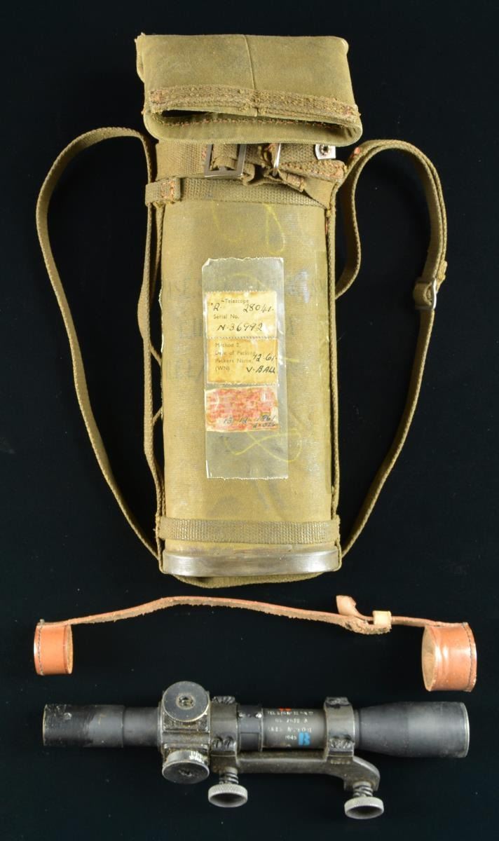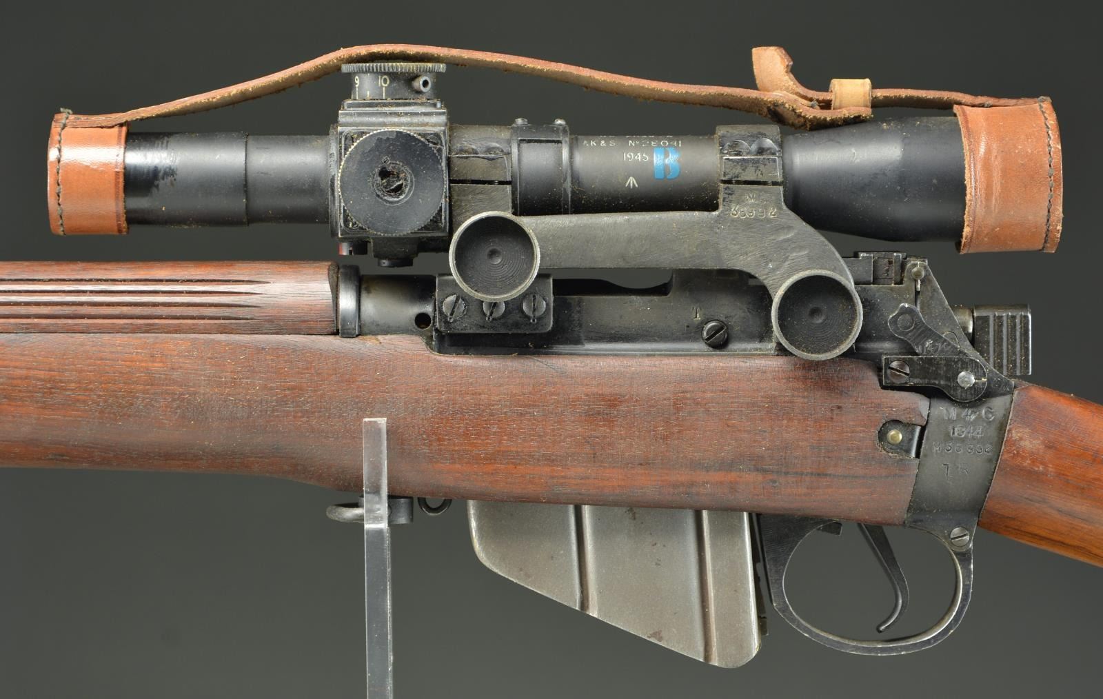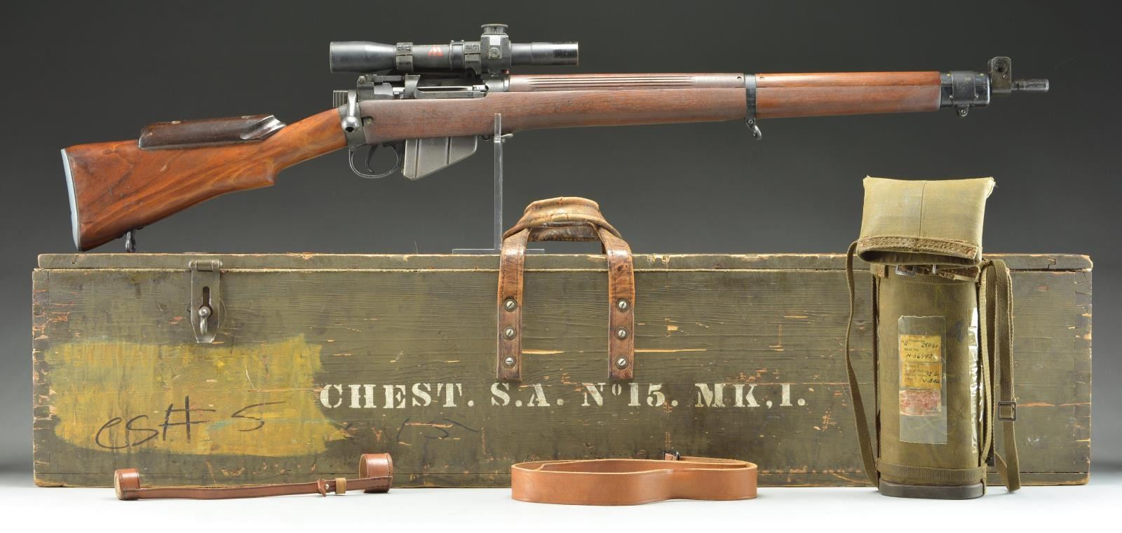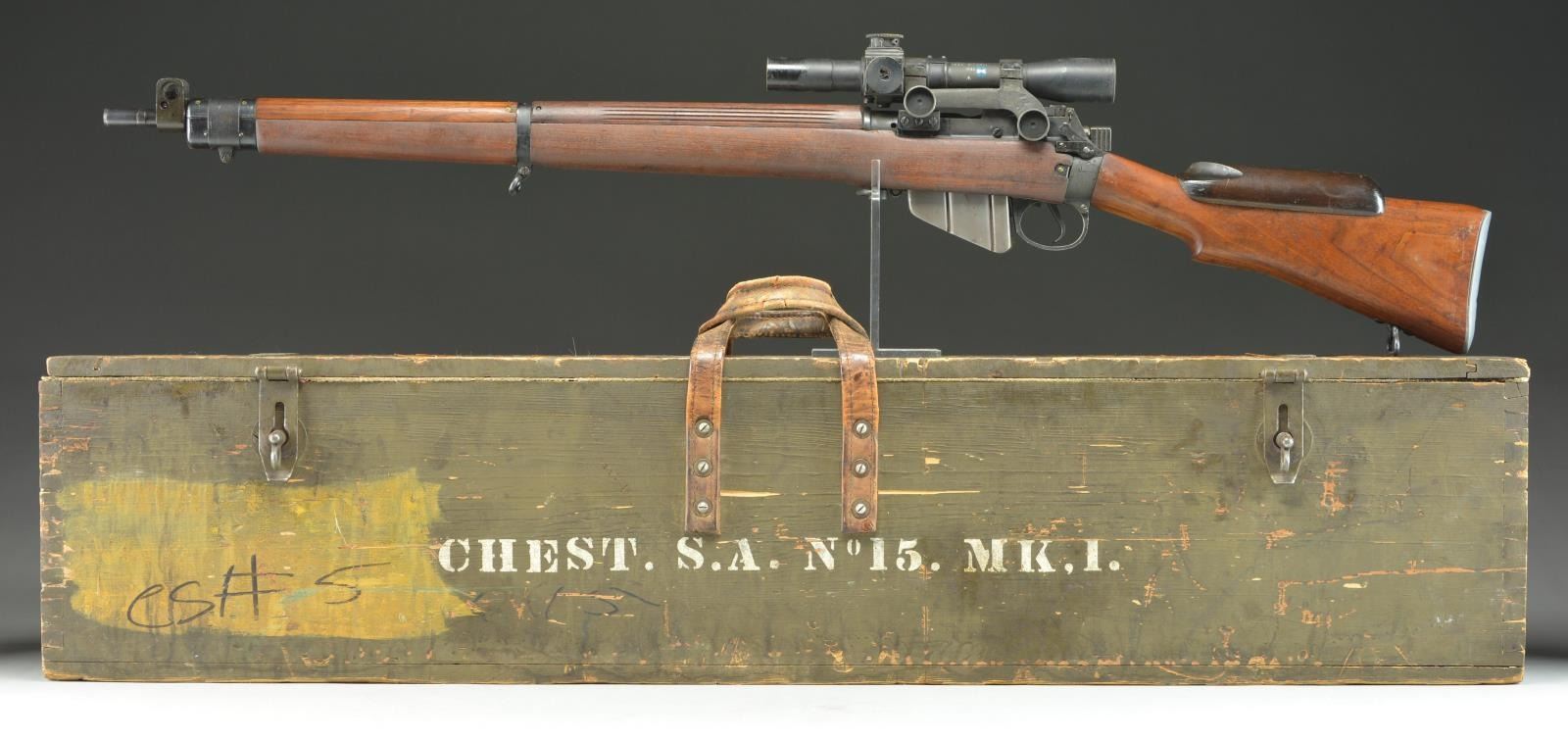 CONVERSION BSA SHIRLEY No. 4 MKI (T) BOLT ACTION SNIPER RIFLE WITH TELESCOPE AND ACCESSORIES. Cal. 303 British. S# M36992. Numbers match on receiver, butt socket & bolt. Bbl. 25 1/4". Bbl. is marked on right side of muzzle w/ British export proofs. Adj. aperture rear sight marked on adjusting knob "N67" graduated to 1300 yards. Battle aperture has been removed which is correct for this rifle. Blade front sight w/ protective ears. Beginning in September, 1942 the renowned London gunmakers Holland & Holland undertook conversion of No. 4 rifles to Sniper rifles. The rifles were selected largely from production at the BSA SHIRLEY factory using the No. 32 telescopic sight. The H&H conversions are marked "S51" at the belly of the stock as is this rifle. Approx. 26,000 of these conversions were turned out by H&H. The receiver is marked on the left side of the but socket "M47C / 1944 / T R". Left side of receiver is also marked "T" & has very faint "No4 MKI" Right side of receiver ring has "crown proof" & "ENGLAND" which is an early import mark to indicate country of origin. Receiver rail is marked below bolt head "S". Receiver is fitted w/ correct scope bases. Safety is marked "M/47C". Bolt knob has been drilled to lighten. Trigger guard marked "M/47C" is fitted w/ swivel at forward guard screw. Mixed hardwood stock set; stock components have crisp legible markings. Buttstock is marked on top of grip w/ "28041" which is scope S#. Marked underneath "SL broad arrow & view marks". Buttstock has added raised comb attached w/ 2 steel screws. Cast metal trap buttplate. Forend is marked under front w/ vertically aligned "view mark / JO / broad arrow" plus partially lined out "34172". Scope mt. has S# on left side to match rifle. Rings are numbered on right side w/ 3 digits each to ensure against loss & for correct assembly. Telescope markings are enhanced in white & are marked on top & left of the tube, "TEL STGNo 32 MKIII / OS 2039 A / AK&S No 28041 / 1945 / broad arrow". Also marked w/ stenciled "W (red) B (blue)". Scope has pointed post w/ cross wire reticle & graduated finger adj. knobs for windage & elevation. Scope equipped w/ leather caps. Strap is marked "B.H.G. 1944". MAGS: 1 good unmarked 10 rd. mag. UNATTACHED ACCESSORIES: green canvas covered metal scope case w/ folding top. Case has carrying straps; original stenciled markings on case have been obscured w/ additional period paper labels & adjustment instructions which are secured by a clear cellophane tape. Labels include rifle, S# & telescope no. dated 12-61. Tan leather sling which appears to be for French MAS 36 rifle. Sling is in good serviceable condition w/ obscured ink markings. Correct wooden carrying & storage chest w/ hinged top & padlock hasps. Case has painted primarily dark green w/ swatches of brown. Chest measures approx. 46 1/2" X 10 1/2" X 6" & is marked in white stencil on both sides "CHEST. S.A. NO 15. MK. I." Additional marking is in black marker "CS #5". End of chest is fitted w/ metal holder w/ paper tag. Markings on tag include: "rifle S# & EQUIPMENTS No.4 T.W. RIFLES MKI". CONDITION: rifle has well preserved arsenal rework finish on both wood & metal leaving crisp markings & very good appearance w/ only light wear & scattered handling marks. Scope mt. has most of its arsenal rework finish w/ light high point wear. Scope finish appears original w/ light wear & handling marks. Objective end of scope has area of added gloss black extending rearward approx. 1 1/2". Scope adjustments turn freely & optics appear clear & serviceable w/ 1 tiny spot left side of cross wire. Scope case has wear plus staining, a sm. amount of loose stitching w/ legible labeling. Chest has good visual appearance commensurate w/ age & service use w/ the expected flaking paint, scratches, worn corners plus worn & scuffed leather carrying straps. Appears in good serviceable condition. (23-845/RW). CURIO. $2,500-4,000.