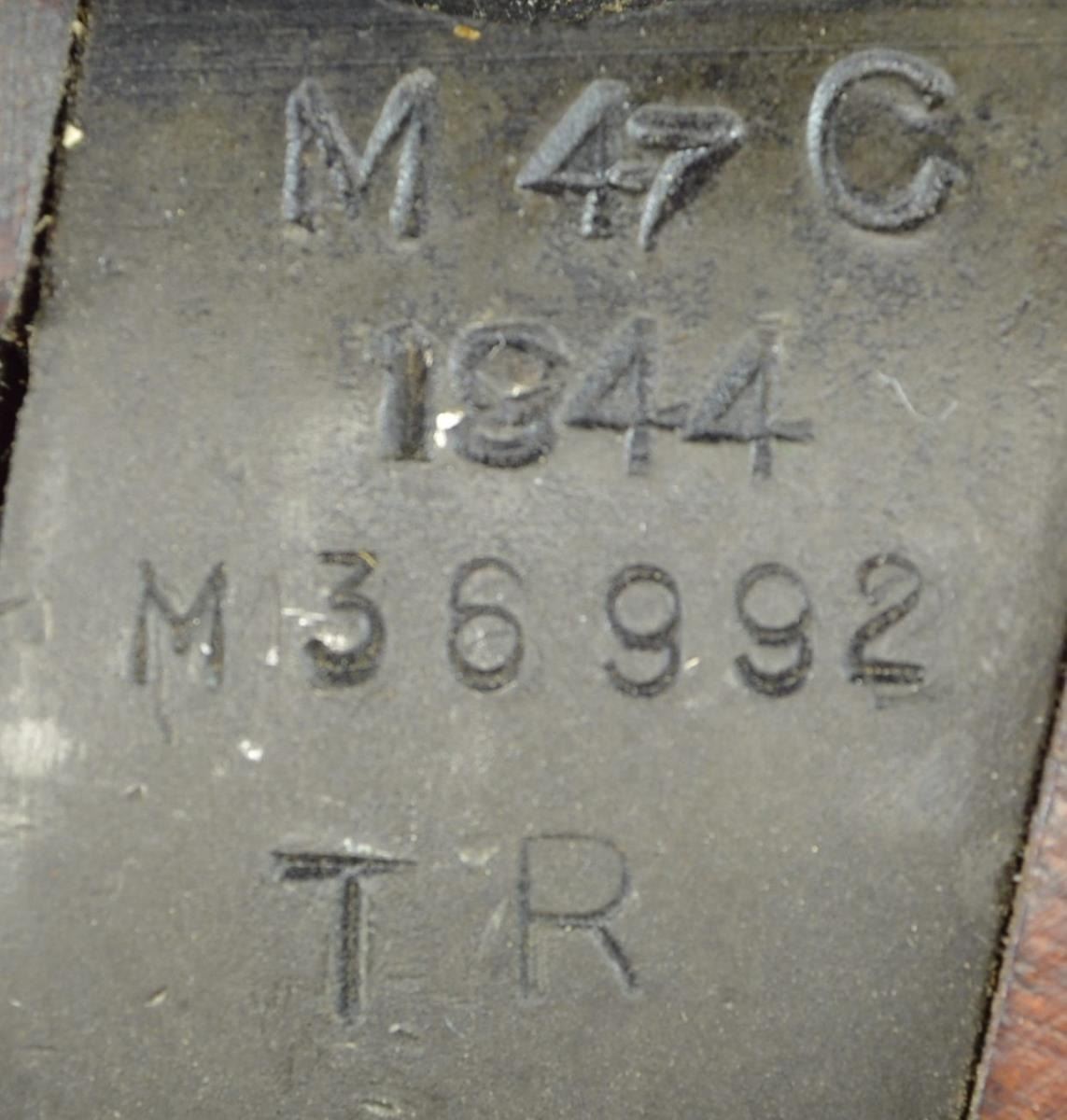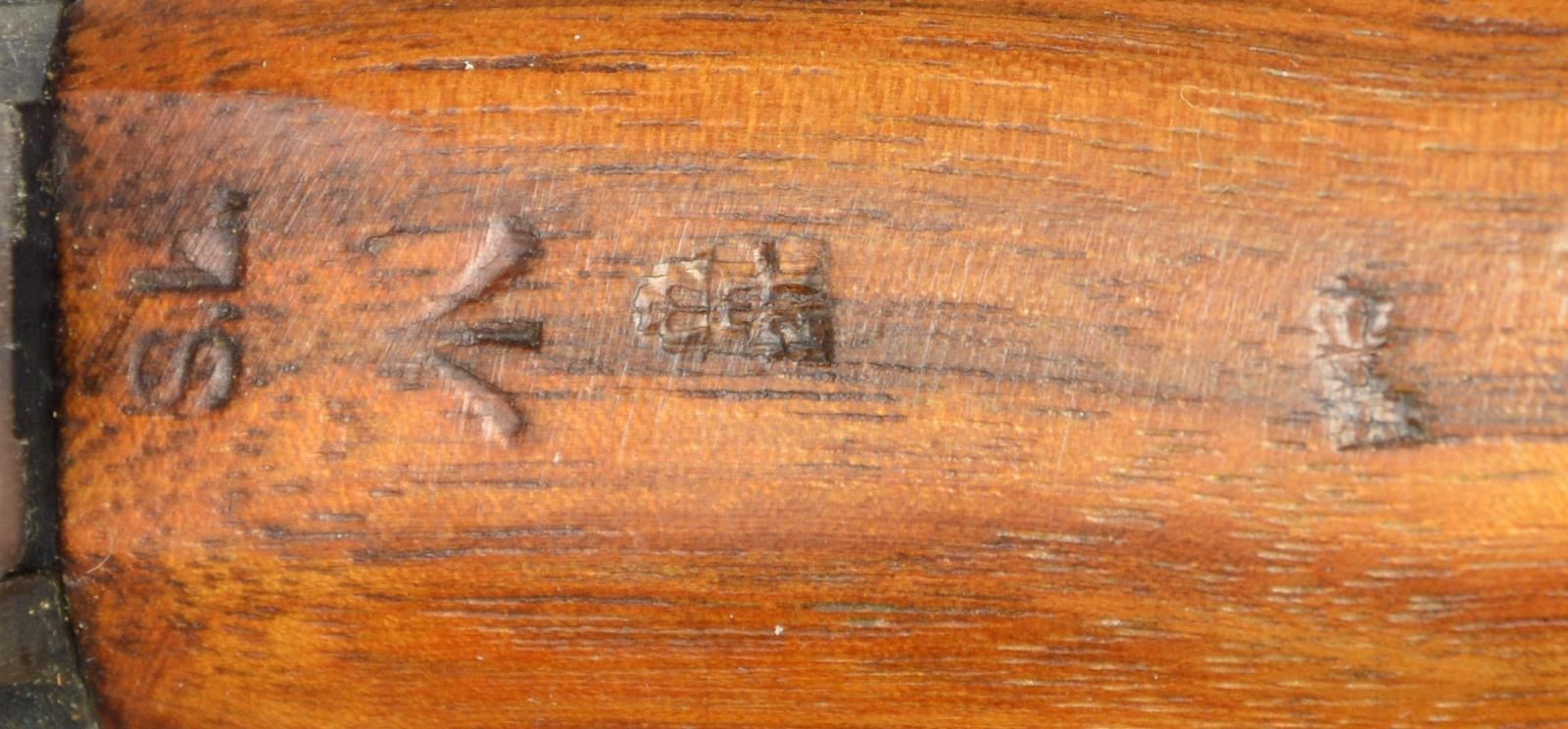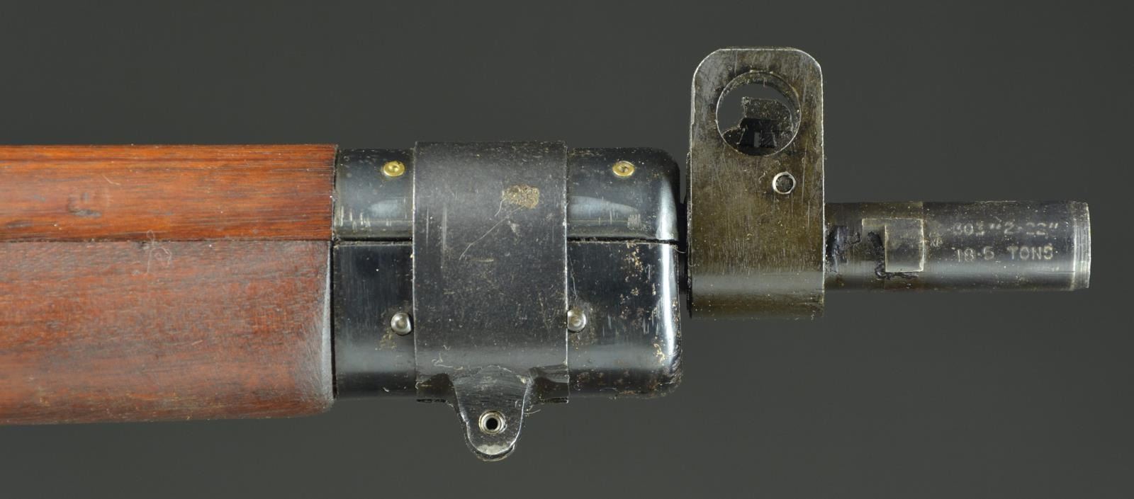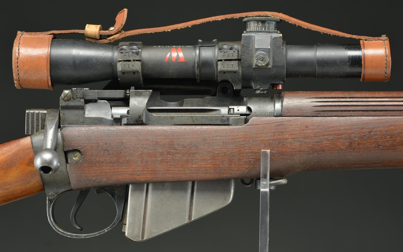CONVERSION BSA SHIRLEY No. 4 MKI (T) BOLT ACTION SNIPER RIFLE WITH TELESCOPE AND ACCESSORIES. Cal. 303 British. S# M36992. Numbers match on receiver, butt socket & bolt. Bbl. 25 1/4". Bbl. is marked on right side of muzzle w/ British export proofs. Adj. aperture rear sight marked on adjusting knob "N67" graduated to 1300 yards. Battle aperture has been removed which is correct for this rifle. Blade front sight w/ protective ears. Beginning in September, 1942 the renowned London gunmakers Holland & Holland undertook conversion of No. 4 rifles to Sniper rifles. The rifles were selected largely from production at the BSA SHIRLEY factory using the No. 32 telescopic sight. The H&H conversions are marked "S51" at the belly of the stock as is this rifle. Approx. 26,000 of these conversions were turned out by H&H. The receiver is marked on the left side of the but socket "M47C / 1944 / T R". Left side of receiver is also marked "T" & has very faint "No4 MKI" Right side of receiver ring has "crown proof" & "ENGLAND" which is an early import mark to indicate country of origin. Receiver rail is marked below bolt head "S". Receiver is fitted w/ correct scope bases. Safety is marked "M/47C". Bolt knob has been drilled to lighten. Trigger guard marked "M/47C" is fitted w/ swivel at forward guard screw. Mixed hardwood stock set; stock components have crisp legible markings. Buttstock is marked on top of grip w/ "28041" which is scope S#. Marked underneath "SL broad arrow & view marks". Buttstock has added raised comb attached w/ 2 steel screws. Cast metal trap buttplate. Forend is marked under front w/ vertically aligned "view mark / JO / broad arrow" plus partially lined out "34172". Scope mt. has S# on left side to match rifle. Rings are numbered on right side w/ 3 digits each to ensure against loss & for correct assembly. Telescope markings are enhanced in white & are marked on top & left of the tube, "TEL STGNo 32 MKIII / OS 2039 A / AK&S No 28041 / 1945 / broad arrow". Also marked w/ stenciled "W (red) B (blue)". Scope has pointed post w/ cross wire reticle & graduated finger adj. knobs for windage & elevation. Scope equipped w/ leather caps. Strap is marked "B.H.G. 1944". MAGS: 1 good unmarked 10 rd. mag. UNATTACHED ACCESSORIES: green canvas covered metal scope case w/ folding top. Case has carrying straps; original stenciled markings on case have been obscured w/ additional period paper labels & adjustment instructions which are secured by a clear cellophane tape. Labels include rifle, S# & telescope no. dated 12-61. Tan leather sling which appears to be for French MAS 36 rifle. Sling is in good serviceable condition w/ obscured ink markings. Correct wooden carrying & storage chest w/ hinged top & padlock hasps. Case has painted primarily dark green w/ swatches of brown. Chest measures approx. 46 1/2" X 10 1/2" X 6" & is marked in white stencil on both sides "CHEST. S.A. NO 15. MK. I." Additional marking is in black marker "CS #5". End of chest is fitted w/ metal holder w/ paper tag. Markings on tag include: "rifle S# & EQUIPMENTS No.4 T.W. RIFLES MKI". CONDITION: rifle has well preserved arsenal rework finish on both wood & metal leaving crisp markings & very good appearance w/ only light wear & scattered handling marks. Scope mt. has most of its arsenal rework finish w/ light high point wear. Scope finish appears original w/ light wear & handling marks. Objective end of scope has area of added gloss black extending rearward approx. 1 1/2". Scope adjustments turn freely & optics appear clear & serviceable w/ 1 tiny spot left side of cross wire. Scope case has wear plus staining, a sm. amount of loose stitching w/ legible labeling. Chest has good visual appearance commensurate w/ age & service use w/ the expected flaking paint, scratches, worn corners plus worn & scuffed leather carrying straps. Appears in good serviceable condition. (23-845/RW). CURIO. $2,500-4,000.