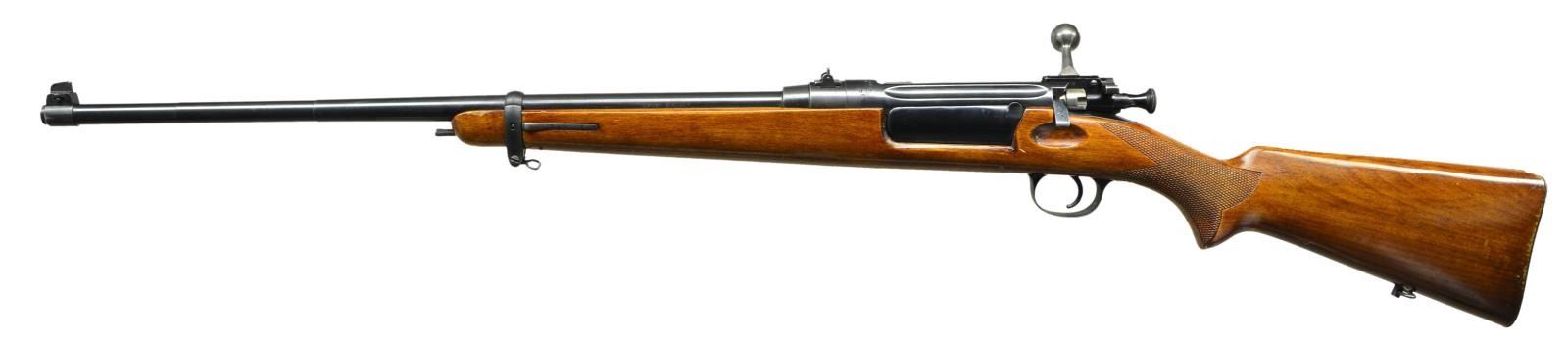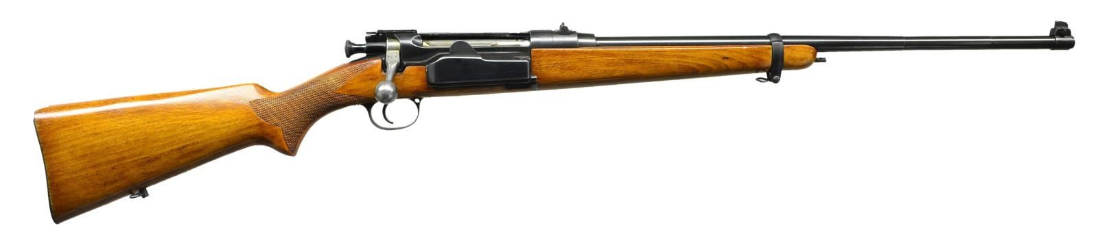 ELGRIFLE. Cal. 8x57 Mauser. S# 1674. Numbers match on receiver & bolt. Bbl. 22 7/8". Two position L type sight dovetailed into receiver ring & graduated to 300 meters. Blade type front sight w/ windage adj. screw. These interesting rifles were mfg. by Kongsberg Arsenal to supply sporting rifles for the civilian market. The rifles were called the "Elgrifle". The Scandinavian term Elk is equivalent to the term Moose. The rifles were made in the 8X57 Mauser cartridge which was not only more powerful than the 6.5X55 cartridge but was more readily available. Receiver ring is marked on top w/ Crown, "1950", Rampant Lion. Left side of receiver ring retains partial boxed acceptance mark. Bbl. is marked on left side "7.9X57 MAUSER". Rifle is equipped w/ flag type safety & mag. cutoff. Checkered hardwood pistol grip stock made w/out grasping grooves. Bbl. band is retained by spring on left side of rifle. Original military style sling swivel replaced by 3/4" Sporting type in bbl. band. Rear swivel is 3/4" sporting type. Forend is equipped w/ 81/2" cleaning rod. Grooved sheet metal buttplate. CONDITION: stock set has light wear & scattered handling marks retaining approx. 85% of original finish. Brass pin reinforcement by left forward end of trigger guard. Metal retains 90% of original blue finish w/ scattered sm. handling marks. Bright bolt w/ beginnings of gray coloration. Very good shiny bore. (23-639/RW). CURIO. $600-900.
