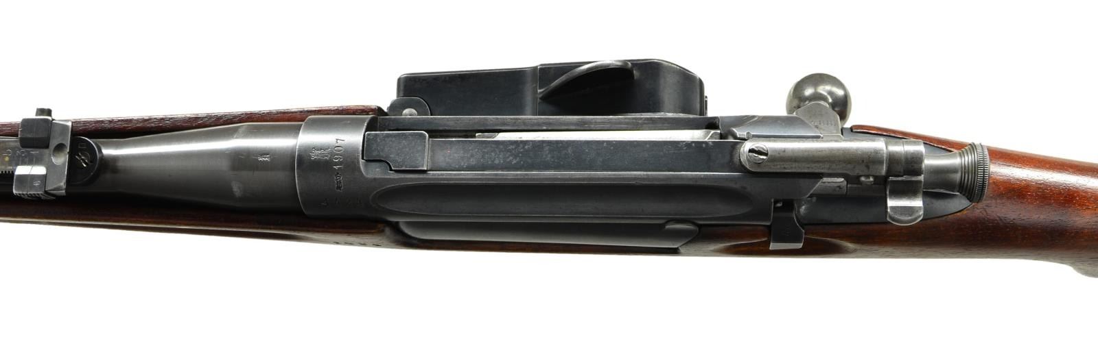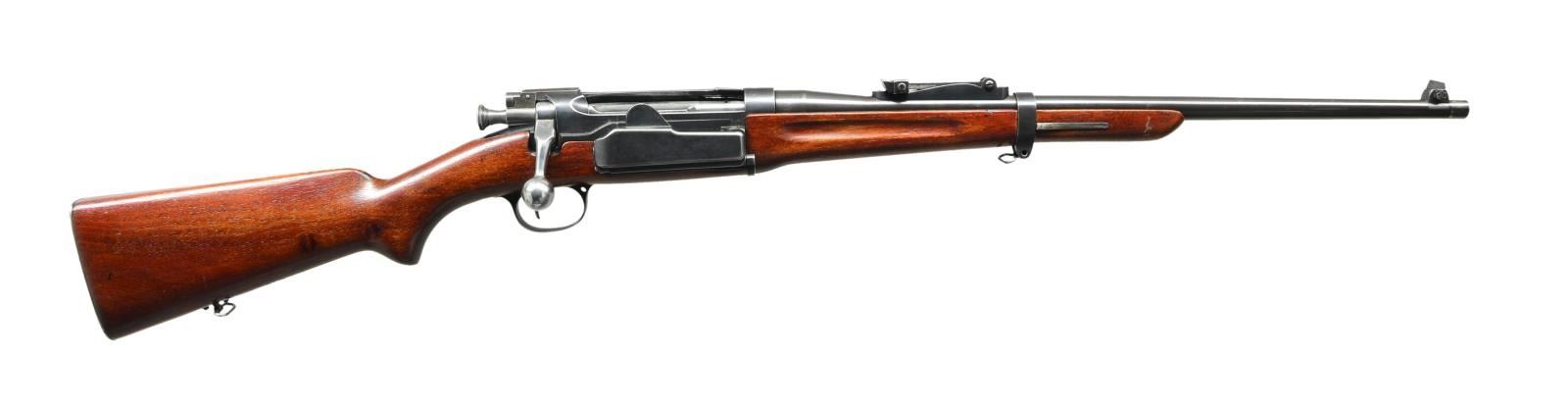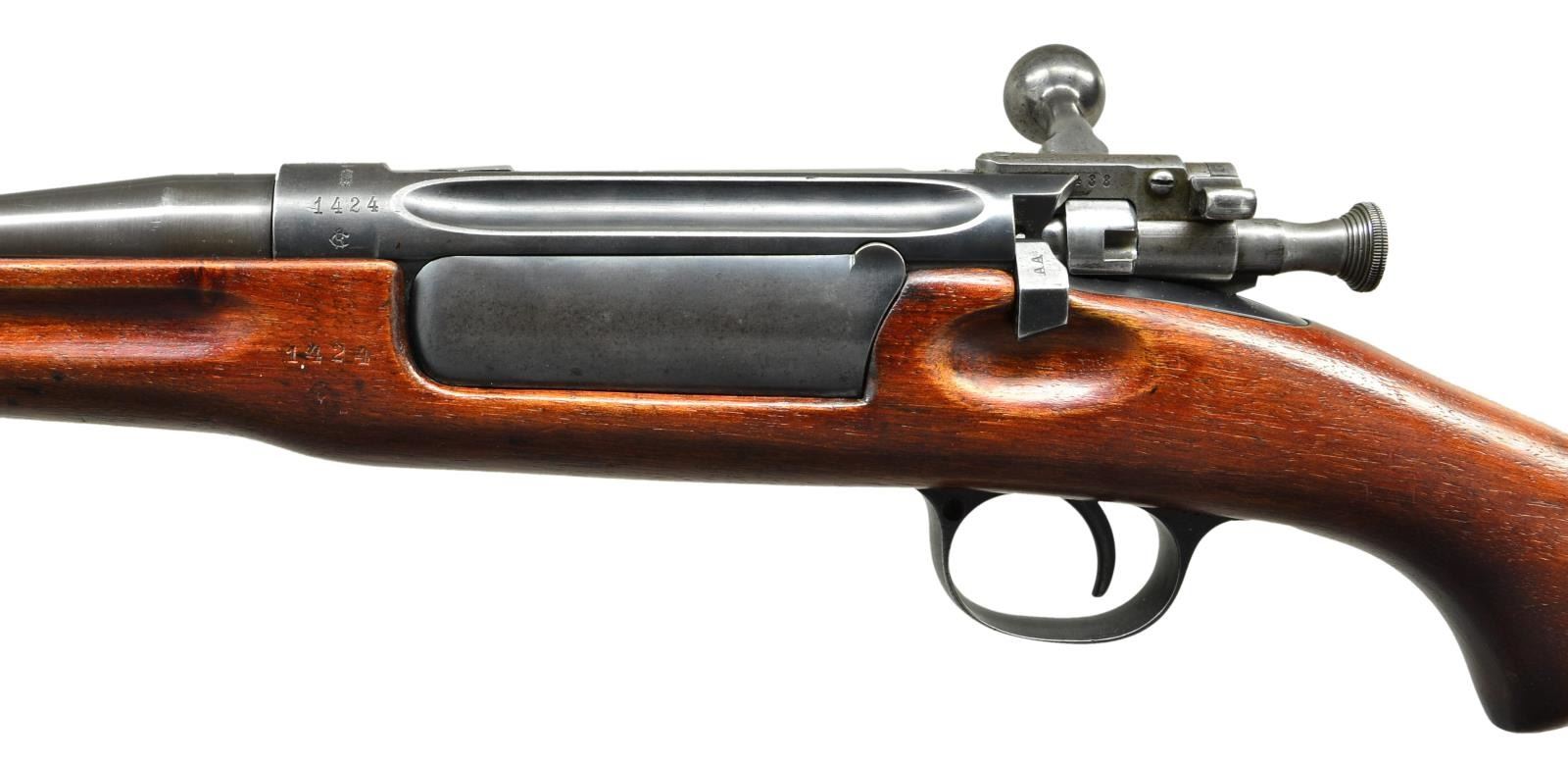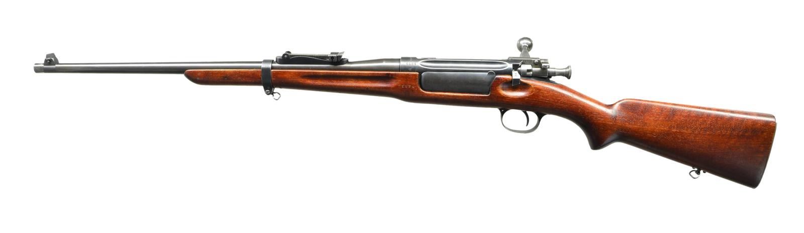 ACTION CARBINE. Cal. 6.5x5.5. S# 1424. S# matches on receiver, stock, rear sight & mag. follower. Bbl. 20 1/2". Tangent rear sight graduated to 2,000 meters. Inverted V front sight adj. for windage. Receiver ring is marked on top "Crown K", Kongsberg Arsenal marking. "1900". "Crown 7" inspector's mark. Marked on left side w/ Norwegian proof. Bbl. marked on top over chamber "Crown K". 30,321 of these rare Gutterkarabin ("Boys" Carbines) were mfg. in 1907 for the Norway Youth Sports Marksmanship program. They are reported to have been used w/ a reduced power cartridge. Bolt assembly numbers match. Bolt handle is turned down slightly. Walnut stock w/ pistol grip grasping grooves & flat steel buttplate. Matching bbl. band retained by spring on right side. 3/4" swivels. CONDITION: stock has attractive arsenal rework type finish w/ very light wear & scattered handling marks. Metal retains 80% high quality arsenal rework blue finish w/ light wear & scattered sm. handling marks. Near excellent shiny bore. (23-638 /RW). CURIO. $700-1,100.