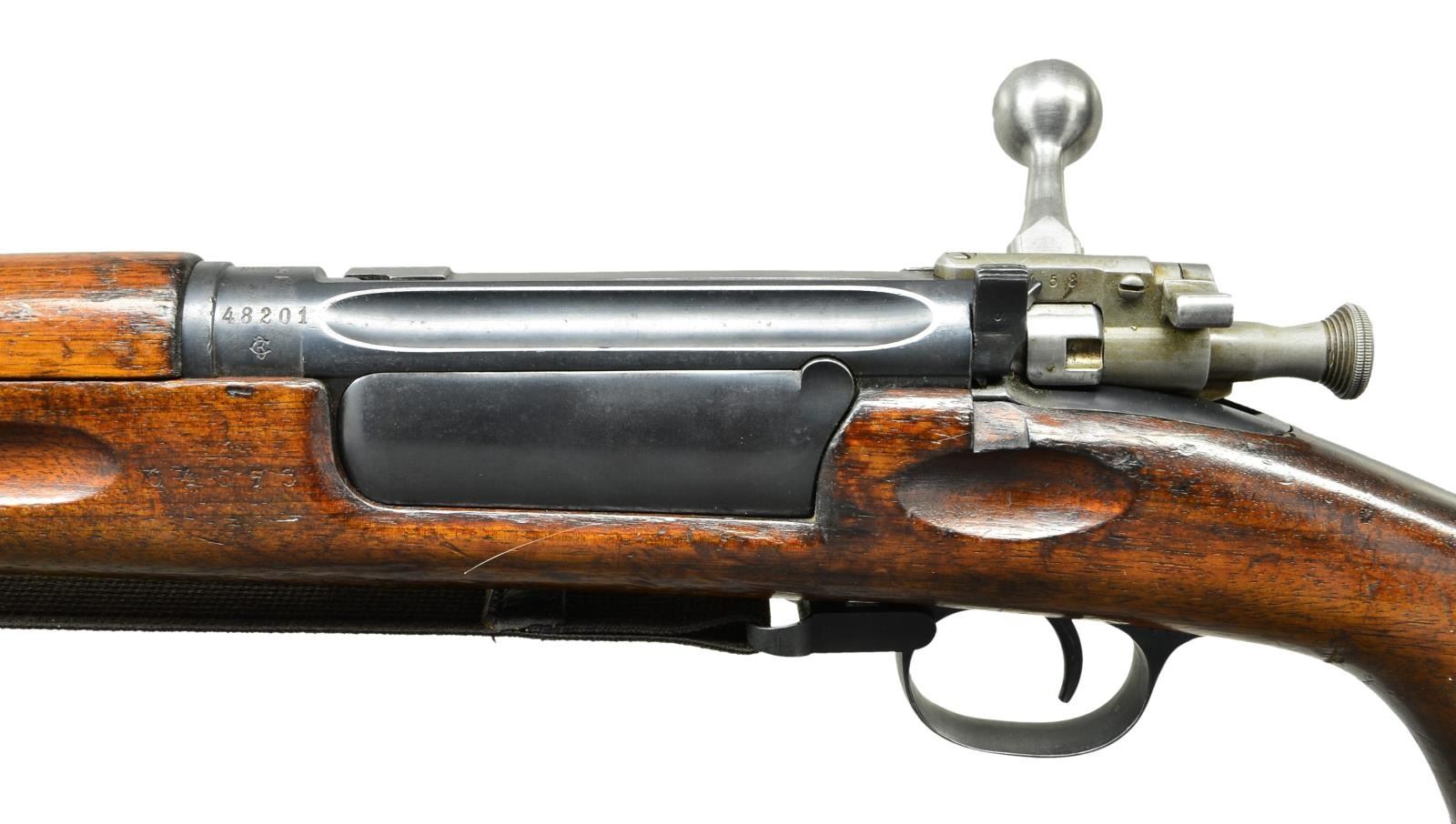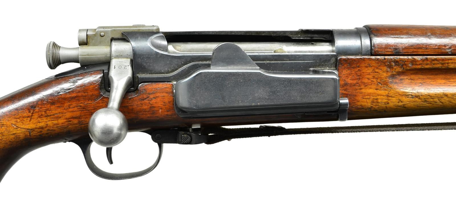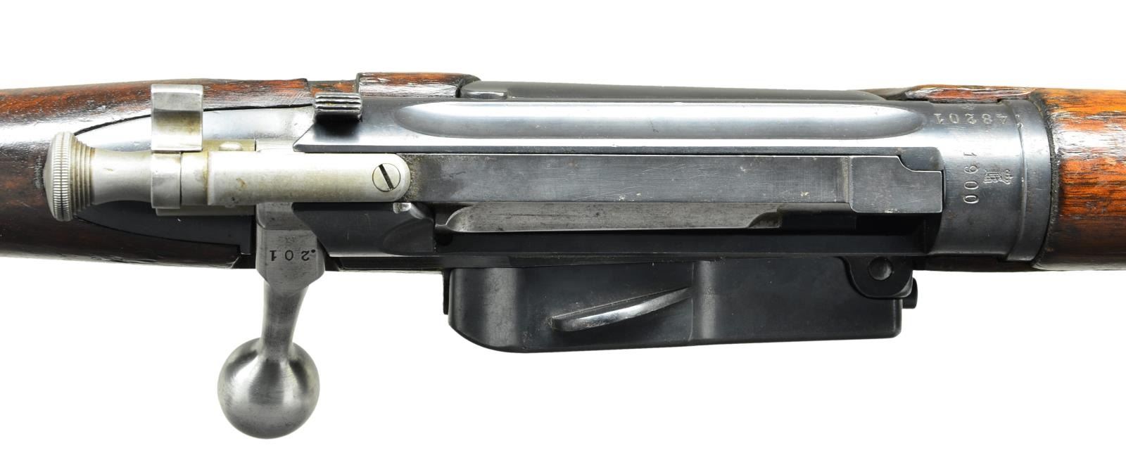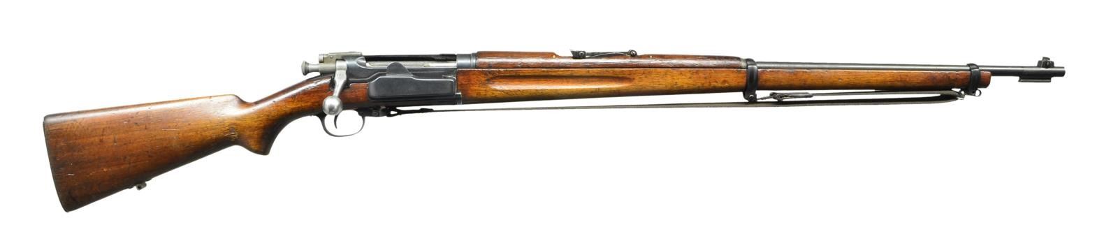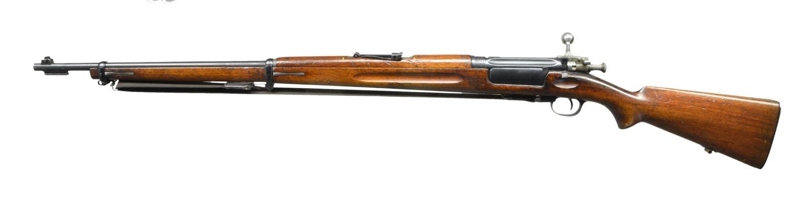 CONVERSION BOLT ACTION SINGLE SHOT RIFLE. Cal. 22 LR. S# 48201. S# matches on receiver, bolt handle & rear sight base. Bbl. 29 7/8". Tangent rear sight graduated to 2200 meters. Blade front sight adj. for windage. Receiver ring marked on top w/ "Kongsberg Arsenal" "Crown K". "1900". Marked on left side w/ Norwegian proof. Approx. 3,000 of these Model 1894 rifles were arsenal converted to 22 LR w/ an eccentric sleeve in the bbl. which allows the use of the standard CF bolt. Forward 2 3/8" of bbl. has external sleeve to retain original sight & bayonet bar. Receiver retains original mag. parts as the conversion is single shot. European walnut stock set; bands are retained by springs on left side. Stock make with pistol grip grasping grooves & flat trap buttplate. Vintage fabric sling w/ leather reinforcement. Sling has parade hook & is retained in the lower band by a snap. CONDITION stock set has original finish w/ wear, staining & handling marks commensurate w/ extensive use. Metal retains 75% arsenal rework finish w/ thinning wear & peppery oxidation. Very good shiny bore. (23-637/RW). CURIO. $900-1,200.