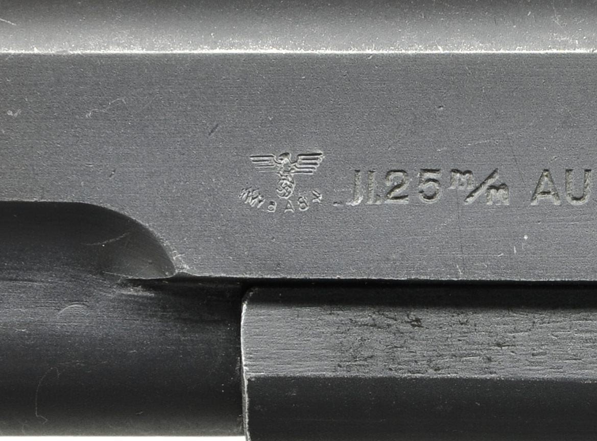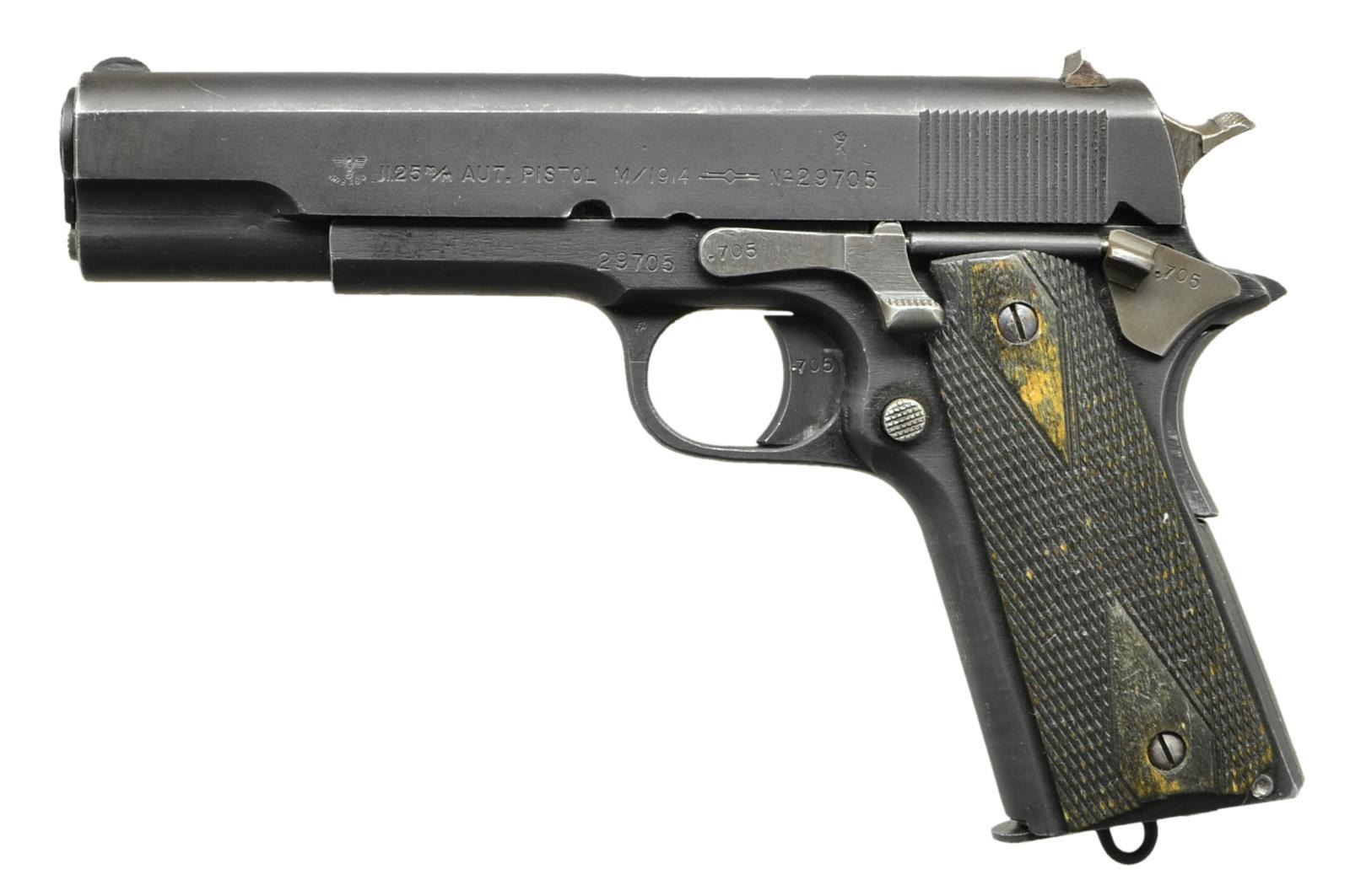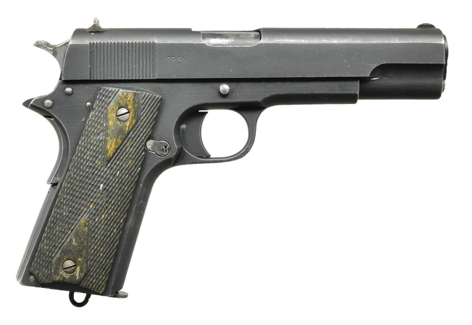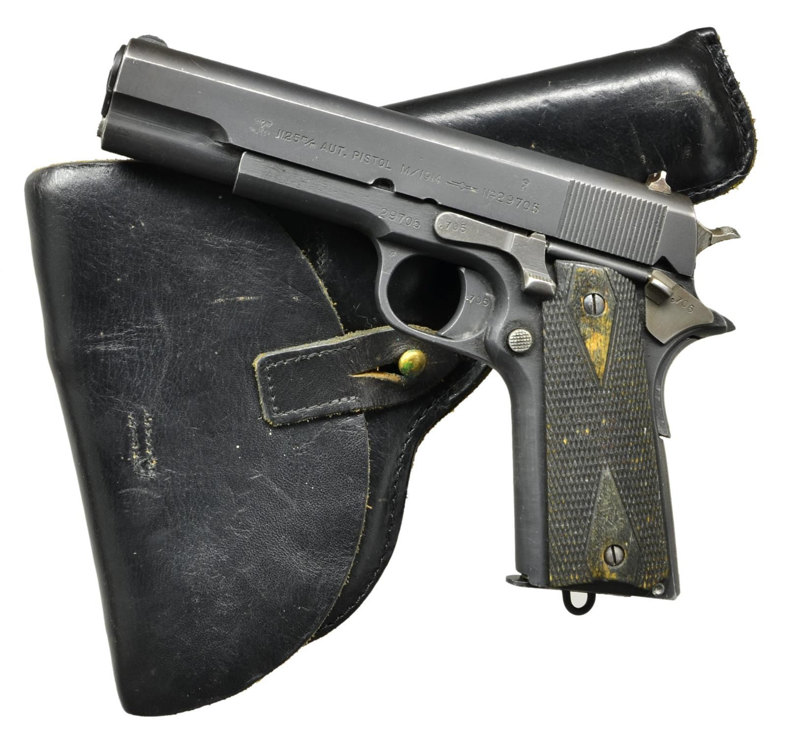 Cal. 11.25m/m (45 ACP). S# 29705. Mfg. 1945 (920 units; S# 29615-30535) in Norway at Kongsberg Vapenfabrikk Arsenal. 1911 Colt pattern w/ Norwegian style slide stop. Matching numbers of ".705" on trigger, checkered undercut thumb safety, grip safety, smooth flat mainspring housing, slide stop & bbl. Full matching number on slide w/ “J” proof behind rear sight. “WaA84” on slide (left of cal. marking) & on lower left side of bbl. aligned w/ front of leg. Eagle Party symbol on left leg of bbl. plus script "B" & “.705” in front of legs. Crown "K" above S# on left side of slide; "1945" on opposite side. Checkered wide spur hammer & firing pin retainer both in the white. Left side of trigger guard has script "B". Black stained dbl. diamond checkered grips w/ light wood base color showing on lg. diamonds & on most diamond tops. MAGS: 1 unmarked 7 rd. w/ lanyard loop. Body appears plated w/ blued base, pins & follower. Dark vertical lines at corners of spine give appearance of being blued over plating wear. UNATTACHED ACCESSORIES: very good black leather flap holster w/ stud & strap retention, wide single belt loop plus lift strap stitched to flap. Underside of flap inked “29705” over “KVM GRONSVEEN” over “BSKA”. Slight verdigris at brass stud. Very minimal signs of use. CONDITION: very good overall appearance w/ minimal operation wear (mostly on bbl. at ejection port). Slight thinning of finish at high points, especially on slide along w/ function wear. Recoil spring & extractor appear new replacements. Barrel is throated & feed ramp in the white w/out signs of wear (not highly polished); both items likely done after manufacture. Mag. release has minimal finish on right; appears possible replacement. Light marks to concave portion of mainspring housing retaining pin. Light breech face wear & near excellent bore. (23-636/NW). CURIO. $3,000-5,000.