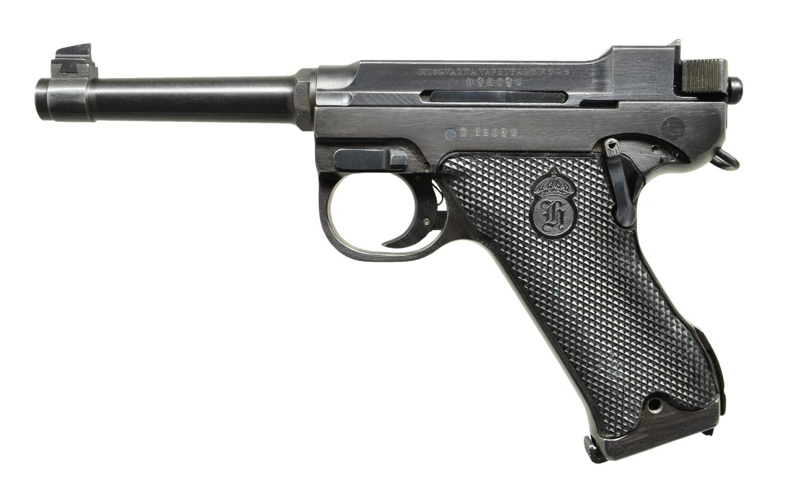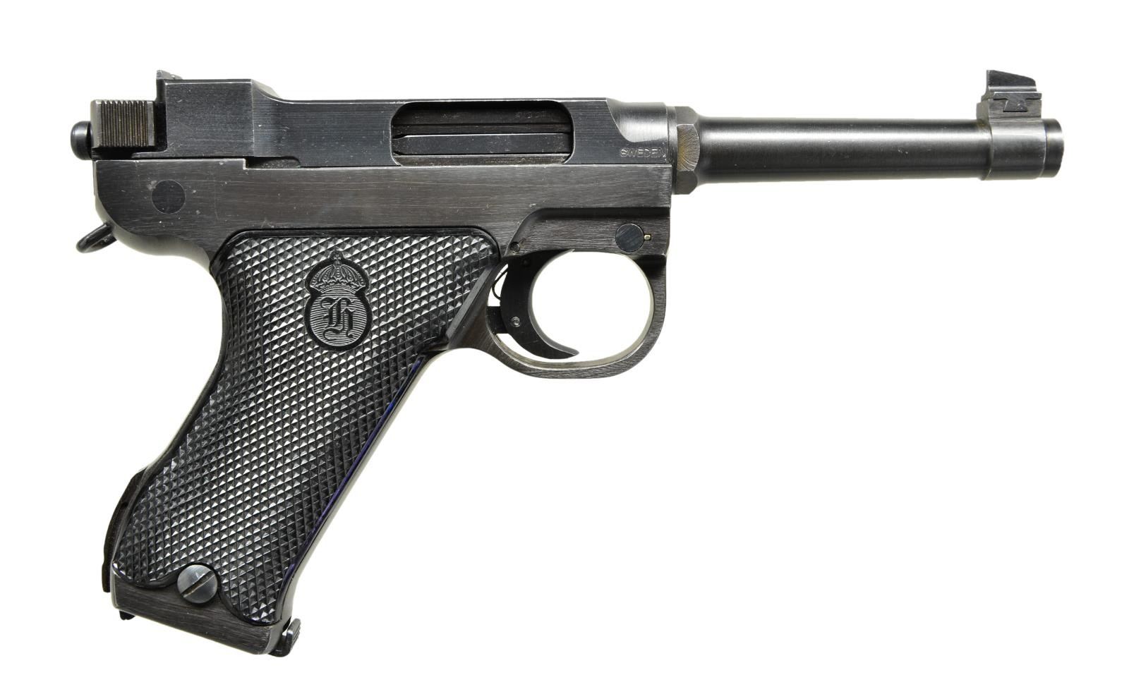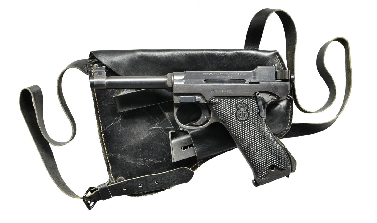 Cal. 9mm Luger. S# D12016. Bbl. 4 3/4" w/ dovetailed patridge faced sight & integral frame rear. Mfg. 1940-1946 as Swedish military side arm. Border checkered black plastic grips w/ Husqvarna logo. Matching numbered receiver having "SWEDEN" as export mark on right front. Rear of frame above lanyard loop marked w/ crown over "HV"; stock lug at butt of backstrap. MAGS: 2 factory 8 rd.; very good & near excellent. UNATTACHED ACCESSORIES: very good black shoulder holster w/ straps plus stud & strap retention; similar in appearance to open style US pilots holster. White stitching, steel rivets & no markings; incorrect fit for this pistol. CONDITION: missing left grip screw & occasional very faint finish loss at high points such as front sight band; all other aspects near excellent including bore & grips. (23-481/NW). CURIO. $1,000-1,500.