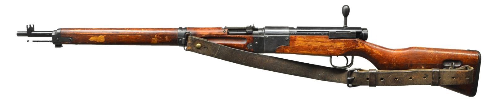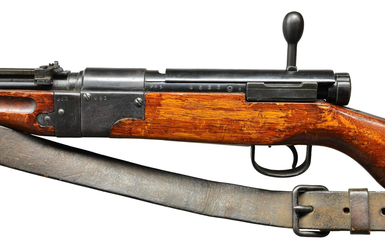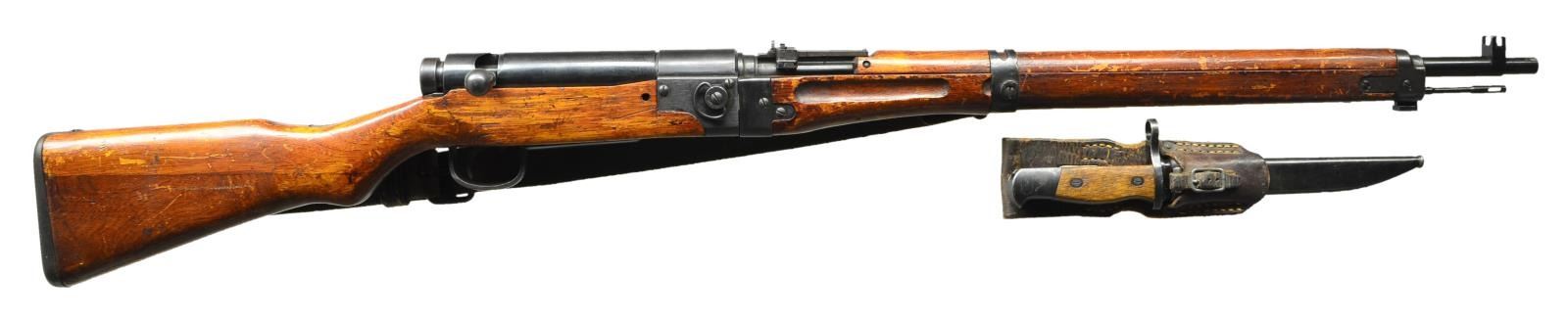 TYPE 2 PARATROOP BOLT ACTION MILITARY RIFLE WITH CORRECT BAYONET. Cal. 7.7 Jap. S# 4623. All visible numbers match. Bbl. 25 1/2". Ladder aperture rear sight with anti aircraft wings. Inverted V front sight with protective ears. This rare rifle was made to arm Japanese airborne troops and was designed to be broken down into a compact package for parachute operations. Starting late in 1943 approximately 22,000 of these rifles were made. This nice example has correct early features, matching numbers and a large degree of original finish. Receiver has crisp mum and characters for "Type2". The left receiver rail has S# and Nagoya Arsenal marking, and also carries the matching number for the takedown parts. This number which is present on both sides of the takedown as well as the locking screw and barrel, rarely if ever matches the rifle serial number. Straight bolt handle with oval knob. Checkered notched safety knob. Correct matching sliding dust cover. Brown leather unmarked sling with snap rear swivel attachment and steel buckle adjustment. 21 3/8" cleaning rod. Three screw upper band. Open top lower band which does not have the mono pod base as mono pods were not used on these rifles. Hardwood stock set with long handguard. Two piece buttstock construction with cup type buttplate and two screw sling swivel. UNATTACHED ACCESORIES: 7 7/8" fullered blade paratroop bayonet with straight cross guard and smooth hardwood grips. Bayonet serial 5111. Steel scabbard and correct leather frog. Bayonet and scabbard have most of their original finish with light wear. The finish is over a professional sharpening. The frog has wear and flexing but stitching is tight. CONDITION: The stock set has moderate wear and handling marks. The original finish has been given a light coat of additional finish likely to prevent further flaking. The metal retains a very large degree of original blue with light wear and handling marks. Near excellent shiny bore. PROVENANCE: From the Lifelong Collection of Glen E. Mattox. (23-100/RW). CURIO. $2,500-4,000.