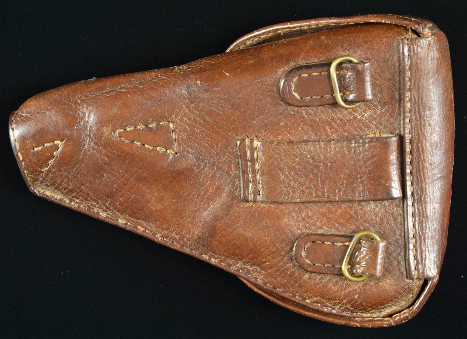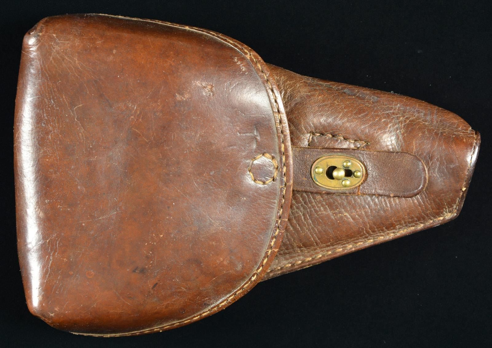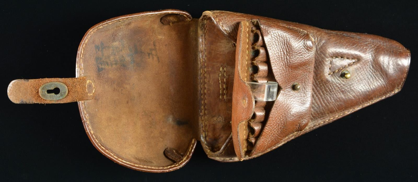 MARKINGS. Rare, seldom offered clam shell holster for Baby Nambu. References state less than 30 known to exist in private collections. Careful examination of holster details leads to conclusion of originality. Dbl. shoulder strap loops on back plus 1 1/8" wide belt loop. Interior w/ provision for cleaning rod plus stacked leather making spacers to support pistol. Gentle slope formed section on edge of holster to clear bbl. sight. Front pouch w/ brass stud & flap sealing ammo pouch containing 2 rows of cartridge loops; set of 8 at top & set of 6 at bottom. Latch strap has keyhole like brass front w/ 4 rivets going into more roughly shaped copper back. Japanese characters under flap that were translated to “Field Artillery 7-5”. Exceptional example that has not been cleaned, altered or oiled. Rare opportunity for wonderful appearing example. PROVENANCE: From the Lifelong Collection of Glen E. Mattox. (02-18436/NW). $1,000-2,000.