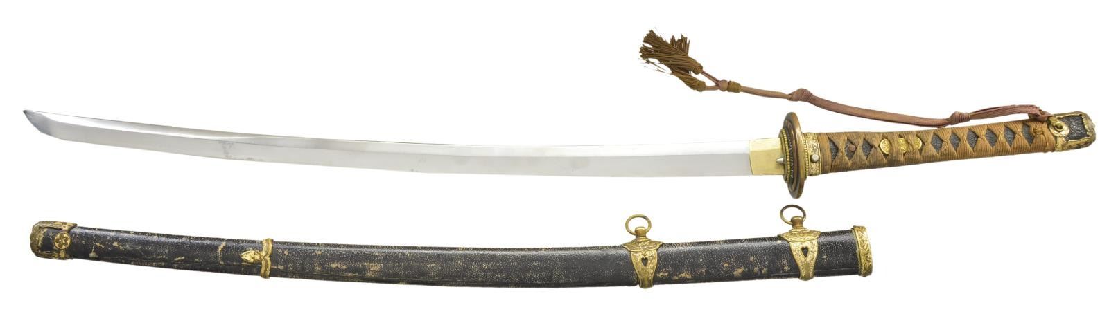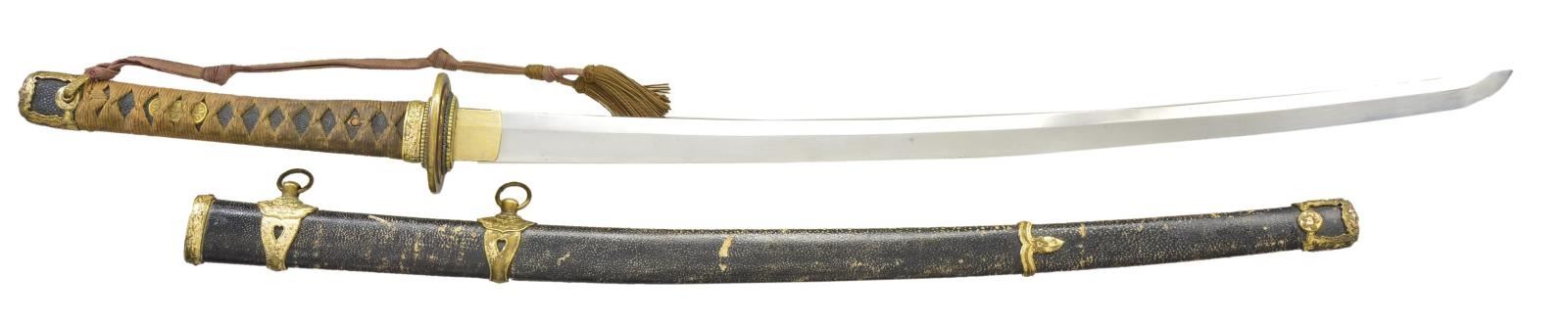 Overall length: 39 1/2". Blade length: 27 5/8”. The blade has a straight hamon with a brass habaki. There are 3 seppa above & below the tsuba. The tsuba is brass with a blackened finish and alternating copper & brass rays emanating from the center. We have been unable to remove the tsuka to inspect the nakago. The tsuka has a black same with a light brown tsuka-ito. The menuki are of 3 cherry blossom medallion design. Shin-gunto style kabuto-gane with matching fuchi. There is a tassel attached to the ring of the kabuto-gane. The saya has gilded mounts bearing 5-petal cherry blossoms. The body appears to be blackened fish skin. CONDITION: blade has a good polish, but could use further work on some minor scratches. Tsuka shows light overall wear. Saya shows light overall wear with minor abrasions to the body. (02-19392/BF). $600-800.
