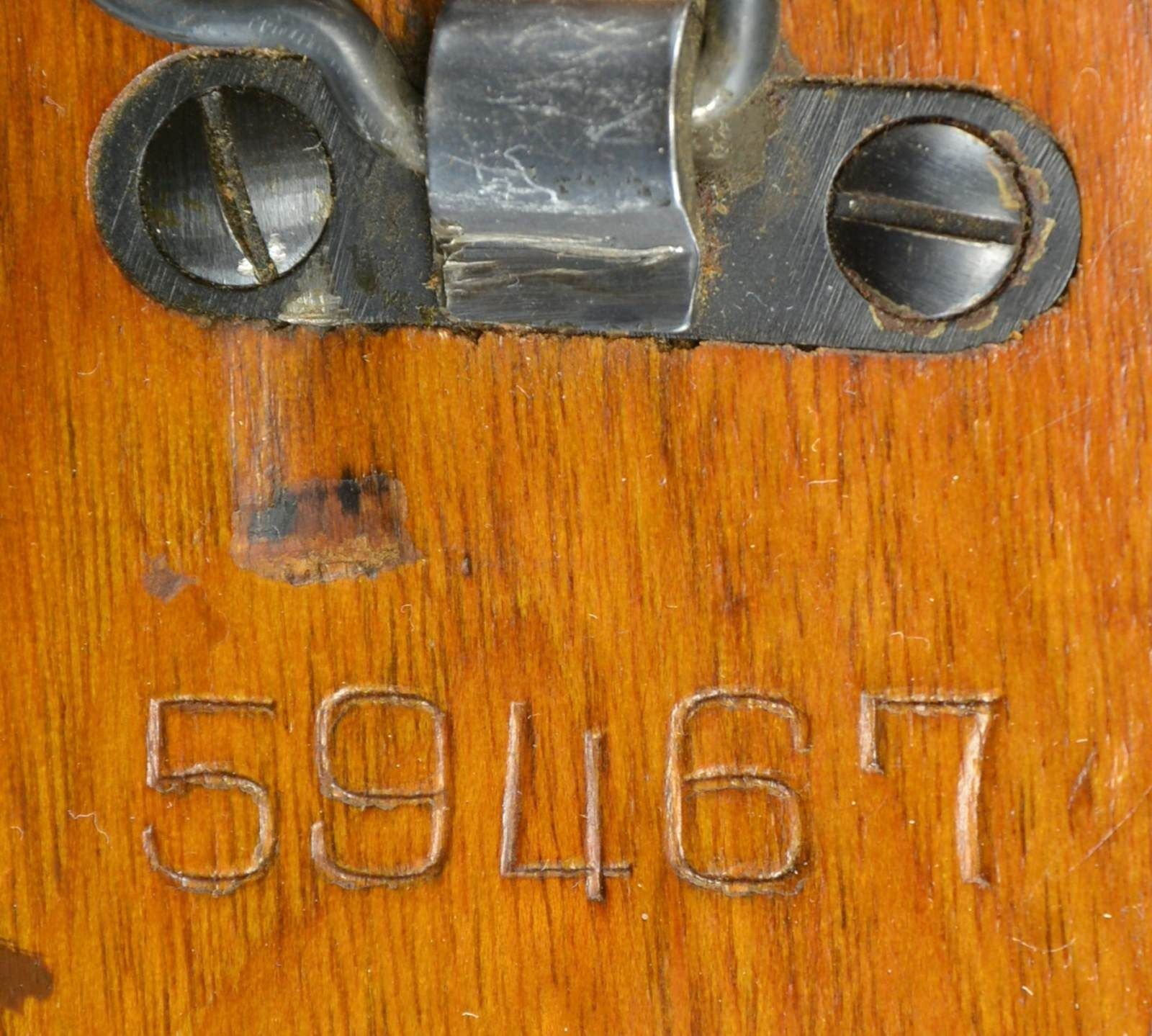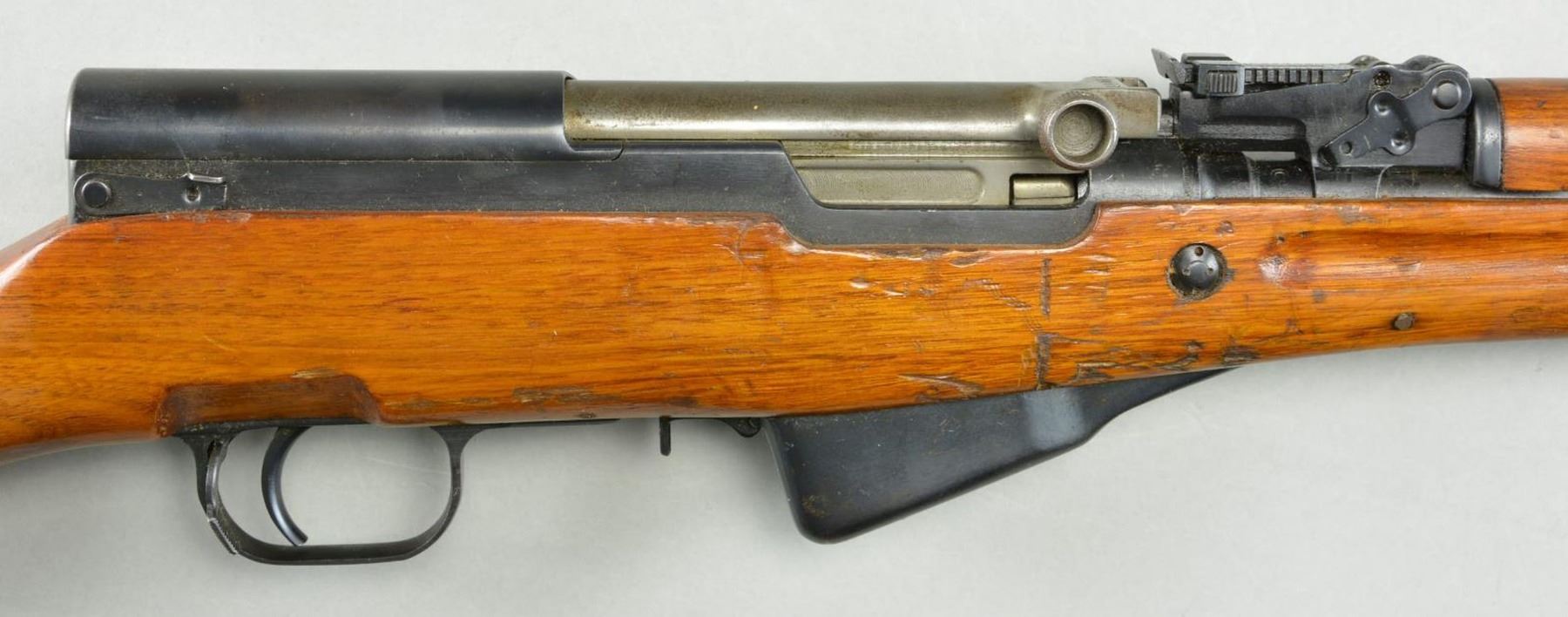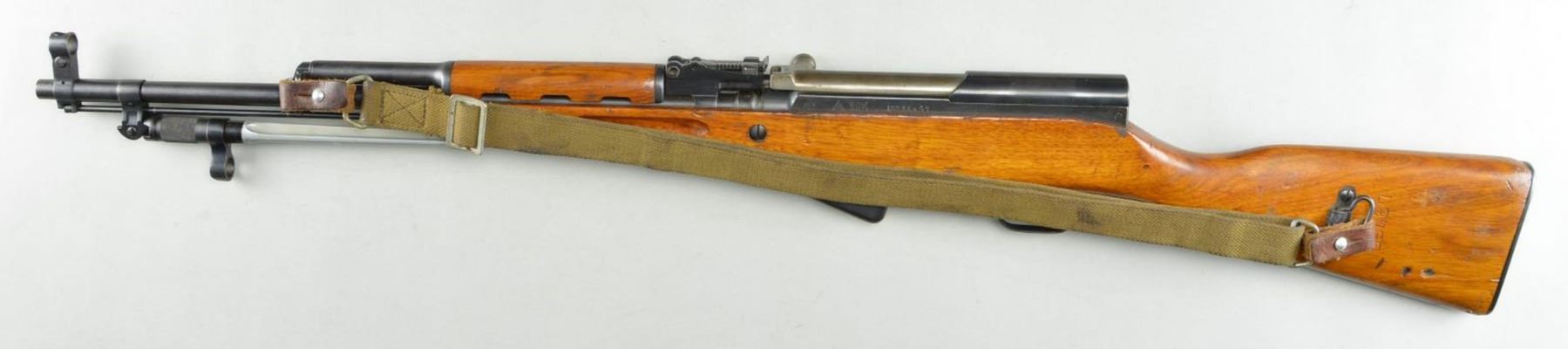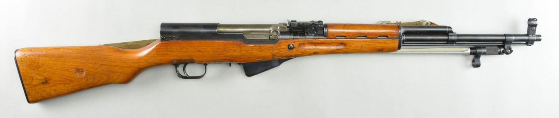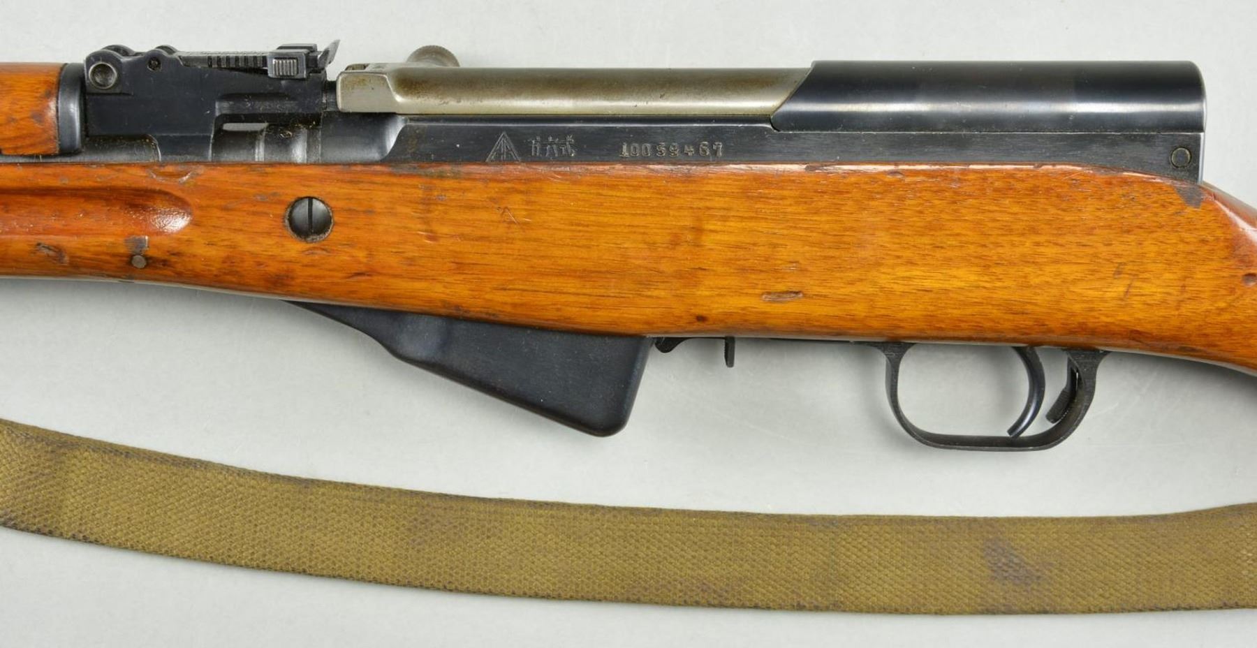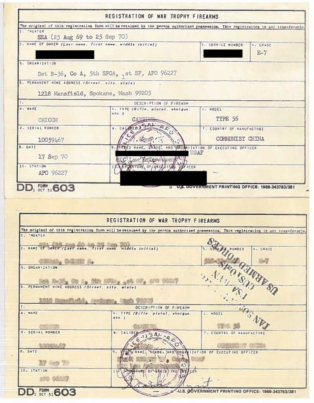 2) CAPTURED CHICOM SKS. Cal. 7.62x39. S# 10059467. Bbl. 20.5". Mfg. 1965. A unique find w/ complete documentation. This is an official War Trophy that was liberated from Vietnam after September 17,1970, & exported to the USA from Tan Son Nhut Air Base. Included is the original form DD603-1, War Trophy Registration as authorized to SFC E-7 Dwight E. Conrad. Chicom manufactured SKS bearing the "Triangle 26" factory mark. These guns were the primary infantry weapon of the People's Liberation Army (PLA) & could be found in numerous places on both side of the war. As well as the original Chinese characters it appears that many outwardly obvious parts bear numbers matching the receiver including mag., trigger group, bolt, top cover & even the stock. Spike bayonet which matches stock inlet. Hooded post front sight w/ rear tangent sight marked out to 1000m. Stained, tan canvas sling. UNATTACHED ACCESSORIES: original War Trophy Registration / Authorization (DD603-1), CONDITION: finish on exposed metal surfaces is quite complete & consistent w/ most thinning in areas of mechanical intervention. Bayonet locks tightly in both open & closed positions. Stock possesses numerous typical impressions throughout. Stock trapdoor still retains cylindrical cleaning kit behind flat steel buttplate. Bore remains surprisingly shiny w/ good rifling. Fire control mechanism appears to function correctly when cycled by hand. (23-111/JZ). CURIO.