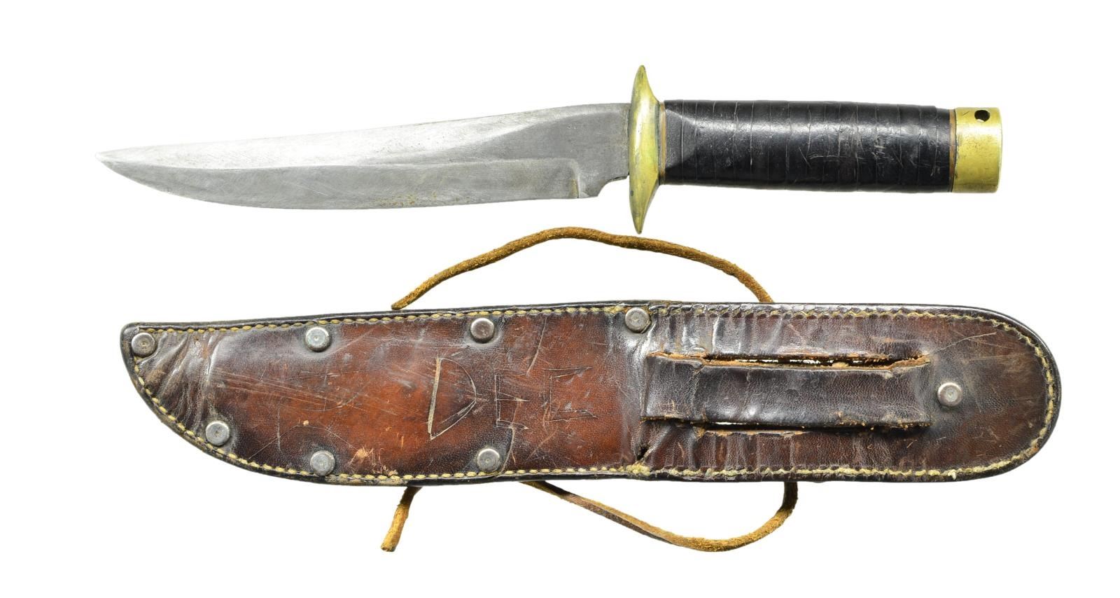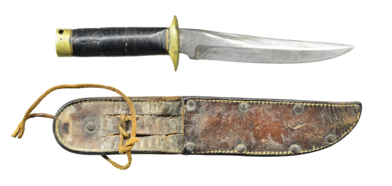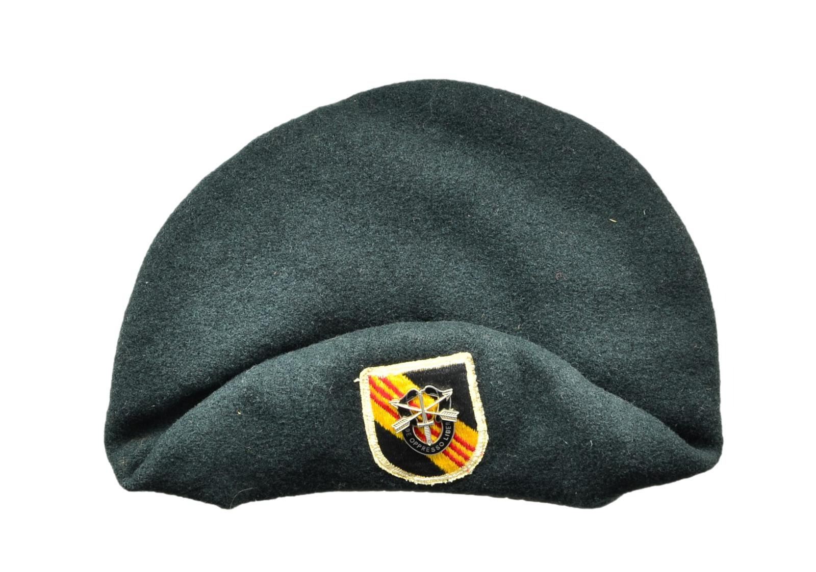 1) Wood & glass shadowbox containing some articles of uniform belonging to SSG Dwight E. Conrad who served w/ the 5th SFG (Abn), 1st SF including Green Beret, insignia, photographs & Randal style fighting knife. Knife has note attached "Randal Prototype Limited Prod. U.S.S.F. Knife" though unable to verify. (02-18622/JZ).