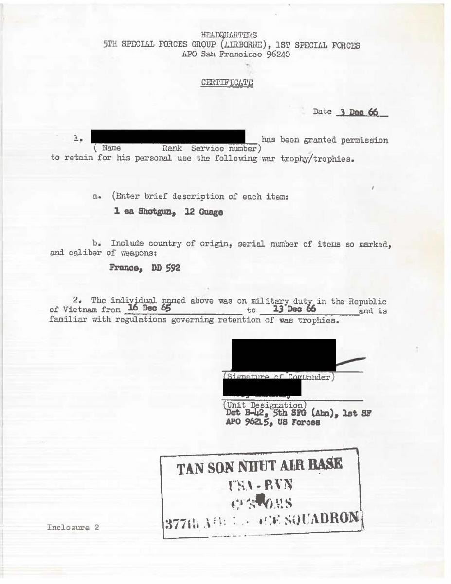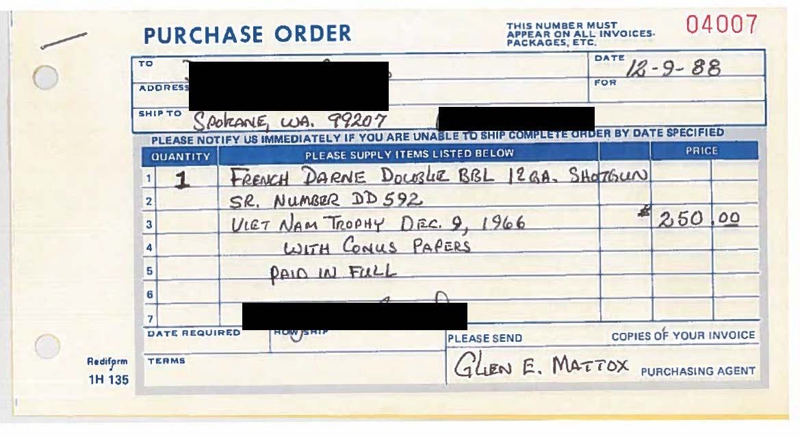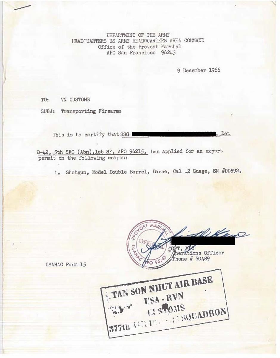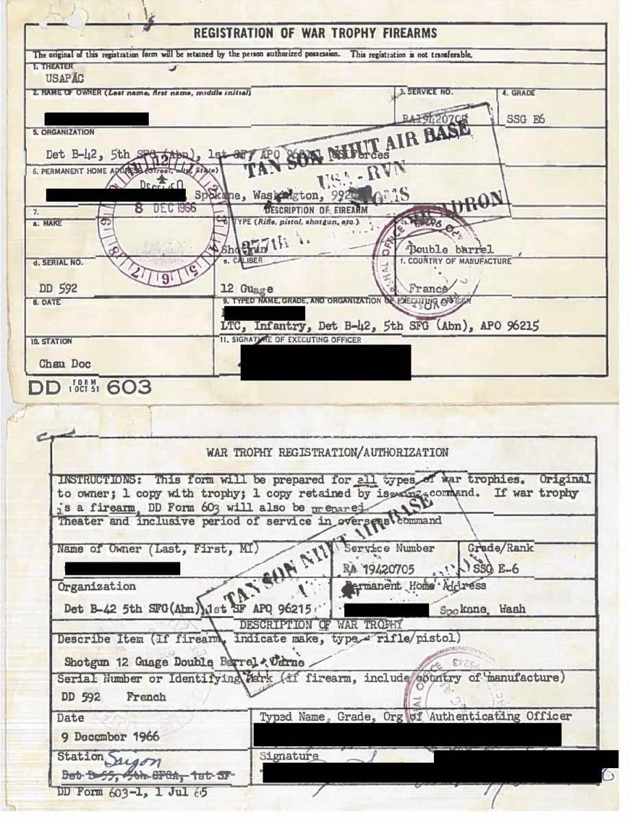 3) CAPTURED FRENCH DARNE DOUBLE BARRELED SHOTGUN. Cal.12ga. S#. DD592. Bbl. 31.5". Fixed barrel SxS shotgun w/ sliding breech system & single throw lever. Blued finish. Center rib between barrels host front bead sight. Stock w/ short forend painted black. Black plastic butt plate. Sling swivels front & rear. UNATTACHED ACCESSORIES: original War Trophy Registration / Authorization (DD603-1) based in Saigon & VN Customs Transport papers dated, 9 December, 1966. CONDITION: Original finish still enjoys complete coverage and is blended w/ a light patina throughout. Stock missing much of its painted finish & has some structural damage making it loose. Butt plate cracked, missing lower 1/4. Bores are surprisingly bright but possess spots of internal pitting on close inspection. PROVENANCE: From the Lifelong Collection of Glen E. Mattox. (23-112/JZ). CURIO.$600-900.