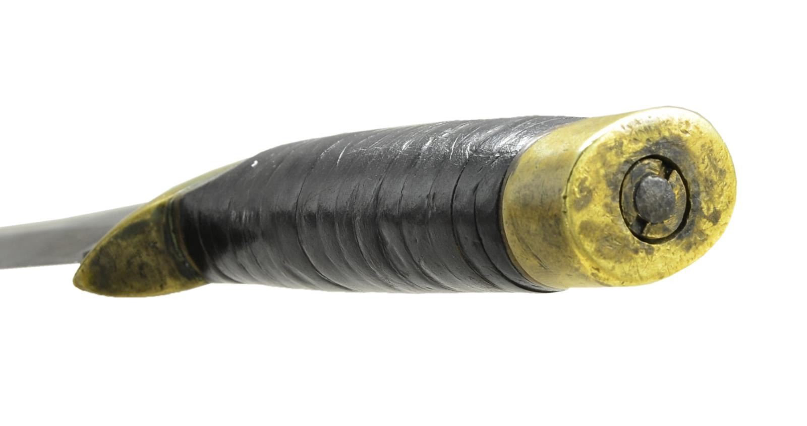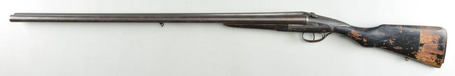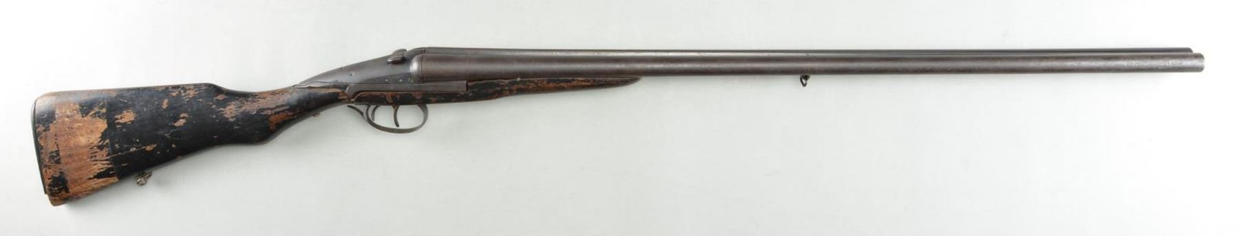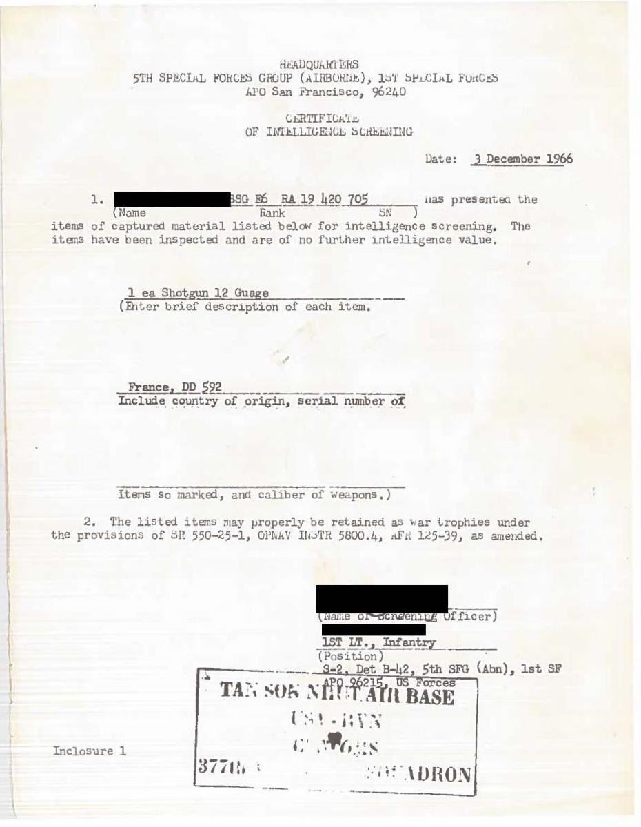 3) CAPTURED FRENCH DARNE DOUBLE BARRELED SHOTGUN. Cal.12ga. S#. DD592. Bbl. 31.5". Fixed barrel SxS shotgun w/ sliding breech system & single throw lever. Blued finish. Center rib between barrels host front bead sight. Stock w/ short forend painted black. Black plastic butt plate. Sling swivels front & rear. UNATTACHED ACCESSORIES: original War Trophy Registration / Authorization (DD603-1) based in Saigon & VN Customs Transport papers dated, 9 December, 1966. CONDITION: Original finish still enjoys complete coverage and is blended w/ a light patina throughout. Stock missing much of its painted finish & has some structural damage making it loose. Butt plate cracked, missing lower 1/4. Bores are surprisingly bright but possess spots of internal pitting on close inspection. PROVENANCE: From the Lifelong Collection of Glen E. Mattox. (23-112/JZ). CURIO.$600-900.