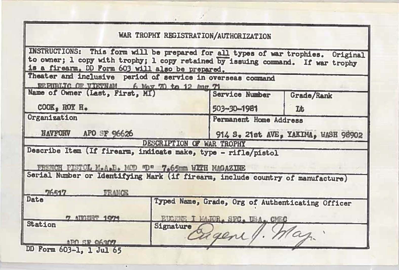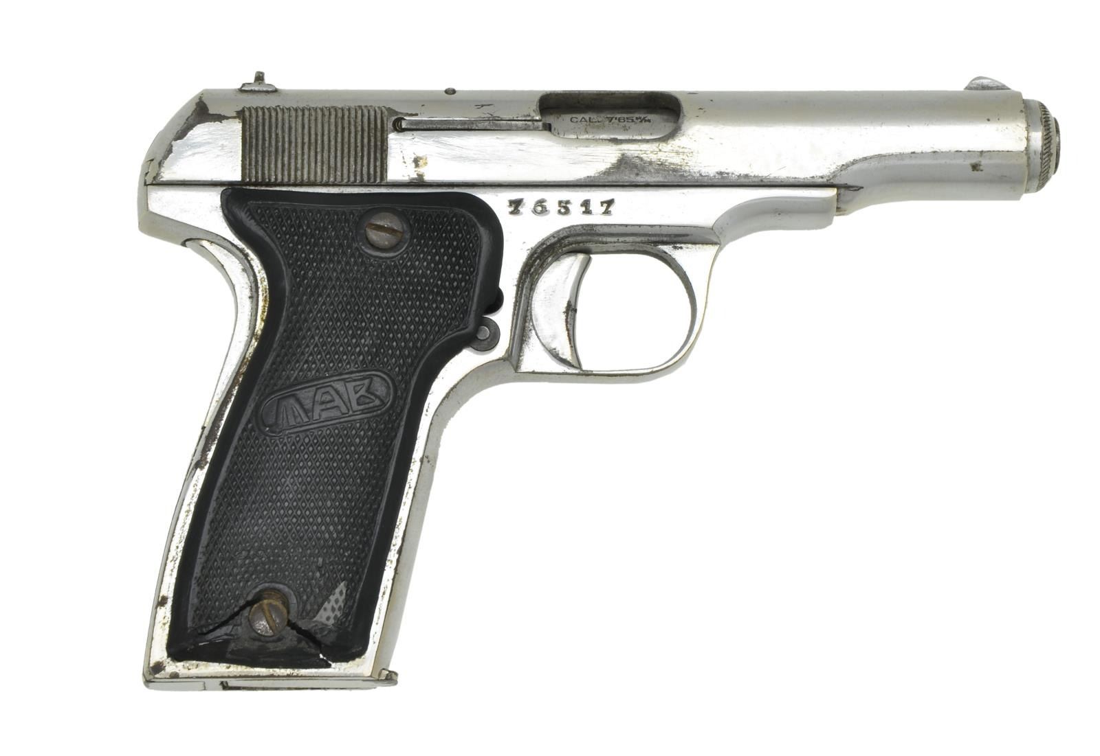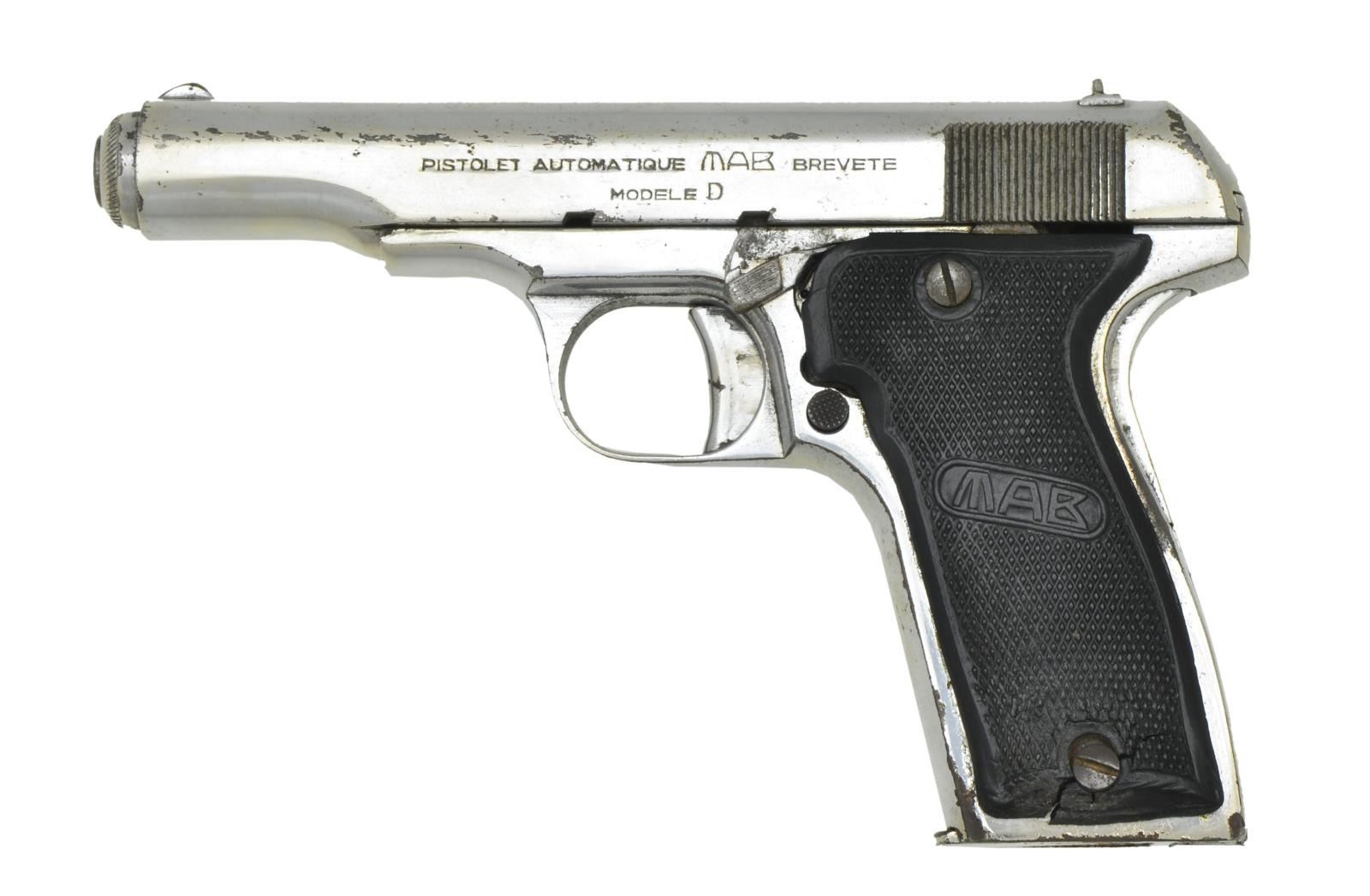 PISTOL. Cal. 7.65mm. S# 76517. Bbl. 4". Mfg. 1933-1964. A Vietnam War captured, chrome plated, French Military pistol. It was liberated by Lt. Roy H. Cook during his tour of duty in Republic of Vietnam from 6 May, 1970 - 12 Aug., 1971. Serrated slide w/ front blade & drift adjustable rear sights. Left side controls. Black plastic checkered grips w/ MAB logo in center in oval. Smooth backstrap & front strap. Rear grip safety. These guns can be encountered w/ Navy markings or German markings depending on where they were deployed but this exmple has only factory markings. MAGS: 1 steel 9rd. UNATTACHED ACCESSORIES: War Trophy Registration / Authorization form 603-1, signed by Eugene I Major, SFC, USA, CMEC on 7 Aug., 1971. CONDITION: Chrome finish has thinning on high spots & small scattered flecks. Factory markings remain clear & deep. Grips are cracked around bottom screws. Grip safety, thumb safety & magazine safety still function correctly. Bore is clean w/ strong rifling. PROVENANCE: From the Lifelong Collection of Glen E. Mattox. (23-114/JZ). CURIO. $500-800.