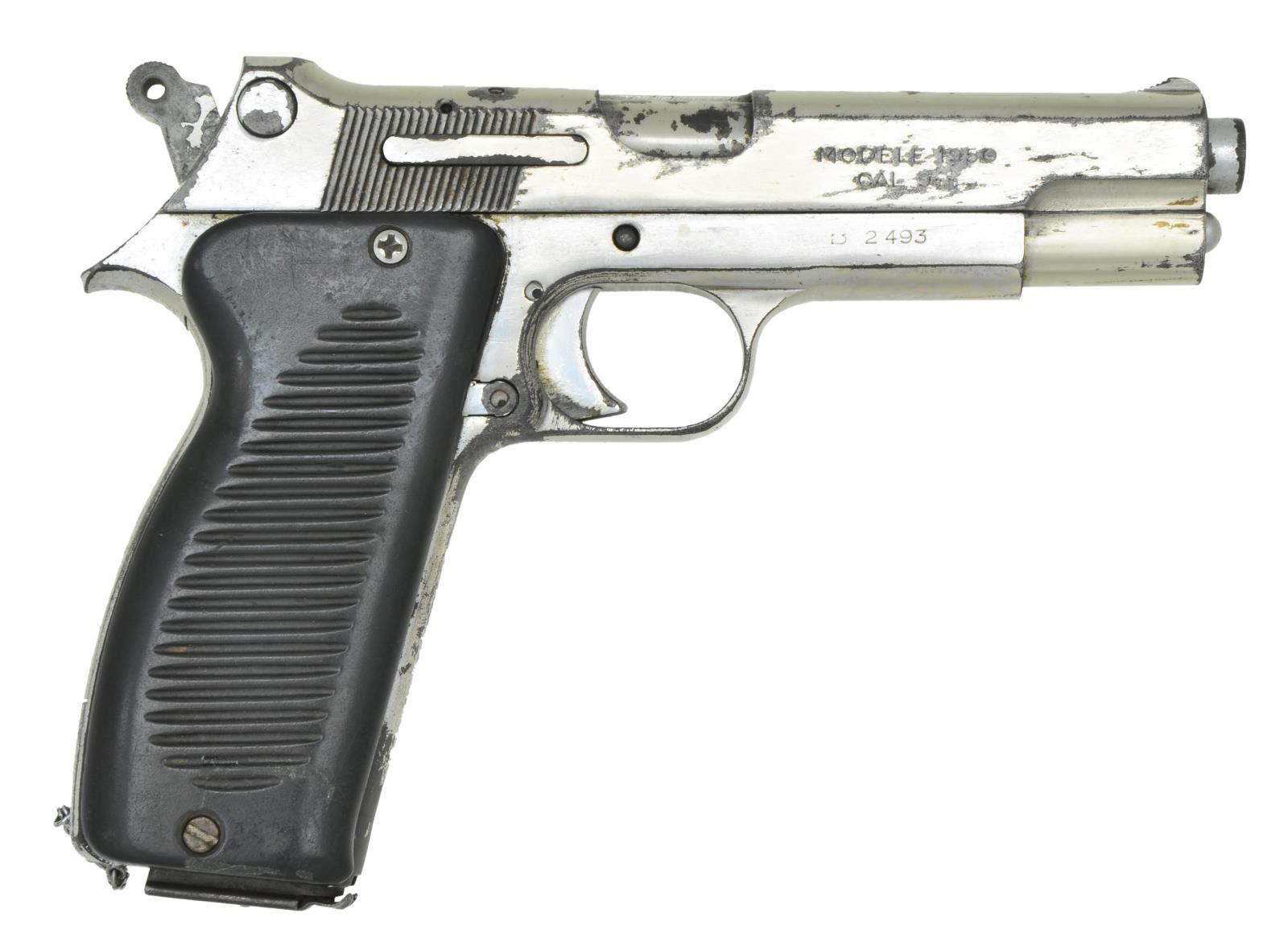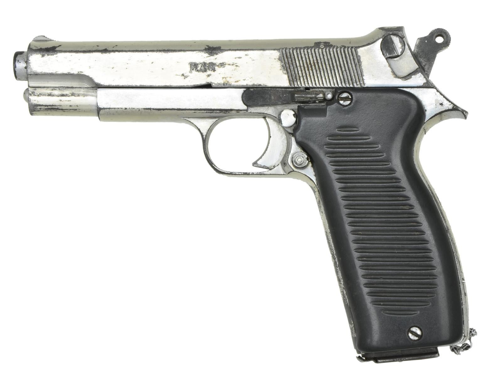 Cal. 9mm. S# B2493. Bbl. 4.5". Mfg. 1953-1960. Chrome plated finish. These single action, self loading pistols were manufactured between 1953 & 1960. They were made in batches of 9999 pistols, each batch given a different letter prefix. This particular piece has the prefix "B" putting its date of manufacture somewhere in the middle of production. Serrated slide w/ fixed sights. Left side controls. Included is a letter stating the following; "Took this pistol & holster off a dead NVA officer following a battle just South of the DMZ in the late Summer of 1967, during Operation Kingfisher. Turned it in to our BJ-SZ and told him I'd like to take it home - Unfortunately that didn't happen. Much later I had a friend of mine check with the BN to see if they still had it - They did - and he brought it home for me - Allbeit in his name." Signed by J.E. Goodrich 1 Lt / Capt (Selectee) in the USMC. 2 piece black plastic grips. Lanyard chain behind magazine. MAGS: 1 steel 9 rd. stamped "1950" on floor plate. UNATTACHED ACCESSORIES: Brown leather flap holster & cleaning rod, Form DD 603 "Registration of Trophy Firearms" dated 19 May, 1971, Original letter from Captain J. E. Goodrich detailing its capture. CONDITION: Chrome finish still covers the majority of the slide & frame though thinning in scattered spots, Thumb safety broken off. Missing firing pin. Grips demonstrate some use but little wear. Lanyard chain still present. Bore is dark but still retains descent rifling. PROVENANCE: From the Lifelong Collection of Glen E. Mattox. (23-102/JZ). CURIO. $800-1,200.