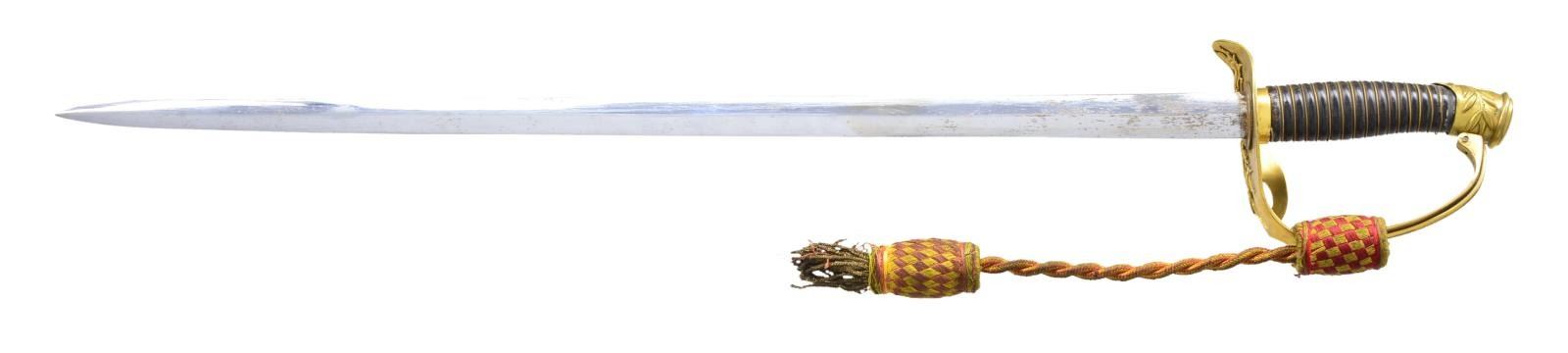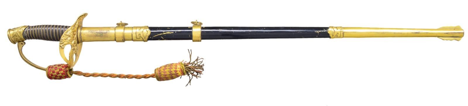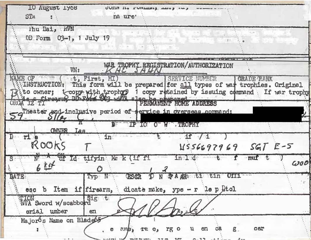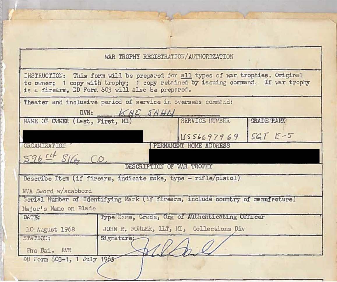 BELONGING TO DAI-TA VO VAN-THANH. A very seldom seen North Vietnamese Officer’s sword with original “WAR TROPHY REGISTRATION\AUTHORIZATION”. The sword was captured by Sgt. Steven R. Brooks at Khe Sahn in 1968. Sword measures 36" overall with a 26 1/4" blade. Plain blade has a raised medial ridge and is engraved near the ricasso “DAI-TA VO VAN-THANH”, which translates to Colonel Vo Van-Thanh. Gilded brass hilt with a foliate & dragon decorated guard. The knuckle bow has a raised ridge and the pommel cap has sprigs of bamboo. Wire wrapped composite grip. Yellow & red sword knot attached. Gilded brass mounted black enameled scabbard. The scabbard is etched near the throat “DAI-TA VO VAN-THANH”. CONDITION: blade shows some original factory polish. Hilt shows much of the original gilding. Grip shows light wear and the knot shows moderate wear. Scabbard shows light wear overall with some loss of enamel on the scabbard body. PROVENANCE: From the Lifelong Collection of Glen E. Mattox. (02-18631/BF). $500-1,000.