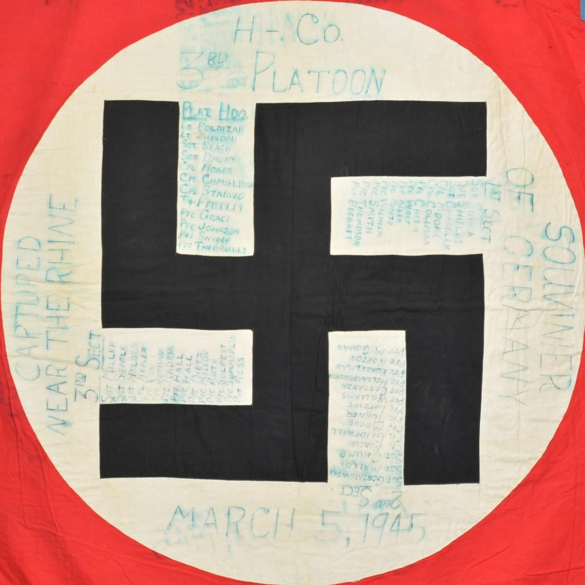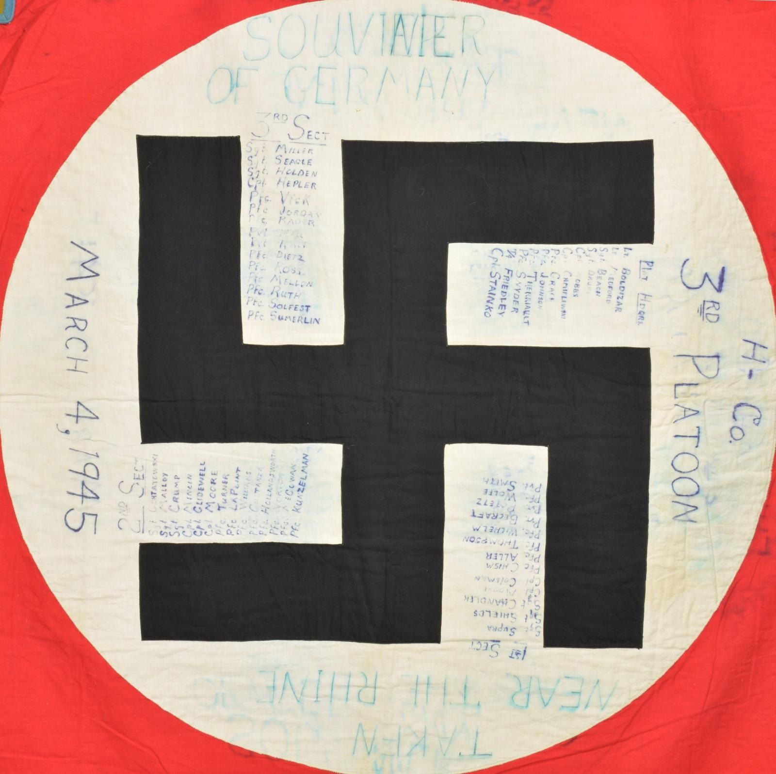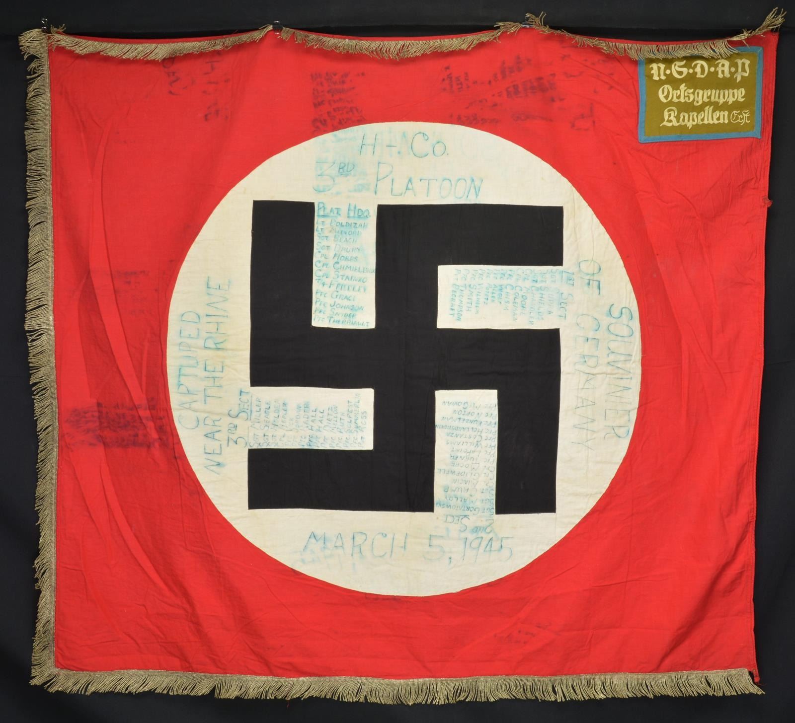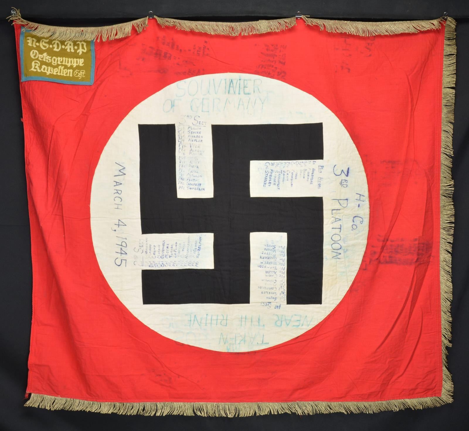 CAPTURED BY “H” COMPANY OF THE 3RD PLATOON NEAR THE RHINE. This exceptionally historic banner is for Ortsgruppe Kapellen, a political district of the N.S.D.A.P. The banner measures 55" x 50", which includes a 1 1/2" silver bullion border on 3 sides. It has a 35" diameter white disc in the center with a black sewn party symbol in the center. The upper left corner has a 6 3/4" x 9 1/4" blue bordered brown rectangle that reads “N.S.D.A.P. Ortsgruppe Kapellen Ersst”. When this banner was captured by American troops nearing the Rhine River the members of “H” Company wrote their names around the flag. The banner reads “TAKEN NEAR THE RHINE H CO 3RD PLATOON MARCH 4, 1945 SOUVENIR OF GERMANY”. The members names are all on the banner in 4 columns titled “PLATOON HEADQUARTERS, 1st SECT, 2nd SECT, & 3rd SECT”. CONDITION: the banner is in very solid condition with no notable tears or losses. The ink used to sign the banner has run somewhat into the edges but the names and titles remain quite clear. A wonderful piece of WWII history. (02-17984/BF). $3,000-5,000.