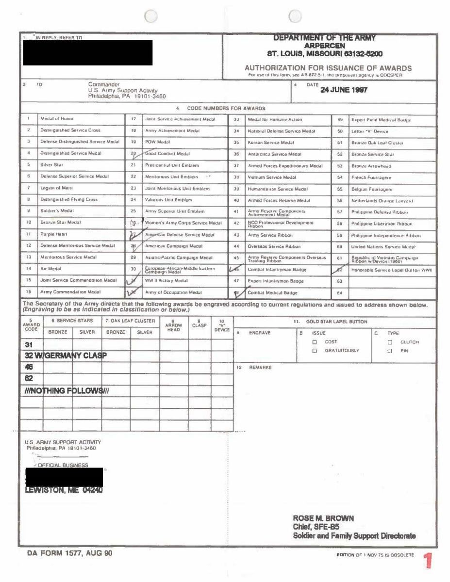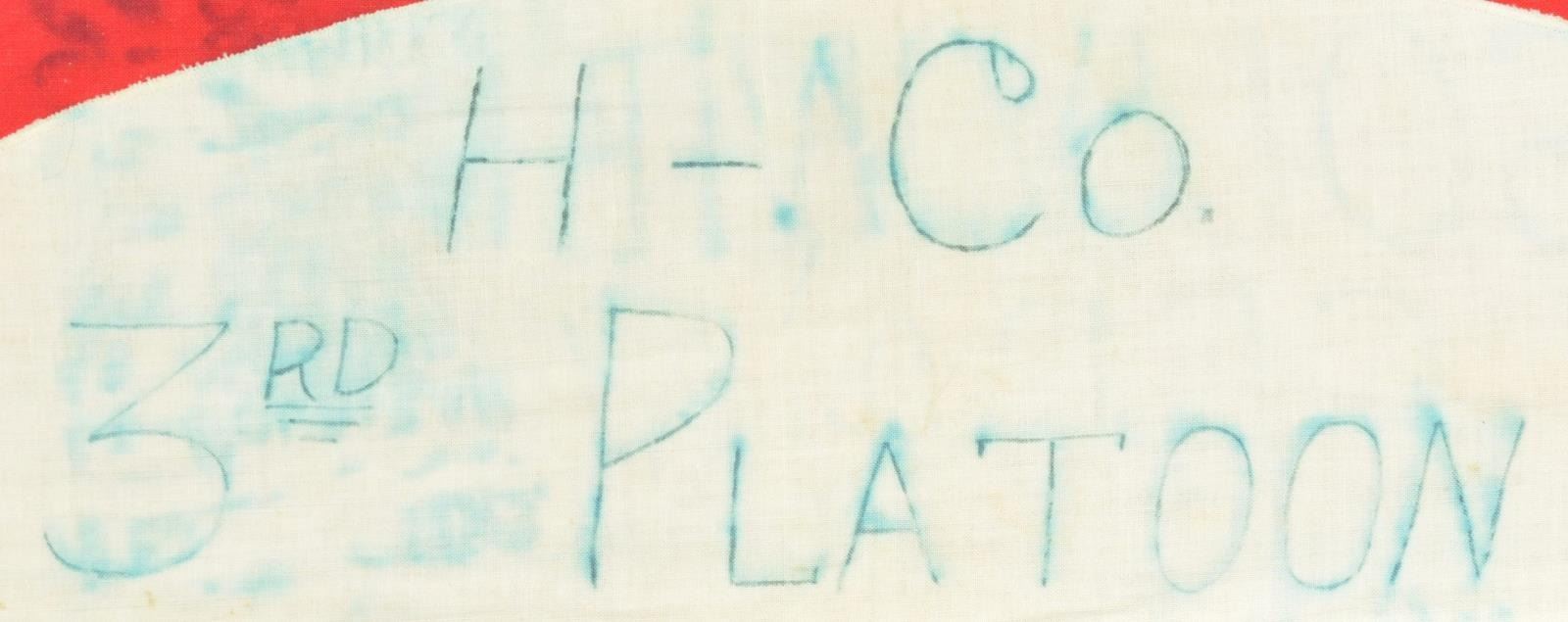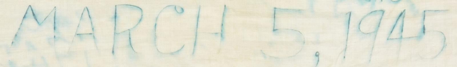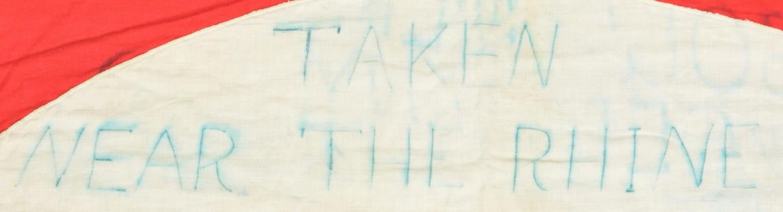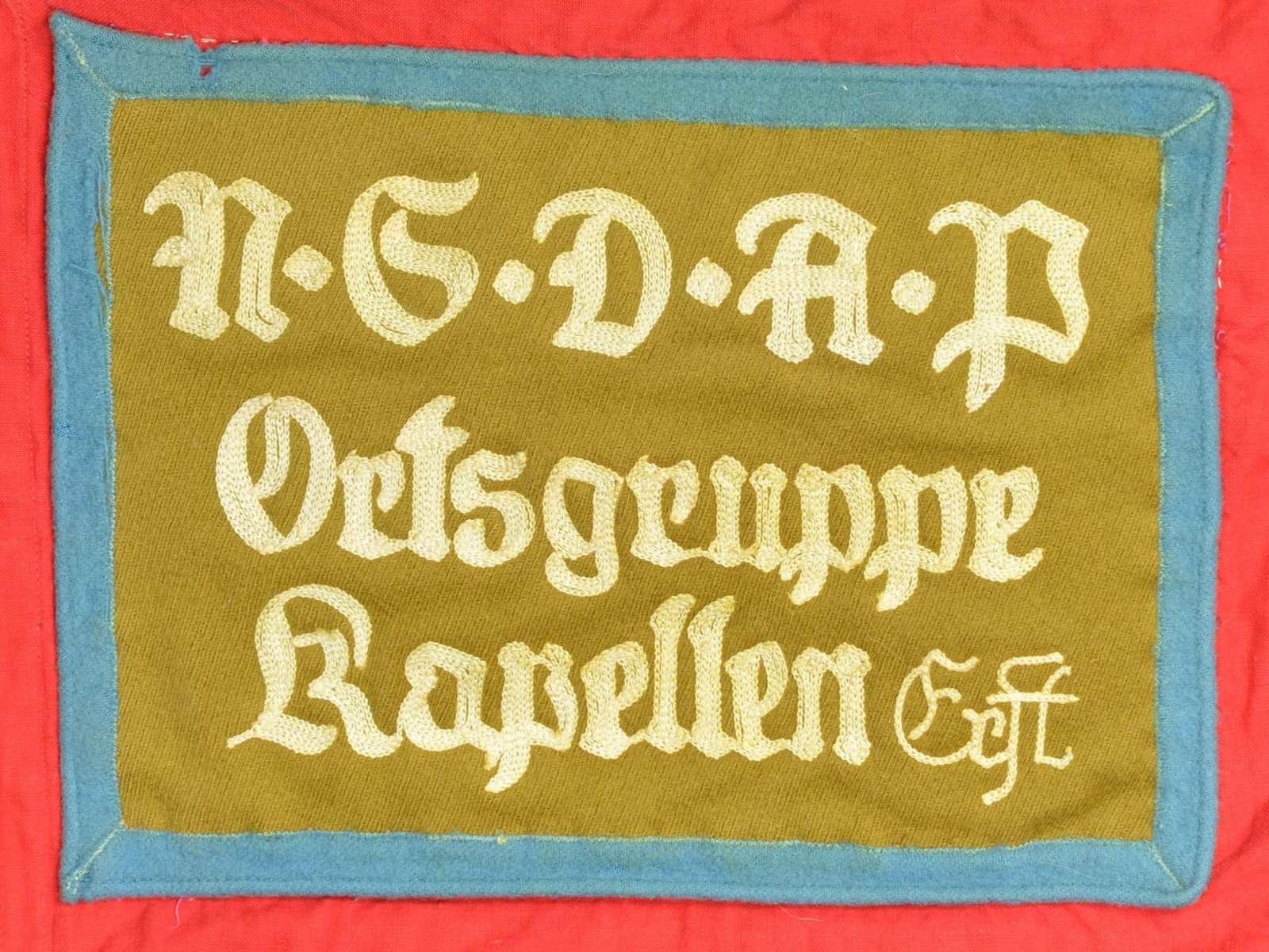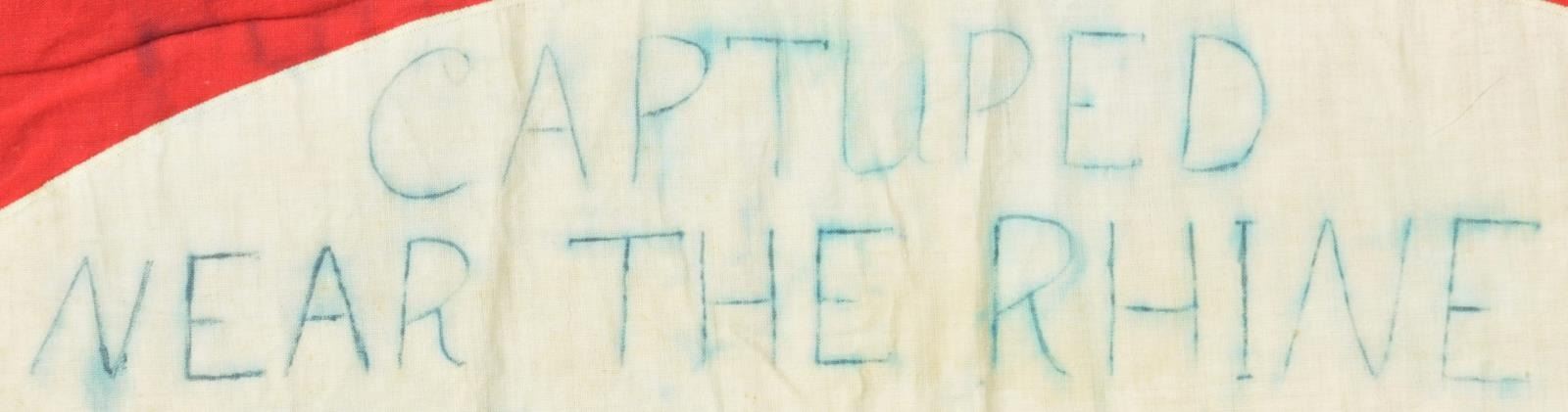 CAPTURED BY “H” COMPANY OF THE 3RD PLATOON NEAR THE RHINE. This exceptionally historic banner is for Ortsgruppe Kapellen, a political district of the N.S.D.A.P. The banner measures 55" x 50", which includes a 1 1/2" silver bullion border on 3 sides. It has a 35" diameter white disc in the center with a black sewn party symbol in the center. The upper left corner has a 6 3/4" x 9 1/4" blue bordered brown rectangle that reads “N.S.D.A.P. Ortsgruppe Kapellen Ersst”. When this banner was captured by American troops nearing the Rhine River the members of “H” Company wrote their names around the flag. The banner reads “TAKEN NEAR THE RHINE H CO 3RD PLATOON MARCH 4, 1945 SOUVENIR OF GERMANY”. The members names are all on the banner in 4 columns titled “PLATOON HEADQUARTERS, 1st SECT, 2nd SECT, & 3rd SECT”. CONDITION: the banner is in very solid condition with no notable tears or losses. The ink used to sign the banner has run somewhat into the edges but the names and titles remain quite clear. A wonderful piece of WWII history. (02-17984/BF). $3,000-5,000.