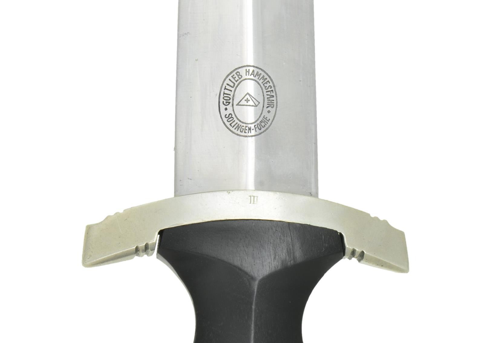 Overall length 14 11/16”. Blade is etched on one side “Meine Ehre Heisst Treue” and is marked near the hilt on the other side “GOTTLIEB HAMMESFAHR (logo) SOLINGEN.FOCHE”. Nickel silver cross guard & pommel with the rear of the cross guard stamped “I I I”. Black wood grip with plated eagle and black enamel SS button. Scabbard has plated mounts on a black anodized body. Hanger is complete. CONDITION: blade shows primarily scabbard wear. Hilt shows light wear. Scabbard has minor wear to the finish with a tiny dent on the reverse. Hanger shows light to moderate wear with some flexing. PROVENANCE: From the Lifelong Collection of Glen E. Mattox. (02-18264/BF). $2,800-3,500.