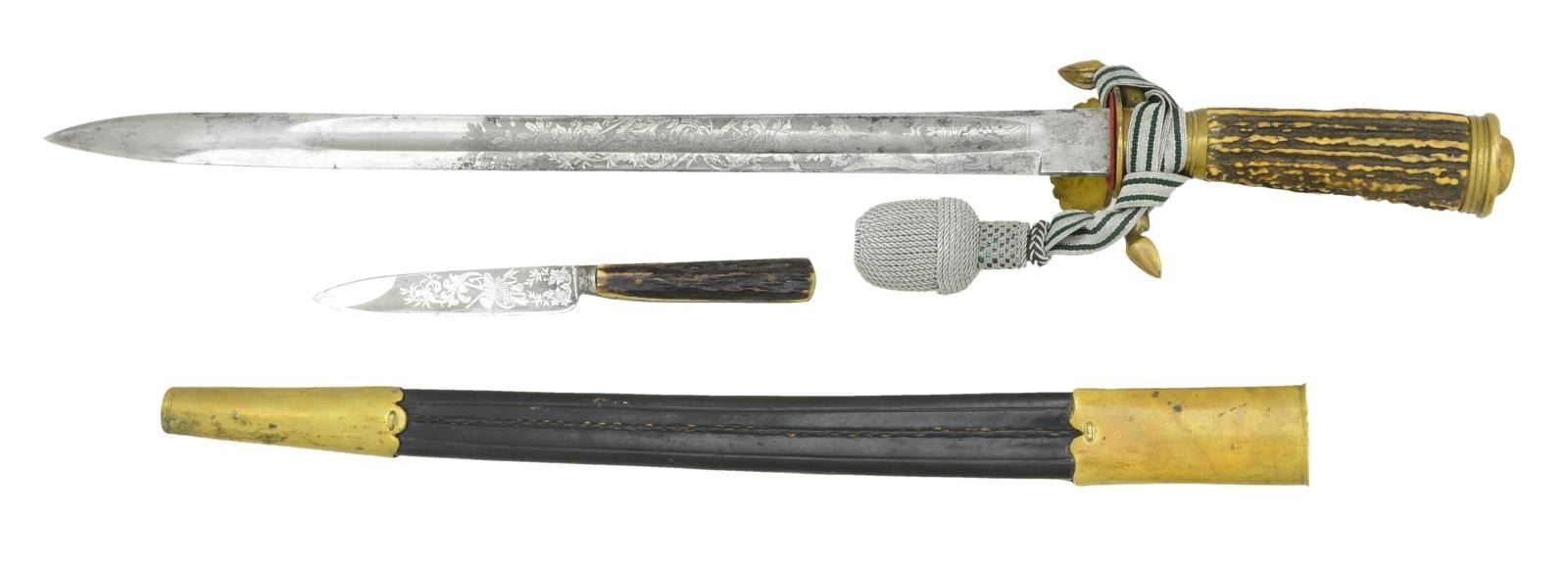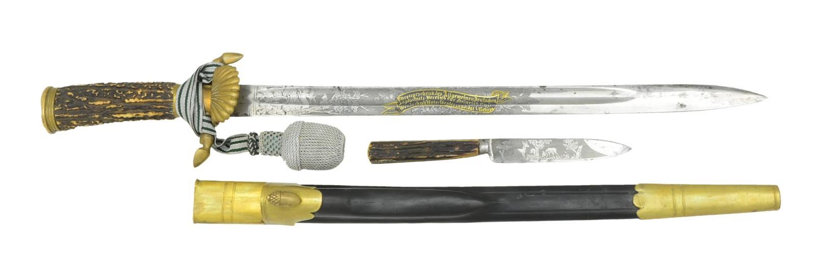 This fine Imperial German presentation cutlass measures 22 1/2" overall. The blade has a single wide fuller and is etched over 8 3/4" of its length. The etching includes foliate & hunting motifs, including a tricolor gold & black panel that reads “Ehrengeschenk des Allgemeinen Deutschen Jagdschutz Vereins fur Heinrich Emil Wendschuh Unterfurstercandidat i/Gebirge”. Gilded brass hilt featuring a cross guard with a downturned shell guard & deer hoof quillons. The pommel has a sleeping dog on the top and the grip is staghorn. The hilt is wrapped with a dark green & silver bullion knot. Gilded brass mounted black leather scabbard has a small 8” knife fitted in the front with engraved hunting scenes on both sides of the blade. CONDITION: blade has a pleasing gray patina with minor staining. Hilt & scabbard show only traces of original gilding. Grip is undamaged. Scabbard shows light wear. The blade does not fit fully into the scabbard and it seems to be blocked near the tip. PROVENANCE: From the Lifelong Collection of Glen E. Mattox. (02-18708/BF). $500-800.