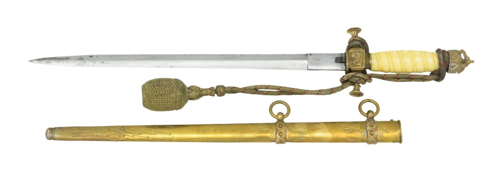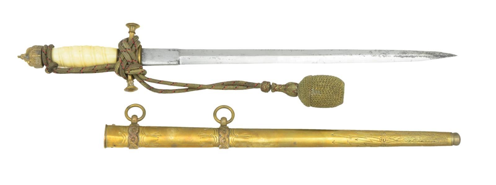 This fine Imperial German Navy dagger measures 19 1/2" overall with a 13 1/4” blade. The blade has a raised medial ridge and is unmarked on the ricasso. Gilded brass hilt featuring a cross guard with central naval anchors and a crowned pommel. The grip is spirally carved white bone and is correctly tied with a gold bullion knot featuring black & red highlights. The gilded brass scabbard has a lightning bolt motif. The belt is silver bullion brocade with a gold Imperial Naval buckle featuring a “W” superimposed on a crowned anchor within a wreath of laurel. CONDITION: blade has a medium gray patina with some evidence of light pitting. The hilt & scabbard show only slight traces of original gilding. The bone grip shows light wear, as does the knot. The scabbard shows wear but remains quite solid. The belt shows very light overall wear. PROVENANCE: From the Lifelong Collection of Glen E. Mattox. (02-18712/BF). $1,000-1,400.