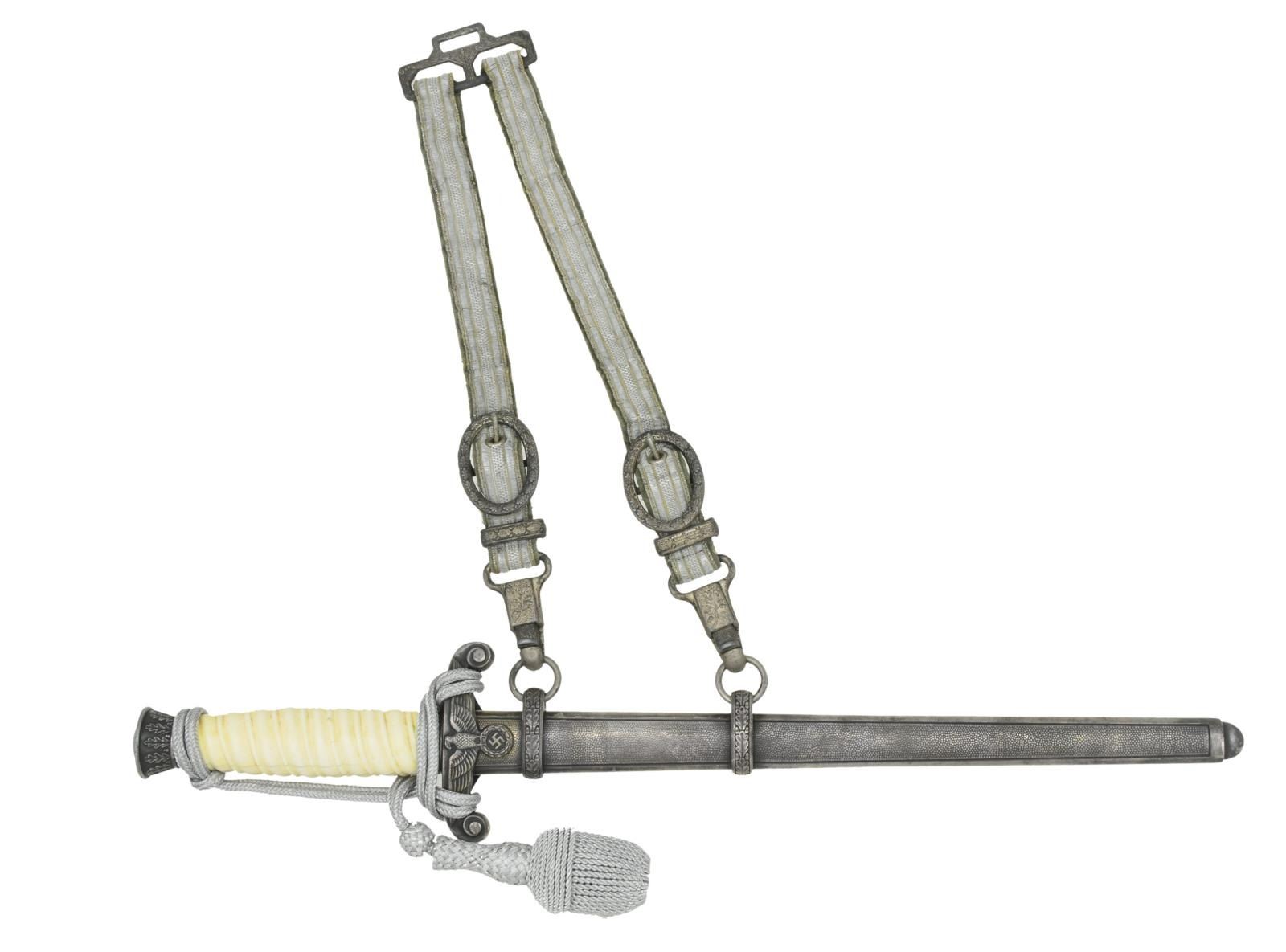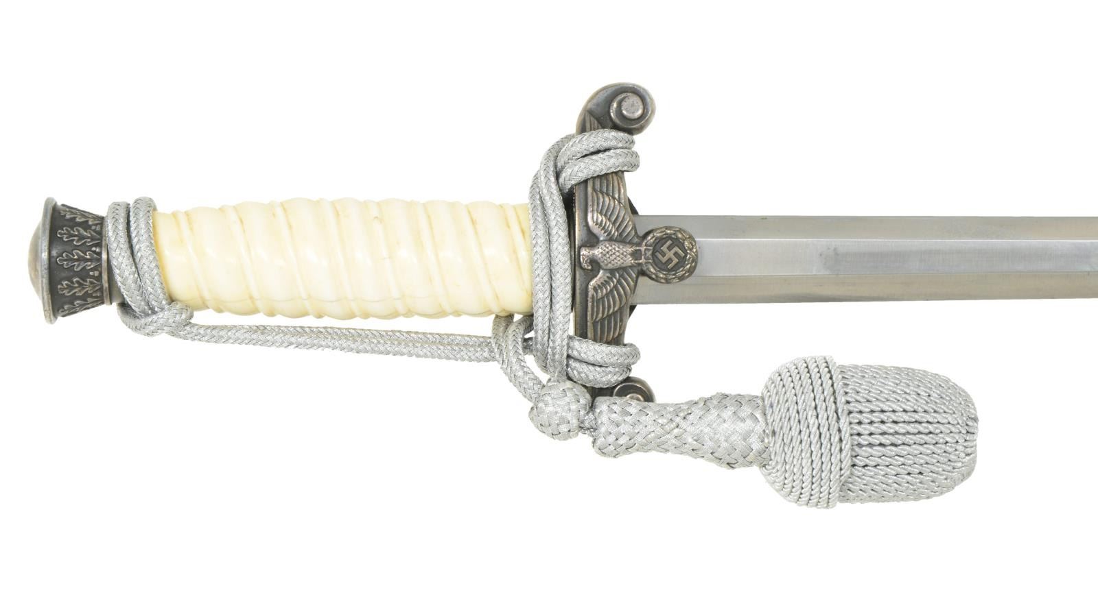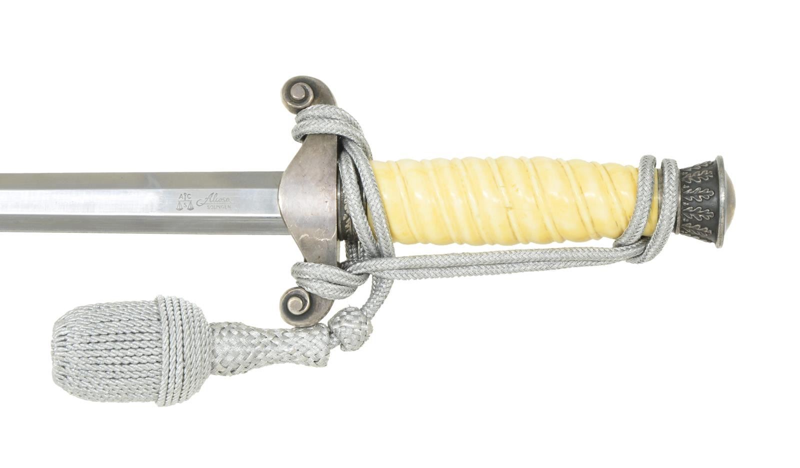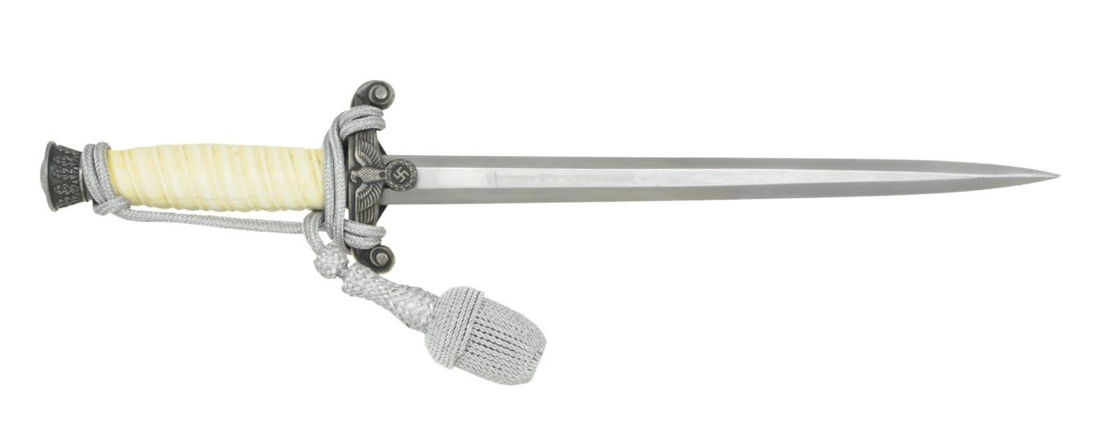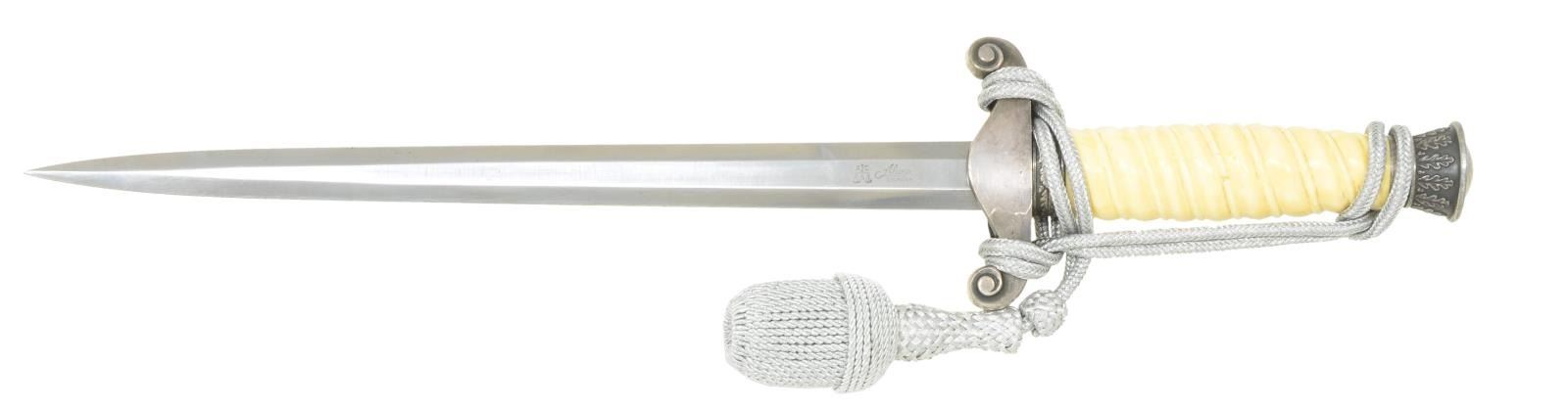 Overall length 15 5/8". Plain blade marked near the ricasso “A C (logo) S Alcosa SOLINGEN”. Plated cross guard with army eagle. Oak leaf embellished pommel & ferrule. Solid ivory grip determined to be elephant ivory dating to the manufacturer of the dagger 1933-45. Dagger also has a correctly tied silver bullion knot attached. Plated scabbard with original hangers intact. CONDITION: blade shows some scabbard wear. Mounts have a pleasing dark tarnished finish. Ivory grip has a few expected drying cracks. Scabbard has a dark tarnished finish. Hangers show light overall wear. PROVENANCE: From the Lifelong Collection of Glen E. Mattox. (02-18279/BF). $800-1,100.