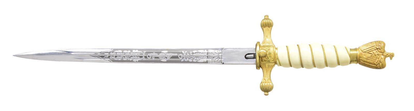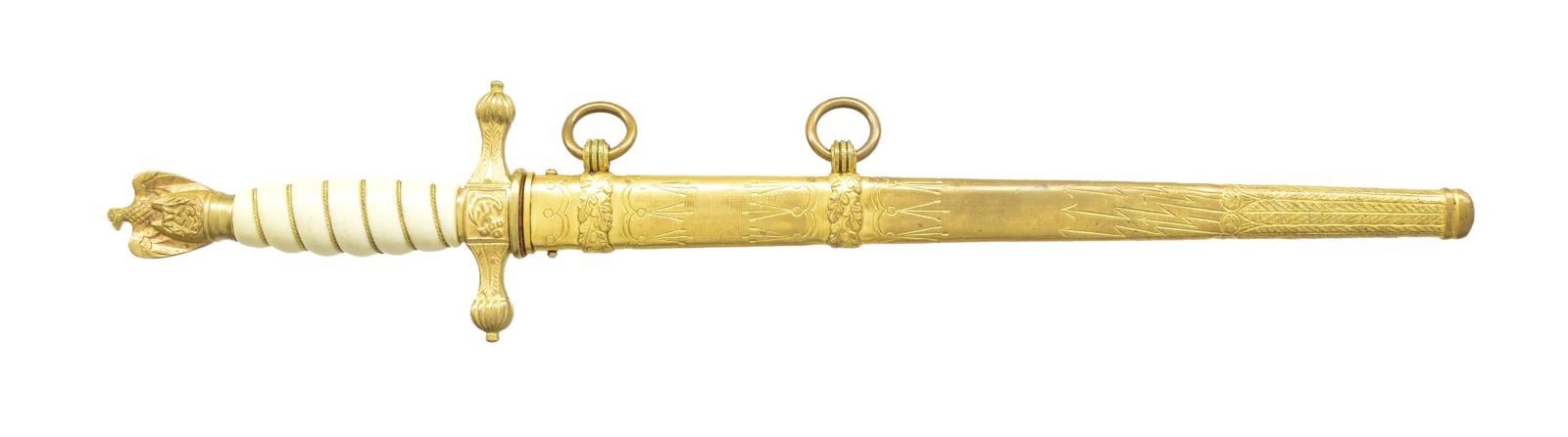 This dagger measures 15 1/4" overall. It has an etched blade featuring nautical & foliate motifs. The blade is marked “E. & F. HORSTER SOLINGEN (logo)”. Gilded brass cross guard & eagle pommel. Gilded brass wire wrapped white grip. Gilded brass scabbard with lightning bolt motif. CONDITION: blade shows substantial original factory polish. Gold plating on hilt is nearly 100%. Grip is undamaged. Scabbard has more than 50% of the original gilding intact. Truly a fine example of a scarcer dagger. (02-17933/BF). $800-1,100.