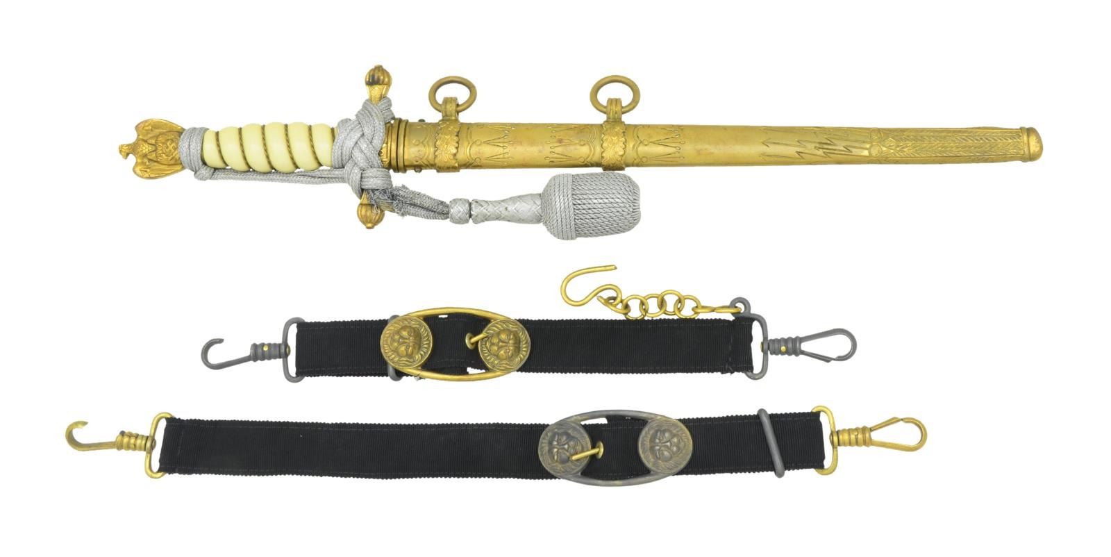 Overall length 16 1/2". The double fullered blade is etched over most of its length with nautical & foliate motifs. The ricasso is stamped near the hilt “(squirrel) ORIGINAL EICKHORN SOLINGEN”. Gilded brass hilt with anchors in the center of the cruciform guard. Eagle pommel & wire wrapped white grip. There is an intricately tied knot around the hilt. Gilded brass scabbard of standard lightning bolt motif. The dagger includes one hanger strap for a dagger and one for a sword. CONDITION: blade shows some scabbard wear. Hilt shows light overall wear, but knot shows heavy wear. Scabbard has traces of original and shows several small dents concentrated near the tip. Both hangers have one non-functional clip. PROVENANCE: From the Lifelong Collection of Glen E. Mattox. (02-18281/BF). $700-900.