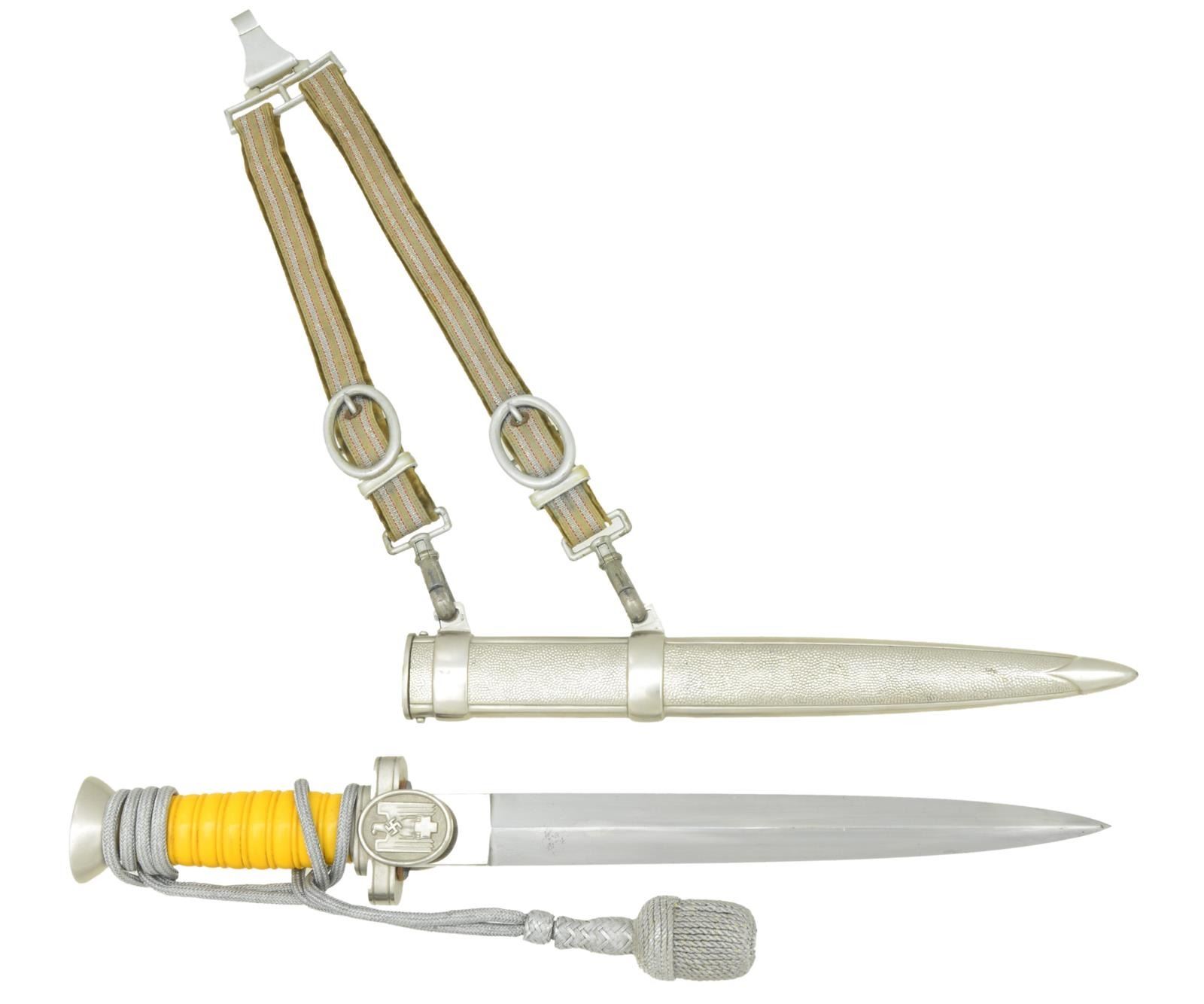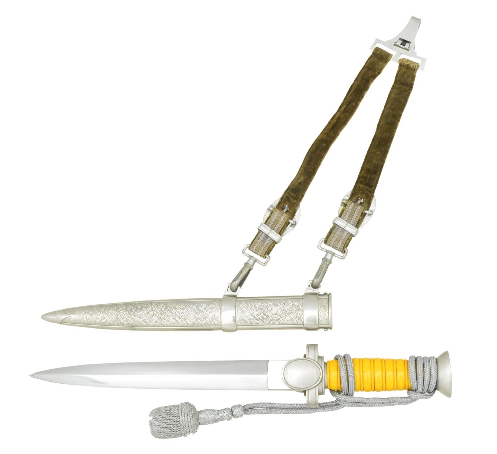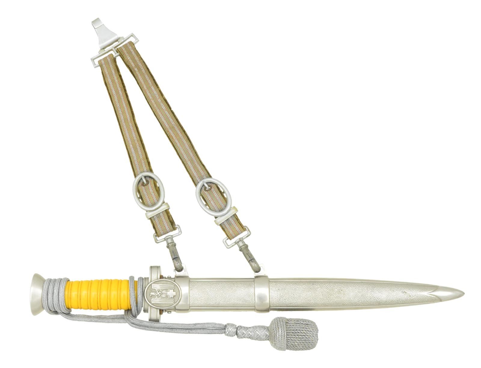 Overall length 15 1/8”. Plain blade with raised medial ridge and no marking at the ricasso. Nickel silver cross guard & pommel with oval languets. The front languet bears a WWII German red cross eagle. Deep yellow composite grip with attached knot. Plated scabbard with rare original dagger hanger. CONDITION: blade shows exceedingly small traces of discoloration. Hilt, grip & knot show light wear. Scabbard also shows light wear and hangers show visible wear to the clips, but the straps remain strong & vibrant. PROVENANCE: From the Lifelong Collection of Glen E. Mattox. (02-18270/BF). $1,200-1,600.