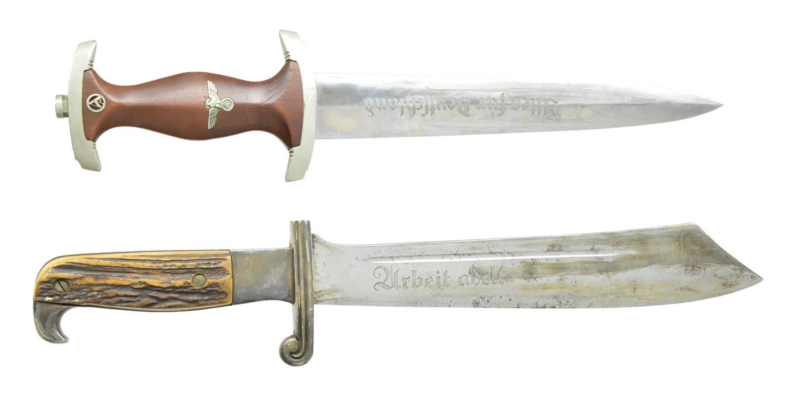 2) RAD. Overall length 15 5/8". A good example of a Reichsarbeitsdienst hewer. Blade is etched “Arbeit adelt” on one side and is marked “R J A D (in triangle) GES. GESCH CARL JUL KREBS SOLINGEN (logo)” on the other. Plated guard, ferrule, backstrap & beak. 2 piece staghorn grip. Black enameled metal scabbard with plated mounts. CONDITION: blade shows scabbard wear and some discoloration. There is also some evidence of sharpening, though it is not offensive. Hilt & scabbard show light to moderate wear. Scabbard body has about 96% original enamel. (02-17935/BF). $900-1,300.