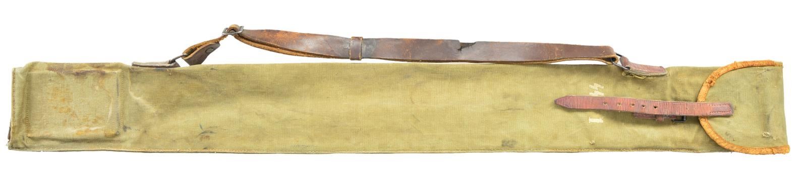 A truly superb example of a rare early WWII German SS sword for an NCO. Overall length 39 1/2". Blade length 33 1/8". Plain blade with a single fuller marked at the ricasso “PET.DAN.KREBS (logo) SOLINGEN”. The other side of the ricasso has the owner’s initials “H B” engraved in a stylistically pleasing manner. White leather washer is intact. Plated hilt with plain 3 sided knuckle bow. There is an oak leaf ferrule surrounding the base of the grip and an “SS” topped pommel at the top of the grip. There are “SS” marks on the underside of the guard as well as on the throat of the scabbard. Black ribbed grip with attached black & silver sword knot. Scabbard has a black enamel finish with a plated throat. The original sword hanger is attached. This sword is housed in a “make-do” carrying case that appears to be adapted from a machine gun barrel carrying pouch. The outside of the green canvas pouch is stenciled “SS T 1”. The case has the original leather carrying strap intact. CONDITION: blade has original finish with no staining or damage. Hilt shows light wear overall. All markings and SS proofs are sharp & clear. Grip shows very light wear. Scabbard has some scratches to the finish but remains quite solid & attractive. Hanger has some finish loss but shows no notable damage. Case shows moderate wear. PROVENANCE: From the Lifelong Collection of Glen E. Mattox. (02-18268/BF). $4,000-5,000.