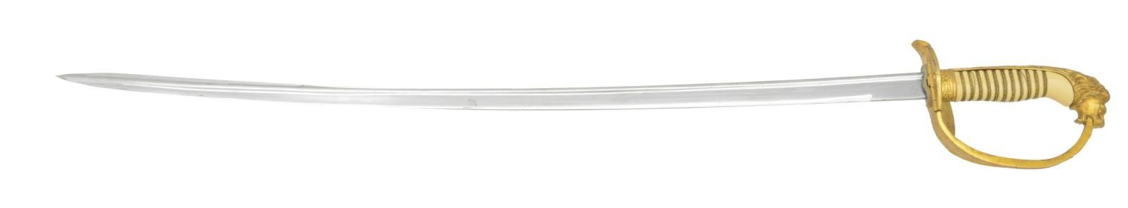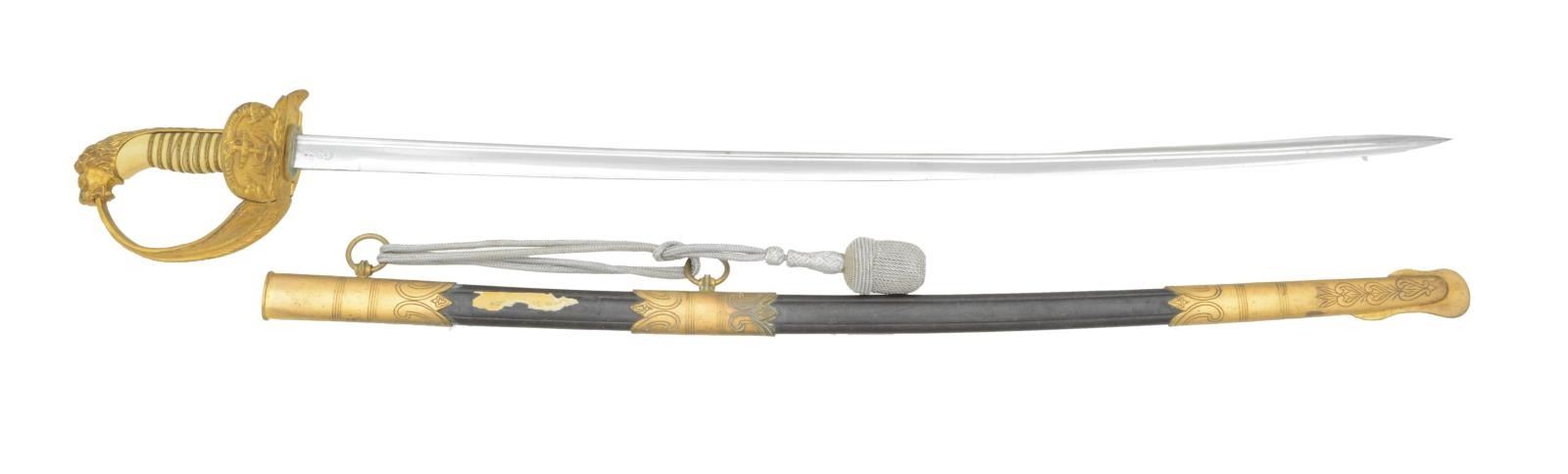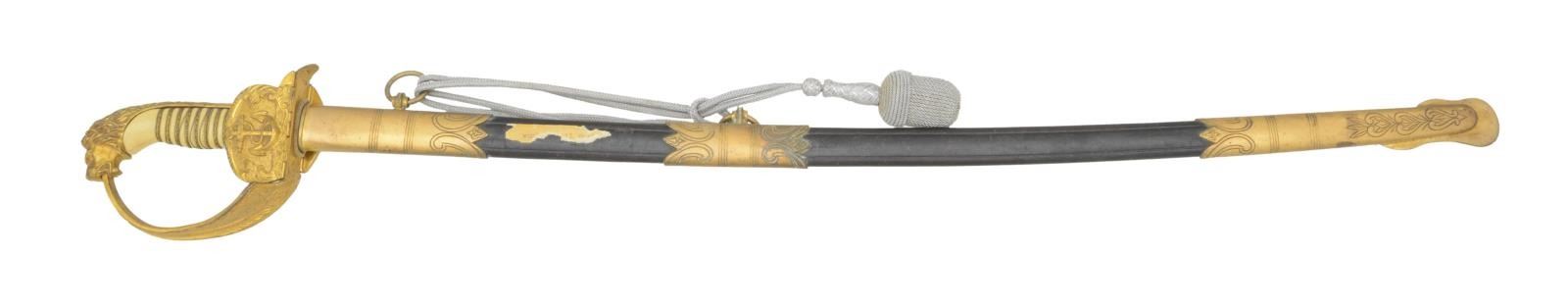 Overall length: 33 1/2". Blade length: 27 1/2". Plain blade with a quillback. Blade is stamped near the hilt “(knight’s head) WKC”. Gilded brass hilt with a large folding guard depicting an anchor and scrollwork. The rear smaller locking folding guard is stamped with a WWII Naval eagle over “M” & “N2732”. Decorated knuckle bow & lion head pommel. Oak leaf & acorn adorned ferrule with lion’s mane backstrap. Cream colored composite grip with multi-strand wire wrap. Gilded brass mounted leather scabbard with the matching serial number stamped on the throat. There is a silver sword knot tied between the suspension rings. CONDITION: blade has original factory polish, but should have its protective coating removed. Hilt retains nearly all of its original gilded finish. Grip is undamaged. Scabbard body is quite solid and the mounts retain 80% of their original gilded finish. Knot shows light wear. The scabbard has a partial paper tag attached. (02-19558/BF). $1,000-1,400.
