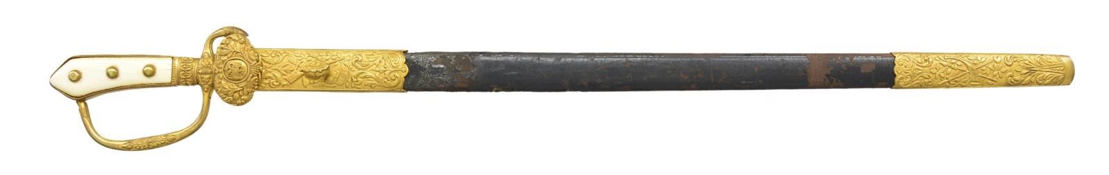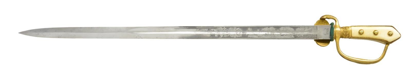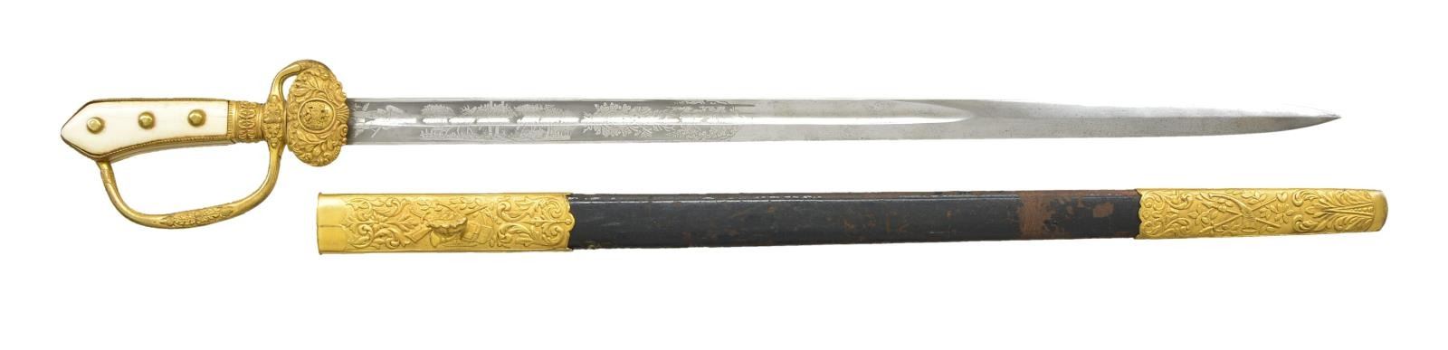 SWORD. Overall length: 30 1/2". Blade length: 24 3/4". The blade has a single large fuller & a raised medial ridge. It is etched over 10” of its length with superbly executed hunting & forest scenes. The ricasso is stamped “Wien Weyersberg & Stamm Solingen”. Gilded brass hilt with a turned down foliate decorated guard featuring an Austrian eagle in the center. Deer hoof quillon with oak leaf decorated knuckle bow & ferrule. 2-Piece bone grip with 3 rounded brass studs on each side. Gilded brass highly decorated scabbard mounts on a black leather body. CONDITION: blade has a pleasing light gray finish, and etching remains quite clear and striking. Hilt retains most of its original gilded finish and the bone grips show tight age cracks. Scabbard mounts retain nearly all of their original gilding. Leather is solid but a bit flaked. PROVENANCE: From the Lifelong Collection of Glen E. Mattox. (02-18709/BF). $1,000-1,500.
