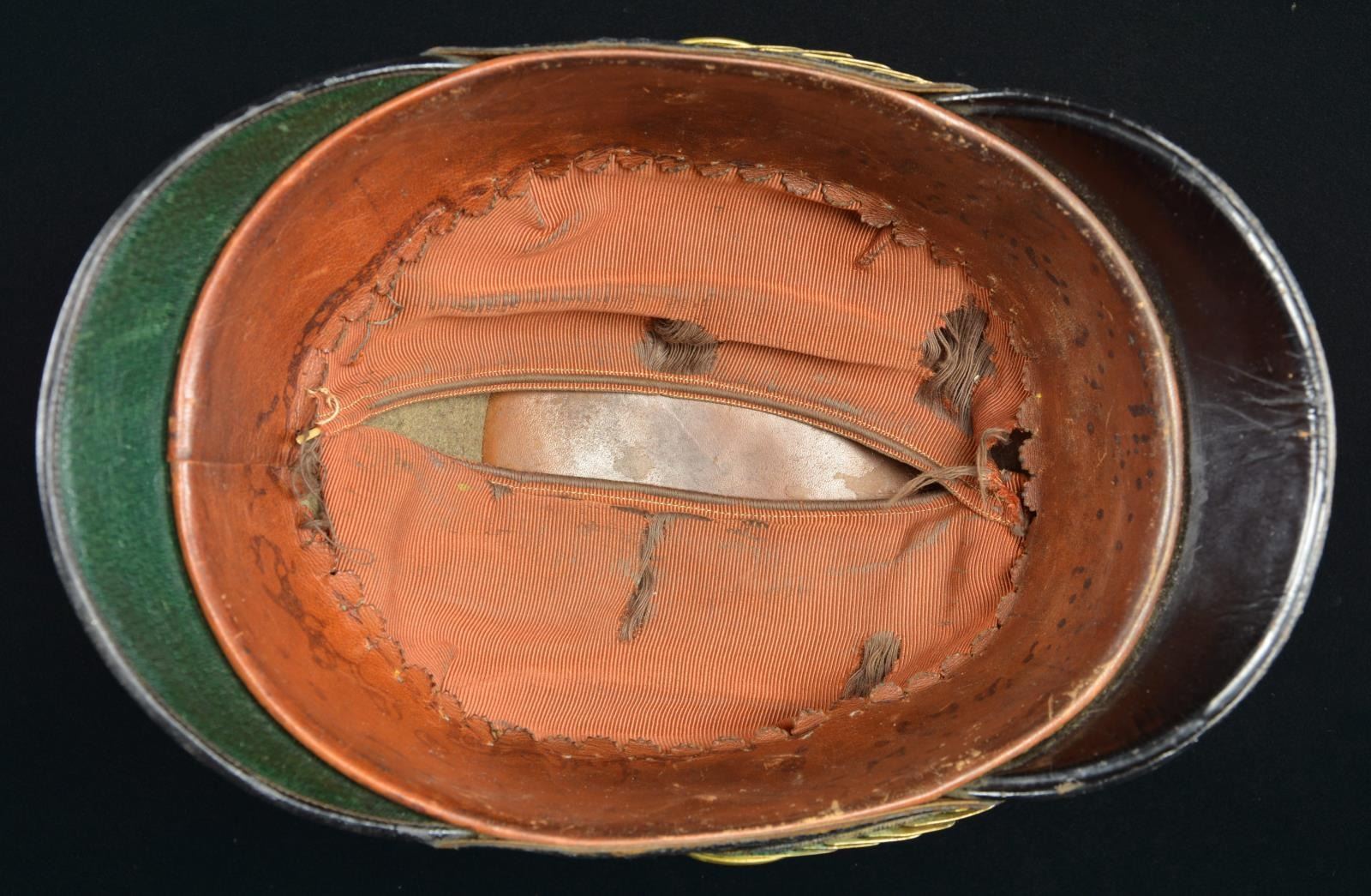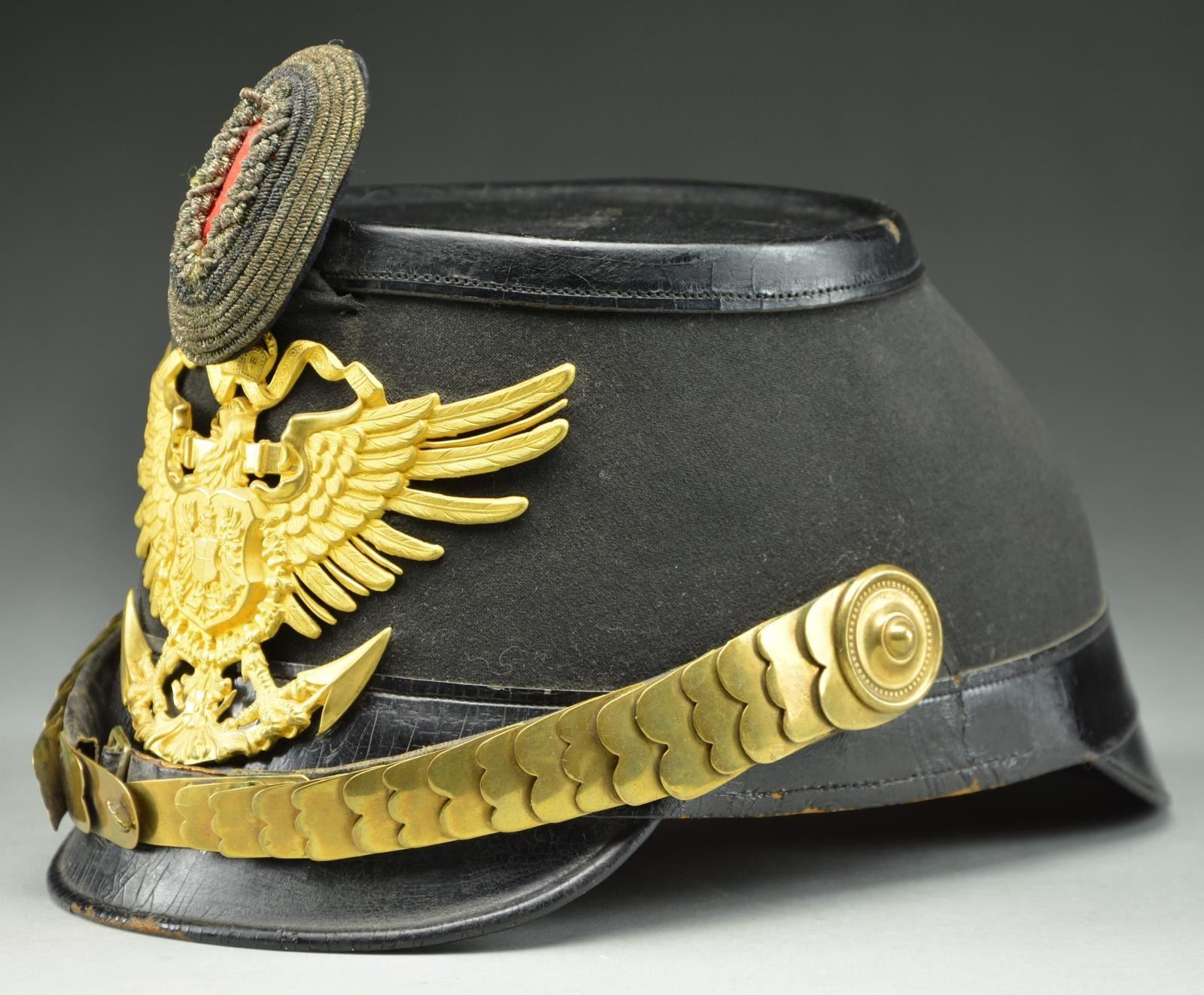 A superb example of a rare Seebataillon or Naval Infantry shako of the Imperial German Forces. This shako has a black leather body covered in fine black felt. Both the front & rear visors are black leather, as is the crown. There is an exceptional heavily gilded Seebataillon front plate attached to the front. A finely done silver bullion navy field badge with black ring and red center is mounted above the eagle. The chinstrap features flat scalloped scales alternating between 2 and 3 scallops throughout the length of the chinstrap. The chinstrap buckles in the front and is terminated by 2 decorative round side bosses. The interior of the front visor is black and the rear visor is green. Wide brown leather scallop topped sweatband with 2-piece red silk liner. CONDITION: shako shows light wear overall. Visors are strong. Field badge is solid. Front plate is extraordinary. PROVENANCE: From the Lifelong Collection of Glen E. Mattox. (02-18704-6/BF). $2,000-3,000.
