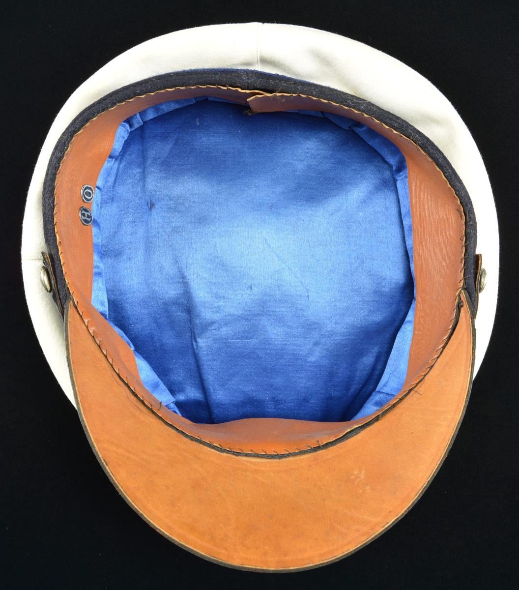 This rare cap has an exceedingly finely woven white wool crown with a navy-blue mohair band. The crowned wreath on the front, with cockade, is intricately done gold & silver bullion. Black leather chinstrap is terminated by silver Imperial Navy buttons. Black visor has a brown underside. Brown sweatband with the initials “OH” attached to one side. Bright blue silk lining. CONDITION: hat shows virtually no moth damage. White crown is a bit dirty. Visor has a few heat lines. Bullion is lightly tarnished. Interior shows light wear. PROVENANCE: From the Lifelong Collection of Glen E. Mattox. (02-18704-3/BF). $1,500-2,250.