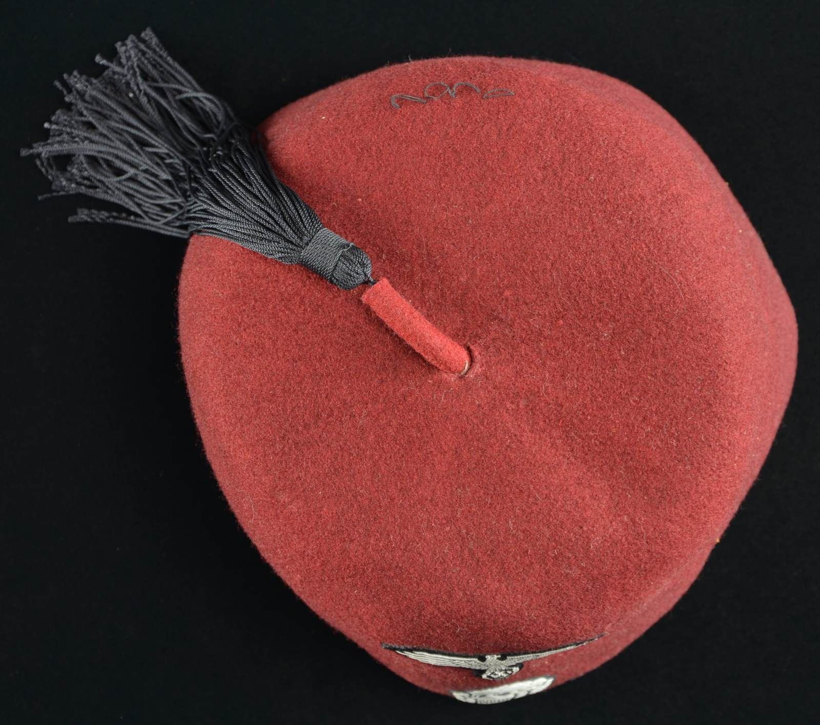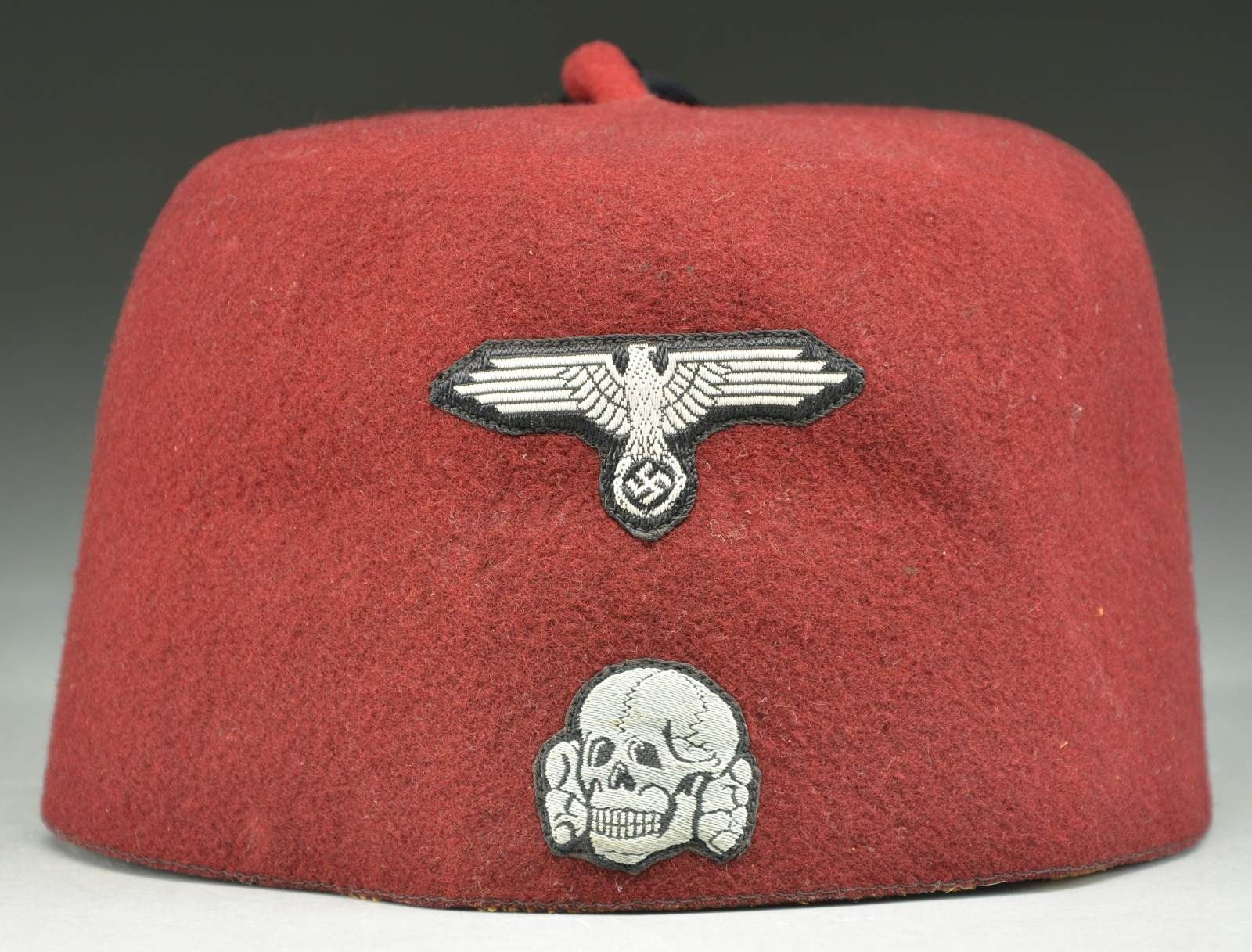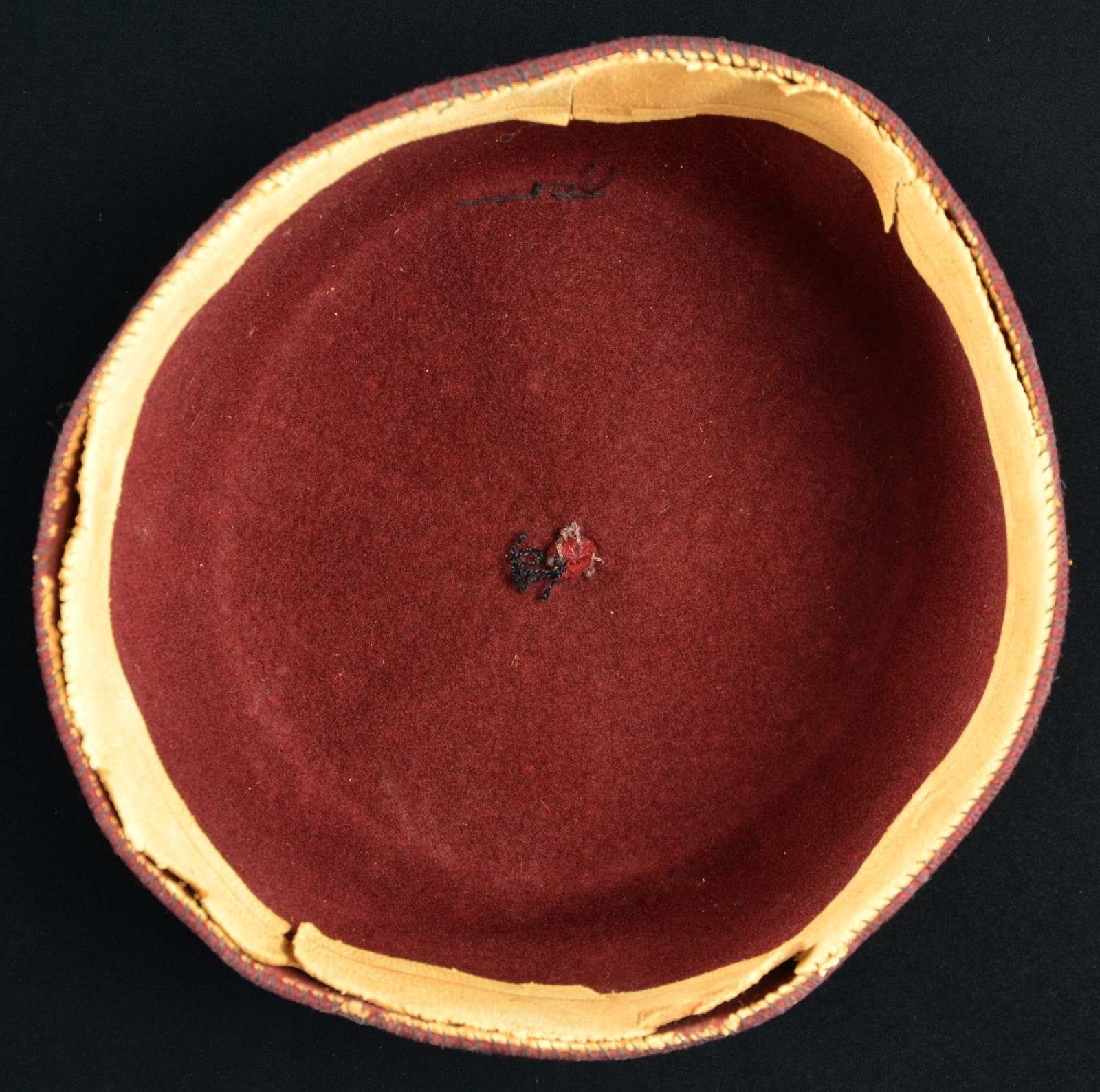 This seldom seen type of Waffen SS headgear is commonly ascribed to the 13th Handschar (1st Croatian) Waffen SS Division of Croatia. It was also worn by the 23rd Kama Waffen SS Mountain Division. The word "handschar" is a local Bosnian Muslim term for a curved scimitar. This dress fez is made of a red/maroon felt and was intended to be worn with the SS dress uniform. It features a small 1" rolled piece of felt at the crown with a black tassel attached. The front features a black and white bevo Death's Head skull with SS eagle above. The interior has a 1 1/4" tan leather sweatband embossed “Carlartz”.