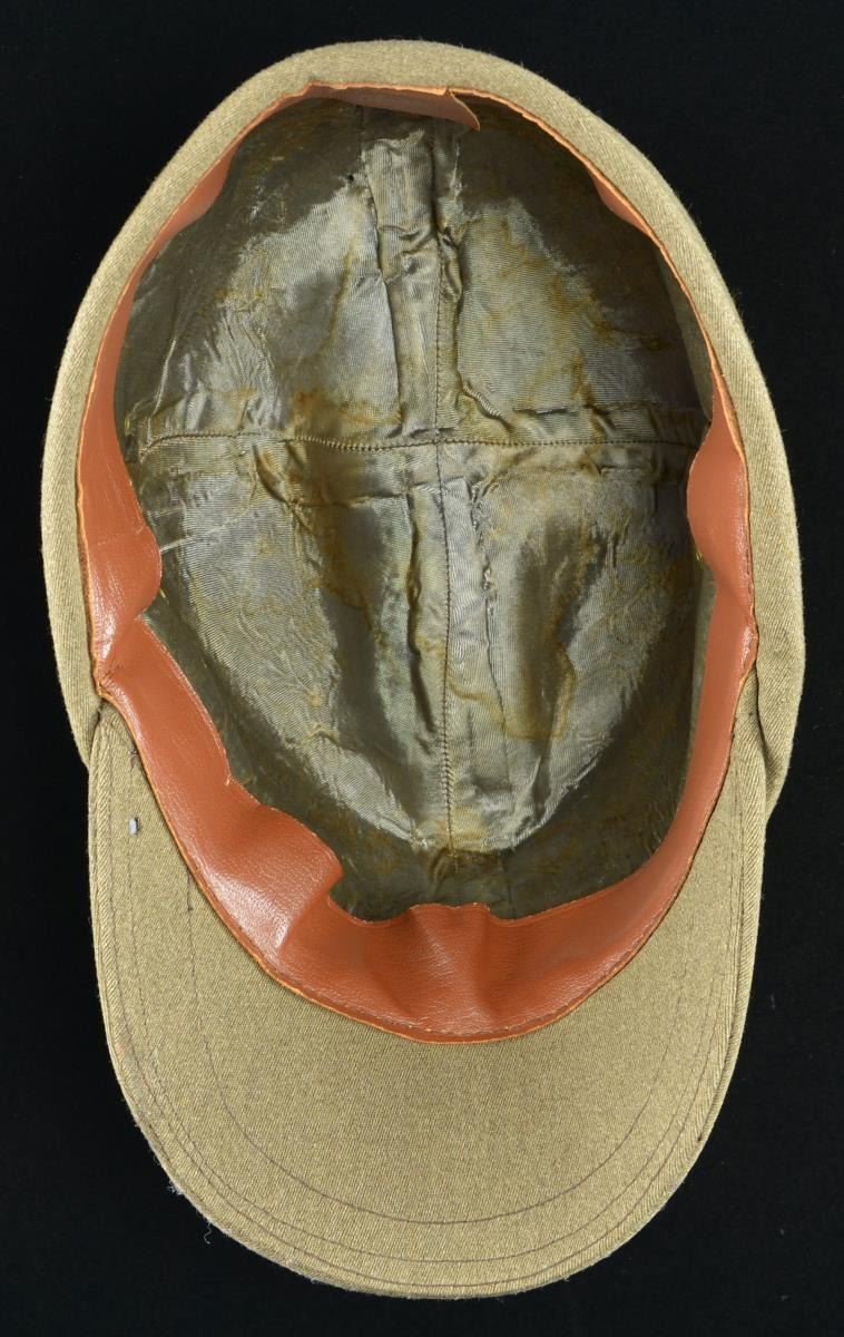 A dull field green RAD officer’s grade cap, often referred to as a “Robin Hood” cap. Cap is a fine grade wool with the body constructed in 4 pieces. The ear flaps & visor have silver bullion piping. There is a brown 2” cloth strip in the front with an enameled RAD insignia. There are 2 vent holes on either side of the body. Brown leather-like sweatband with gray-green rayon lining. CONDITION: there is one noticeable moth nip towards the rear crown of the cap. Sweatband shows light wear and there are significant sweat stains on the interior. PROVENANCE: From the Lifelong Collection of Glen E. Mattox. (02-18247/BF). $400-700.