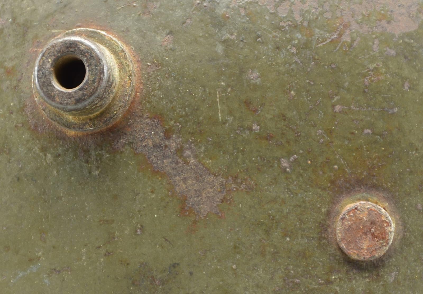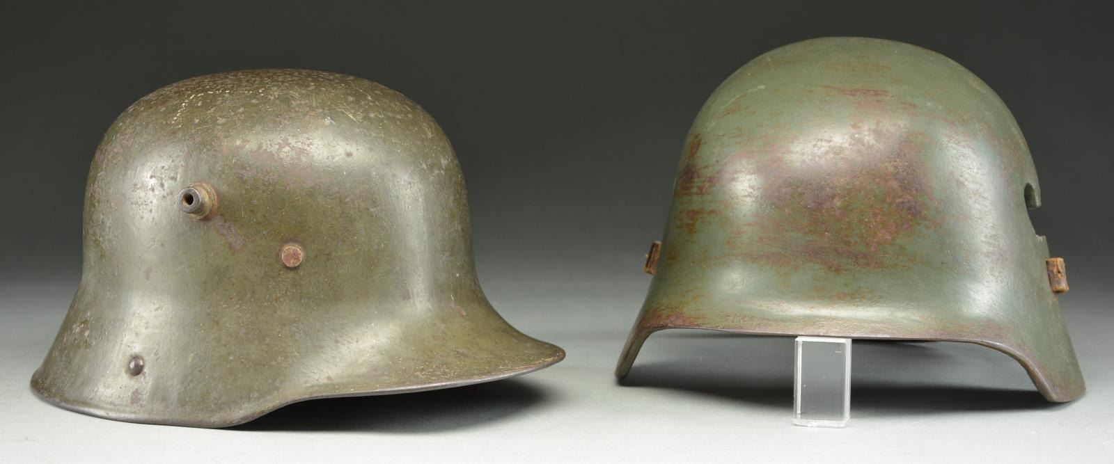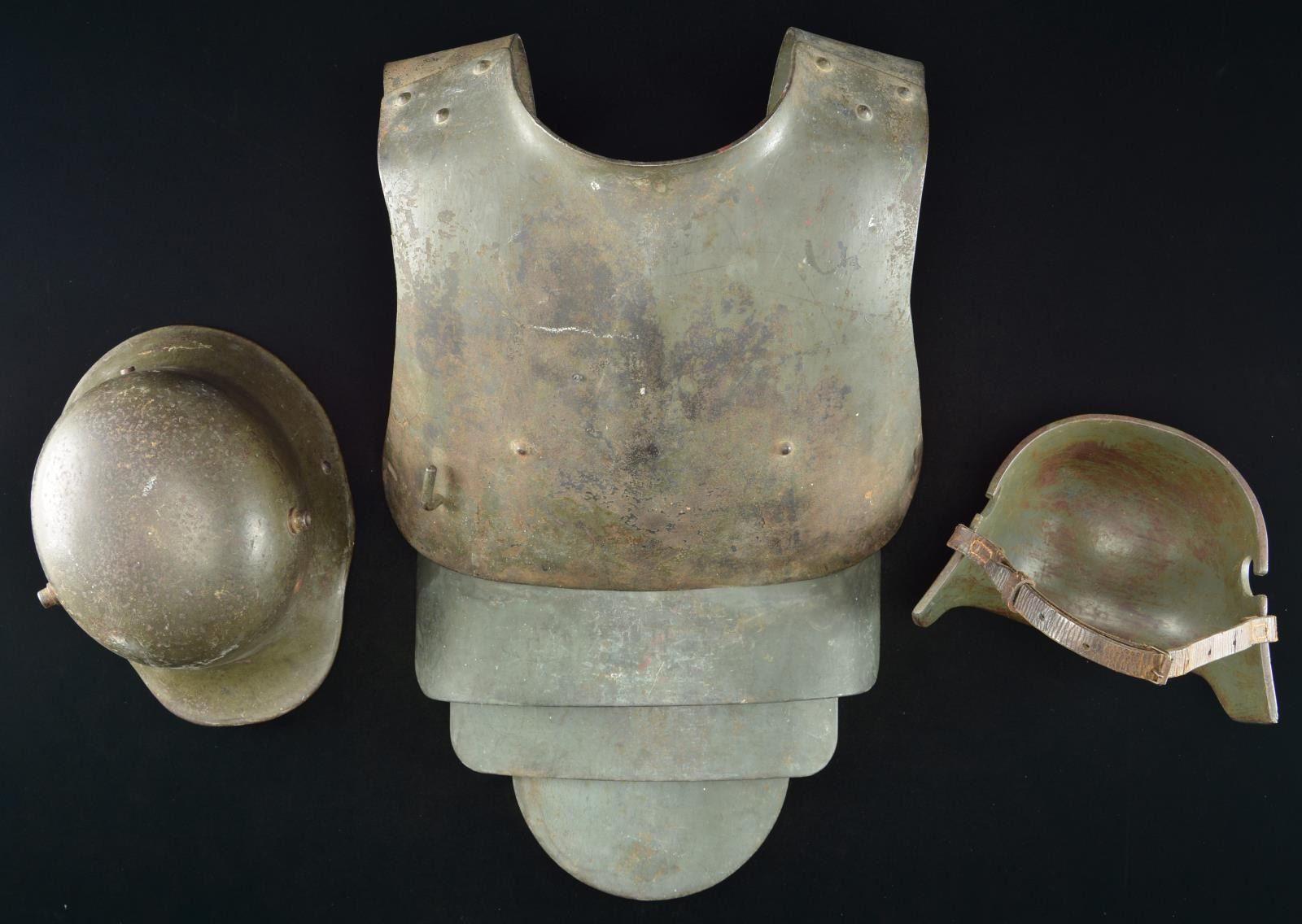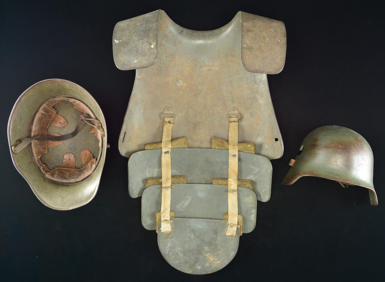3) CHEST PLATE. A WWI German machine gunner’s chest plate with full lower 3-plate armor. Chest plates are difficult to find, but nearly impossible with the 3 lower protection plates intact. The lower plates are attached with heavy cotton canvas straps and there is thick square felt pads in between each plate. The complete armor set was quite effective in protecting German machine gunners from small arms fire. UNATTACHED ACCESSORIES: this armor set comes with a custom built display rack for the chest plate, helmet & stirnpanzer. CONDITION: chest plate has a dark green painted finish with areas of oxidation. The 3 lower plates have a lighter green painted finish and also show areas of oxidation. The lower 3 plates are partially separated from the body due to aging of the attachment straps. No pieces are missing and once the straps are reinforced, the appearance will be exceptional. PROVENANCE: From the Lifelong Collection of Glen E. Mattox. (02-18905/BF). $1,000-2,000.
