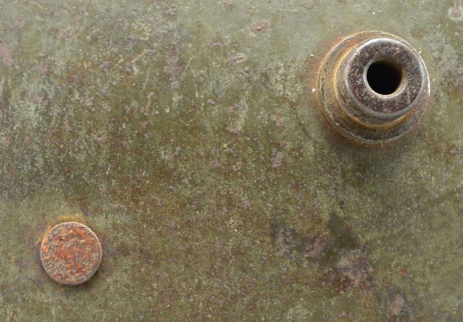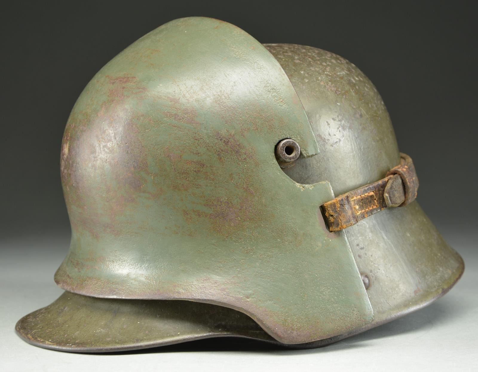 2) STIRNPANZER. A sniper’s brow shield worn with the M1916/17 or the M1918 German steel helmet. Heavy iron plate has much of the original finish remaining. Heavy leather attachment straps on each side of the stirnpanzer. CONDITION: there is oxidation to the finish but no notable damage. Leather is flexed but remain solid.
