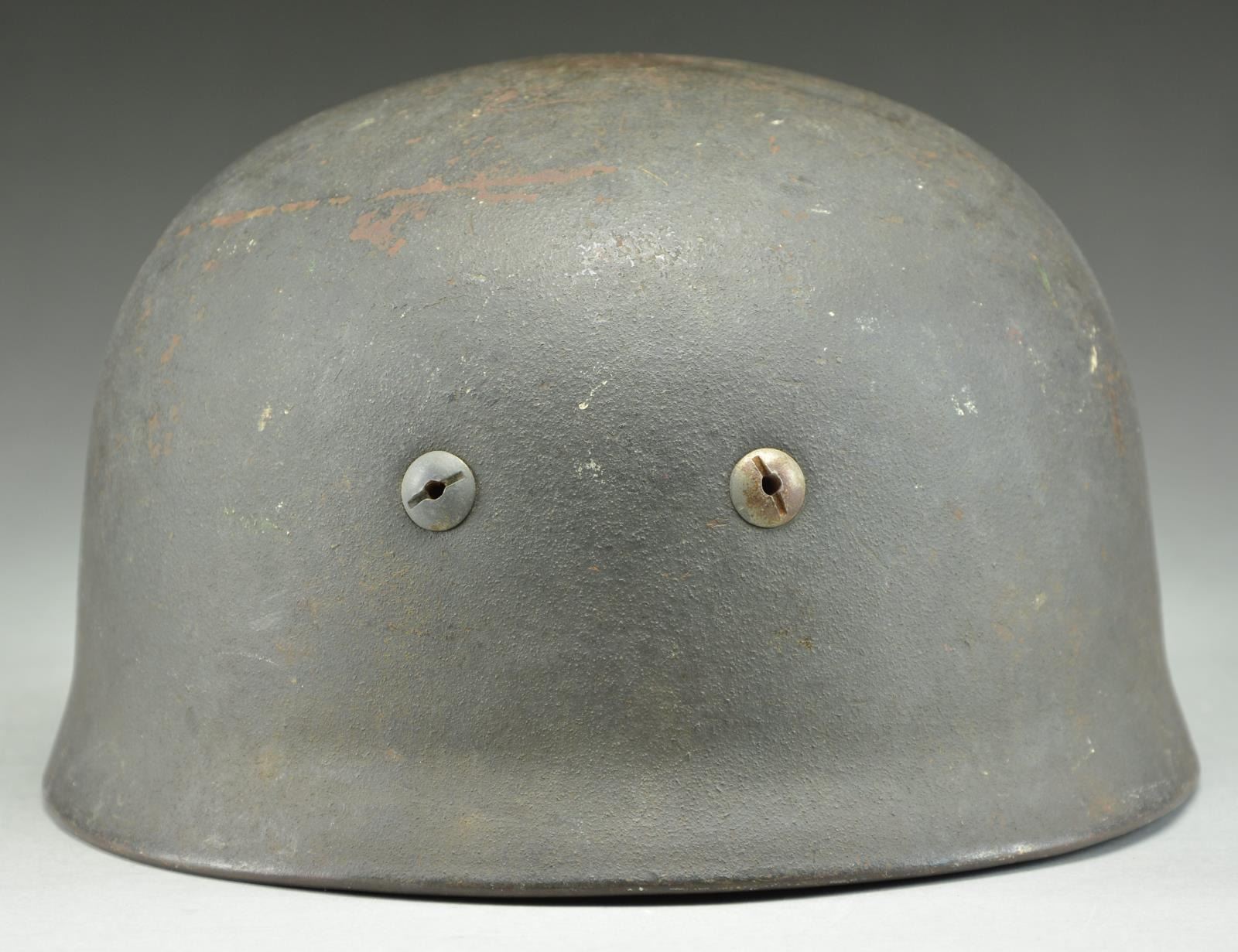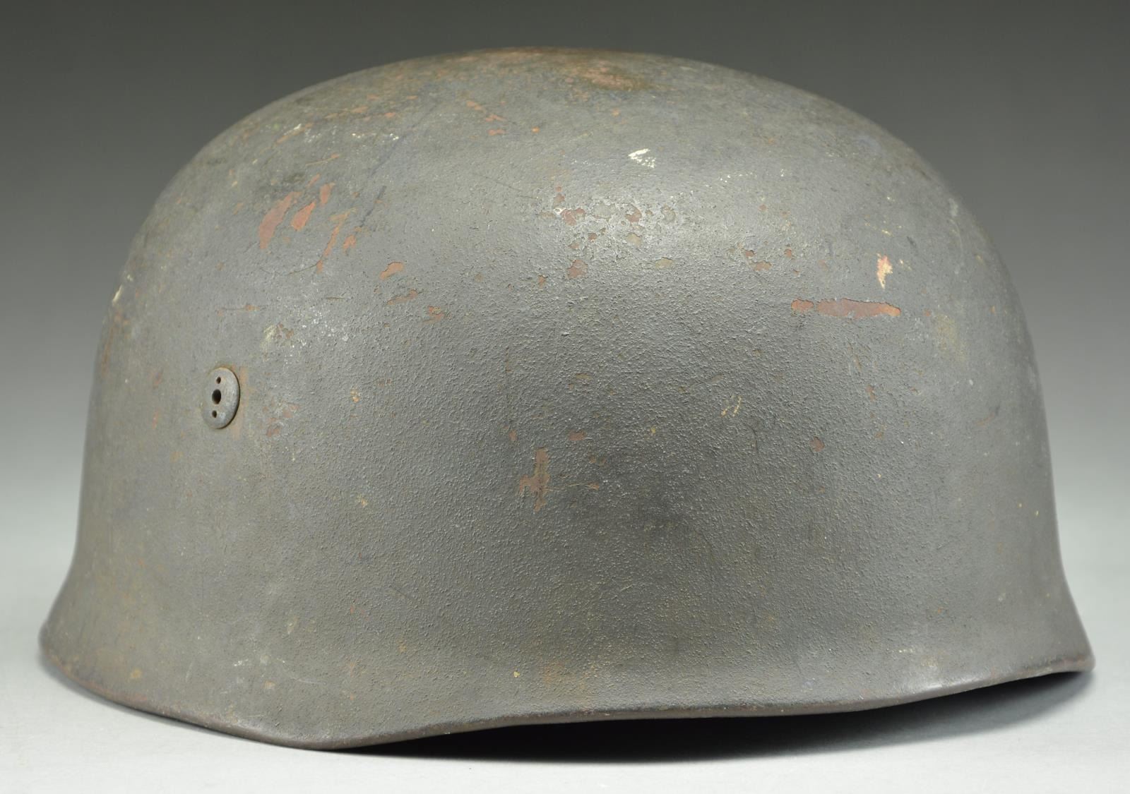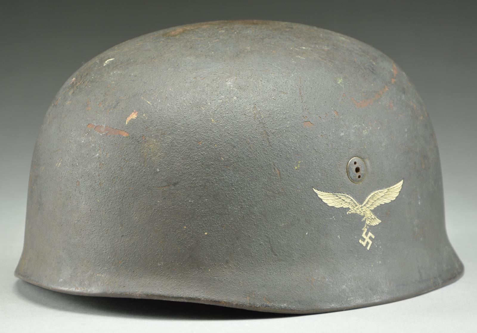 A fine original paratrooper helmet, as used by Fallschirmjager troops of the German Luftwaffe. This helmet appears to have been repainted a dark blue-green at the factory during WWII and has an original Luftwaffe decal on the left side. The helmet body is marked “ET71” on the inside left, but the batch number is difficult to read. The liner is completely original, as is the harness. The liner has worn Kopfweite & Stahlhelm marks, however, the “Gr.58” & “No.68” marks can be plainly seen. CONDITION: helmet finish is about 95%. Decal is also approx. 95%. Liner & harness show wear, but are undamaged. (02-18114-1/BF). $3,000-3,800.